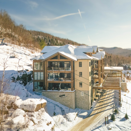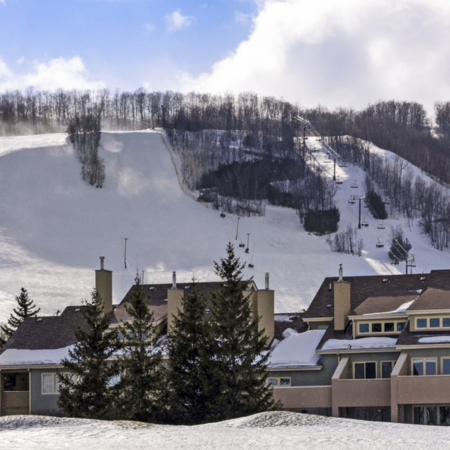 One of the highest elevations in Domaine de la Forêt. Enjoy prime ski-in/ski-out access right on the Chalumeau trail. Includes shared access to resort hot tubs, sauna, and fitness room.