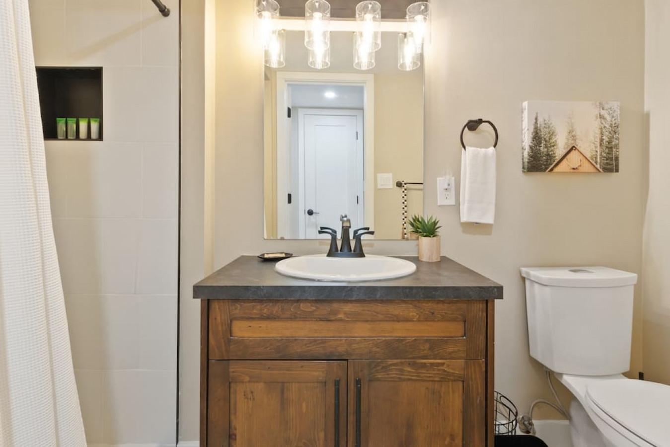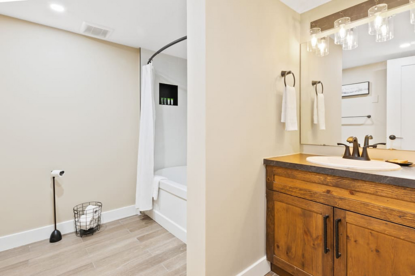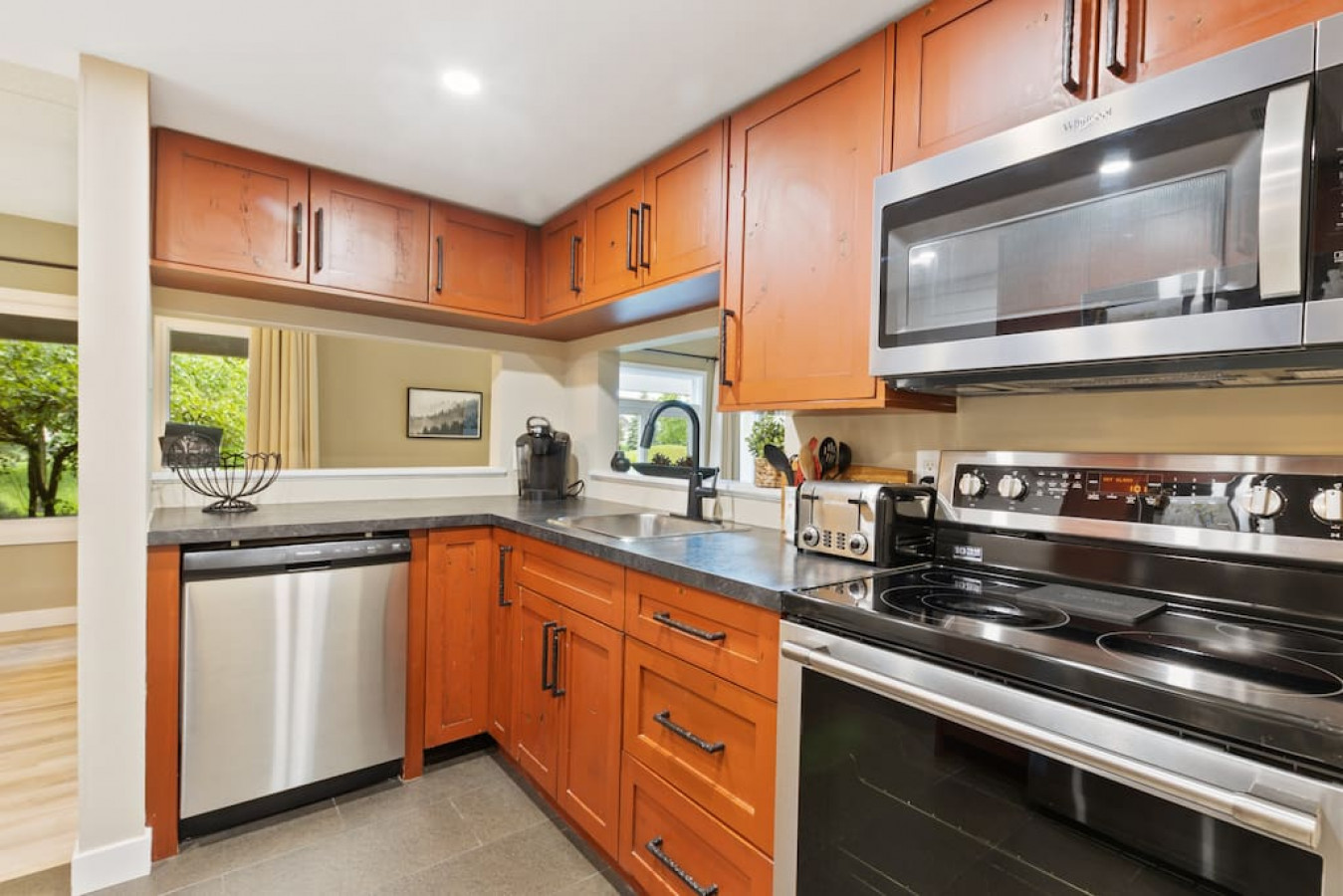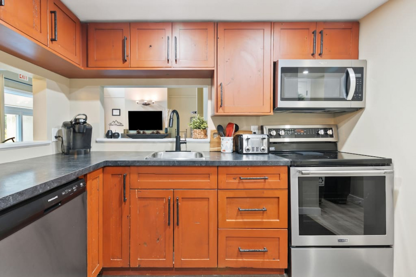 Our kitchen opens up to the great room so that you can cook and enjoy company. All of your cookware, bakeware, and utensils are provided. You’ll only have to bring your food, coffee, and spices. Appliances include a fridge, stove, microwave, coffee maker and dishwasher for easy cleanup.