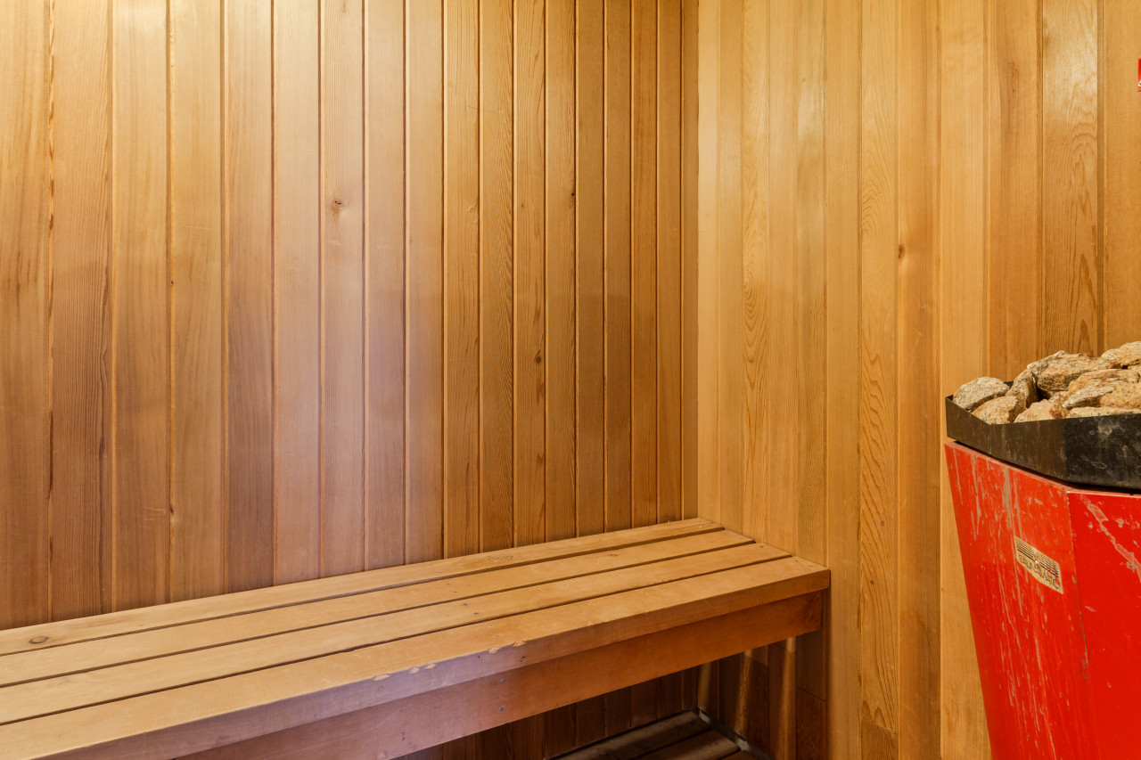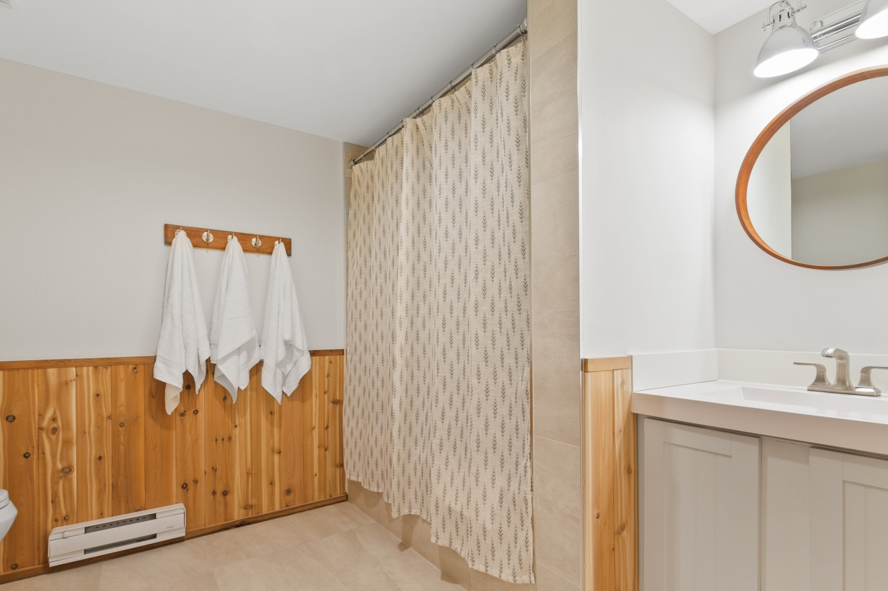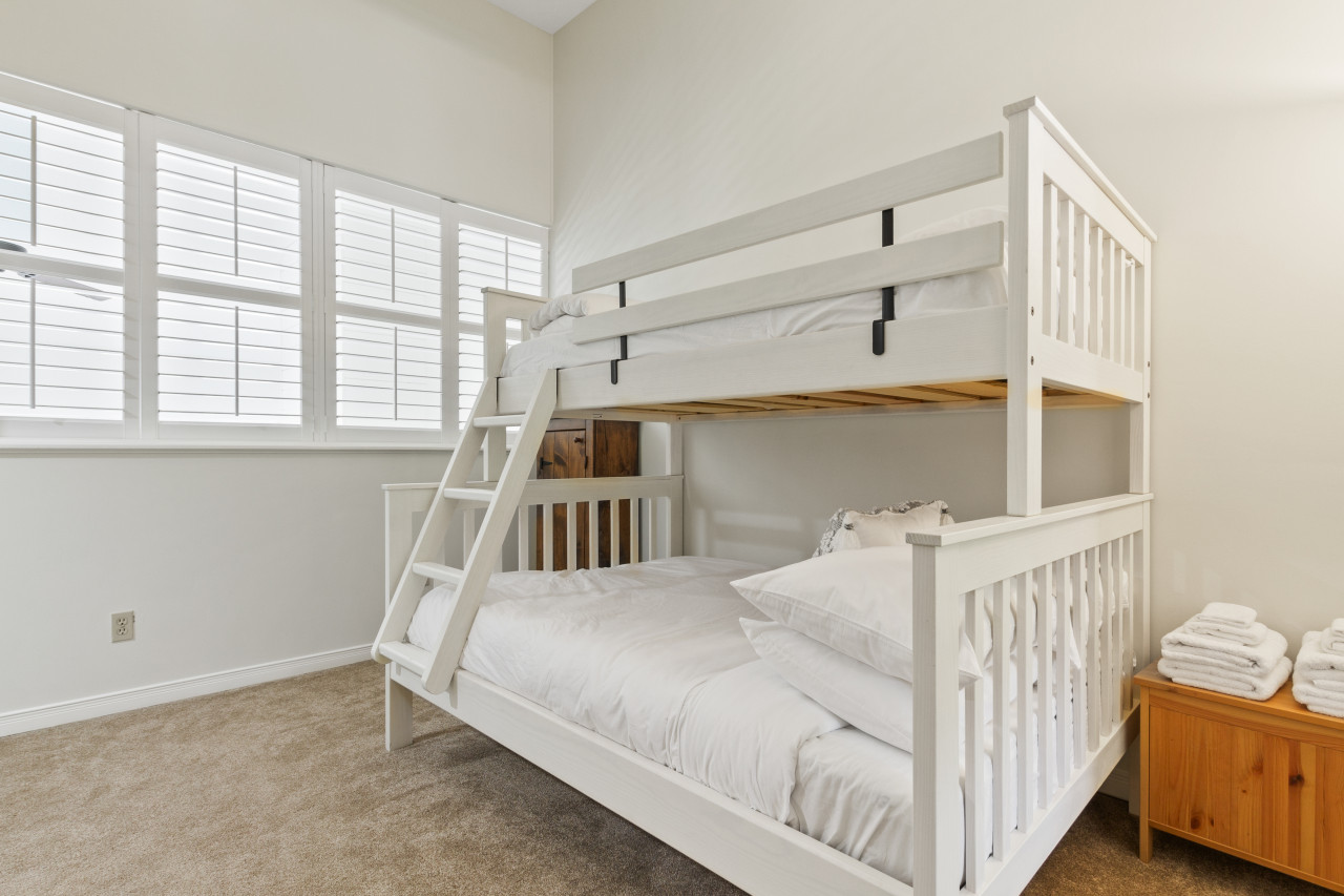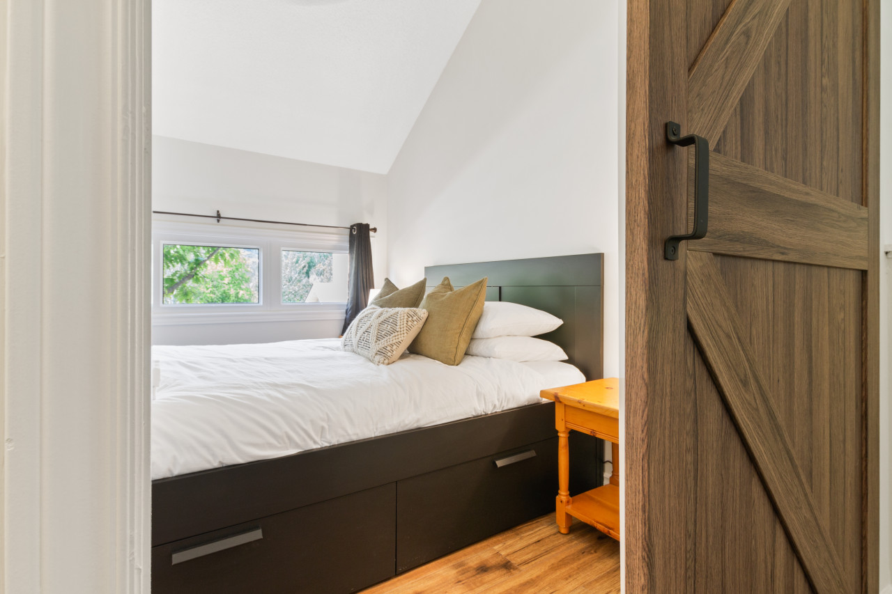You’ll find the primary suite on the main floor with a queen bed that features a sauna and a spacious 4-piece ensuite. The second bedroom features a double and single bed with main floor bathroom access to the recently upgraded 3-piece bath. Upstairs, you’ll find the loft-converted bedroom with a single over double bunk bed and California shutters overlooking the living room for privacy. Through the sliding barn door, guests can access another private loft bedroom with a queen bed and mountainside views. All bedrooms include comfortable bedding for a restful night of relaxation.