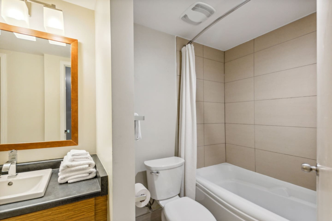 Our home can accommodate 4 guests. The primary bedroom has a double size bed and there is one full bathroom with a shower-in-tub. The living area has a double size sofa bed for additional sleeping space.