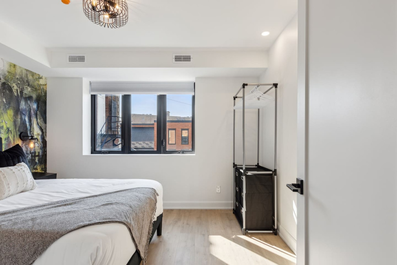 In the bedroom, there is a comfortable queen size bed and a clothing rack with hangers. The closet has an iron and ironing board.