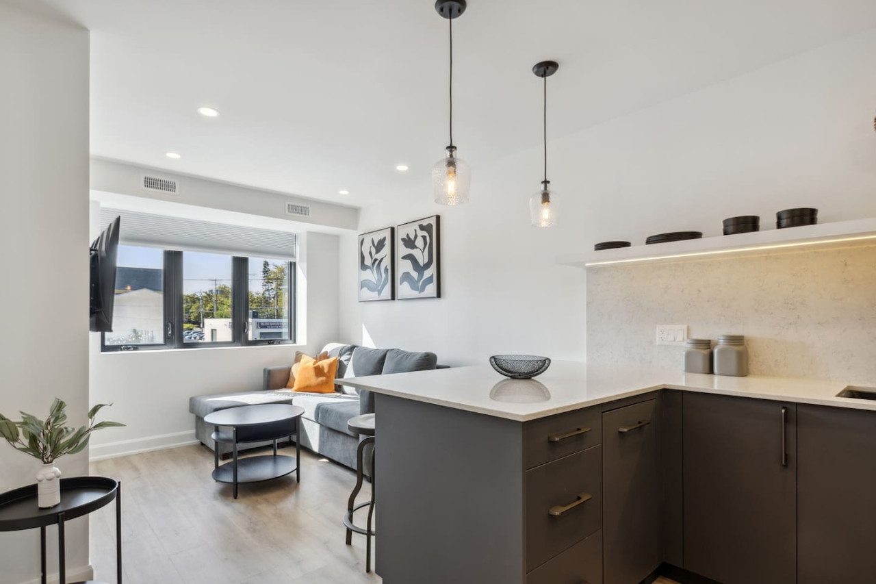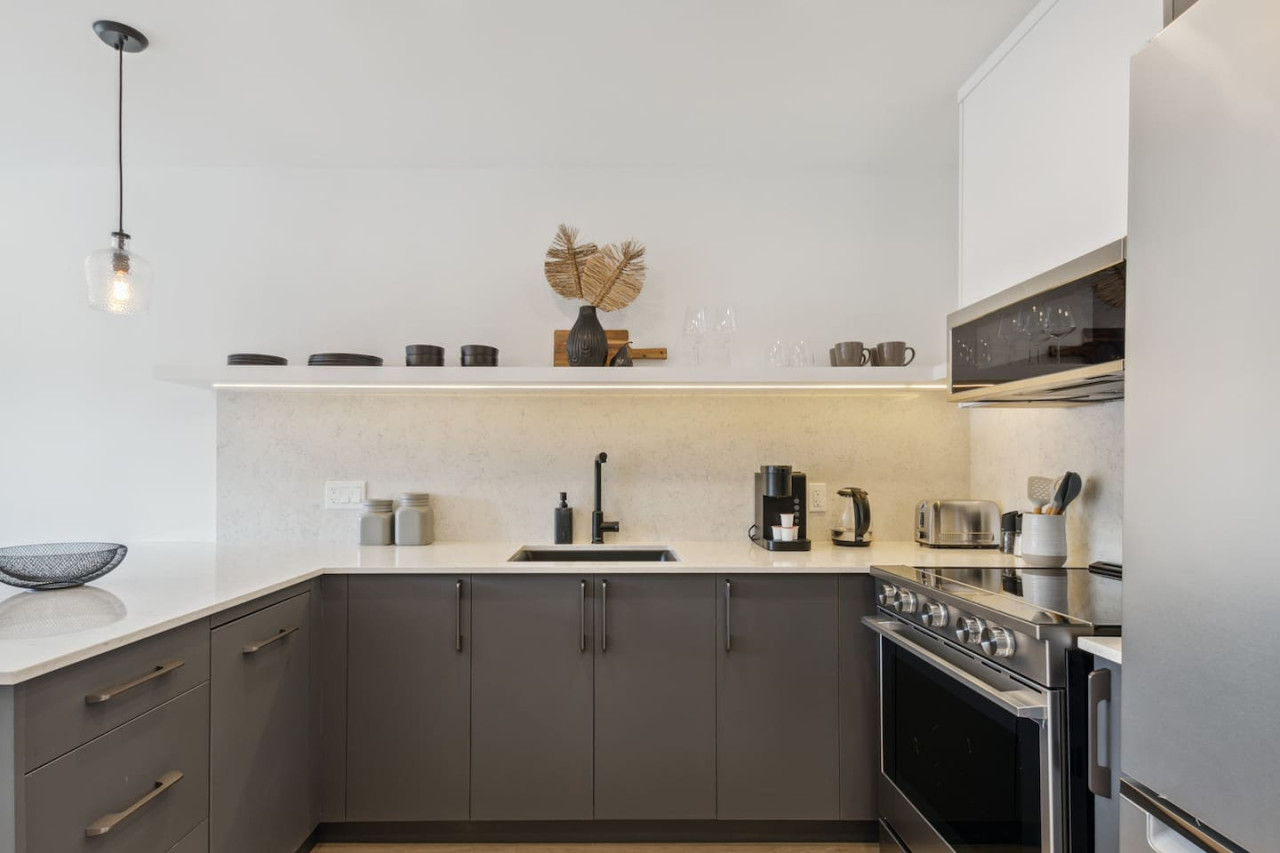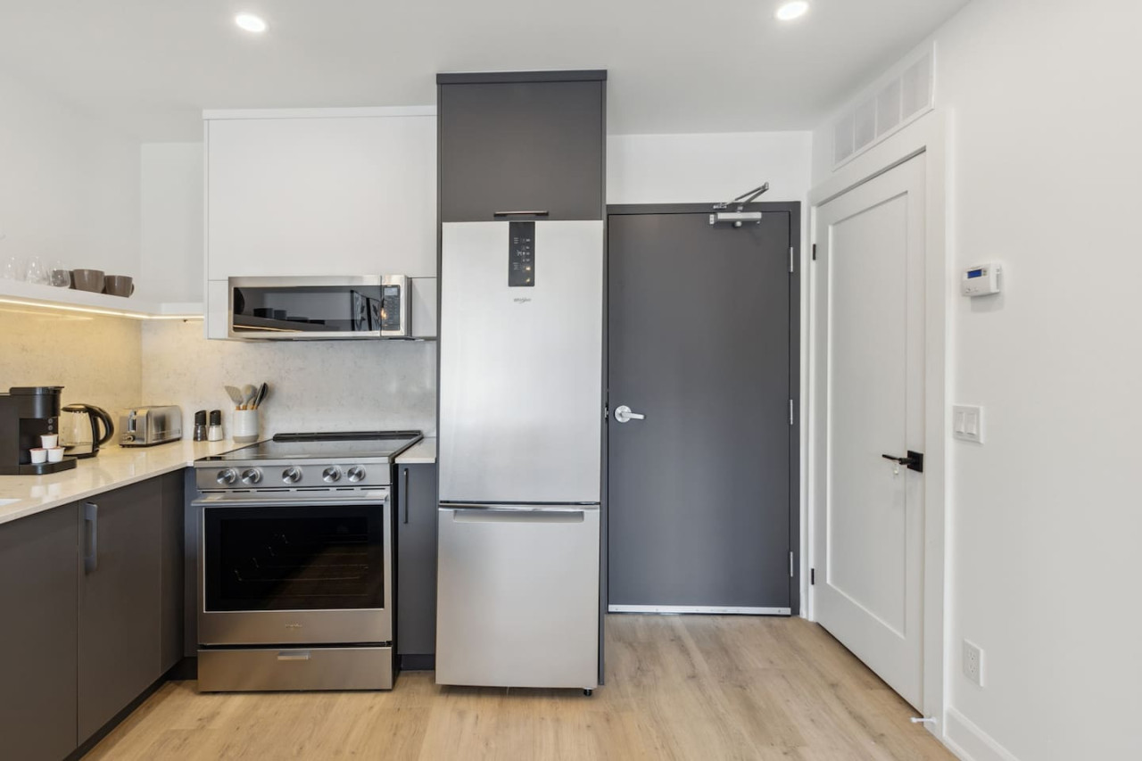 As you step inside, you'll be welcomed by the open-concept kitchen and living area. The cozy living space includes a couch facing the Roku smart TV and views of Collingwood’s lively Caesar Bar - one of our favourite spots! The kitchen is fully equipped for evenings when you're not dining at one of Collingwood's awesome restaurants. You'll find cookware, bakeware, cutlery, and a Keurig coffee maker ready for use - just bring your food, coffee pods, and spices/oils! Essentials like garbage bags, paper towels, dish soap, and towels are also provided.