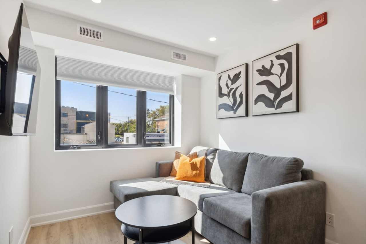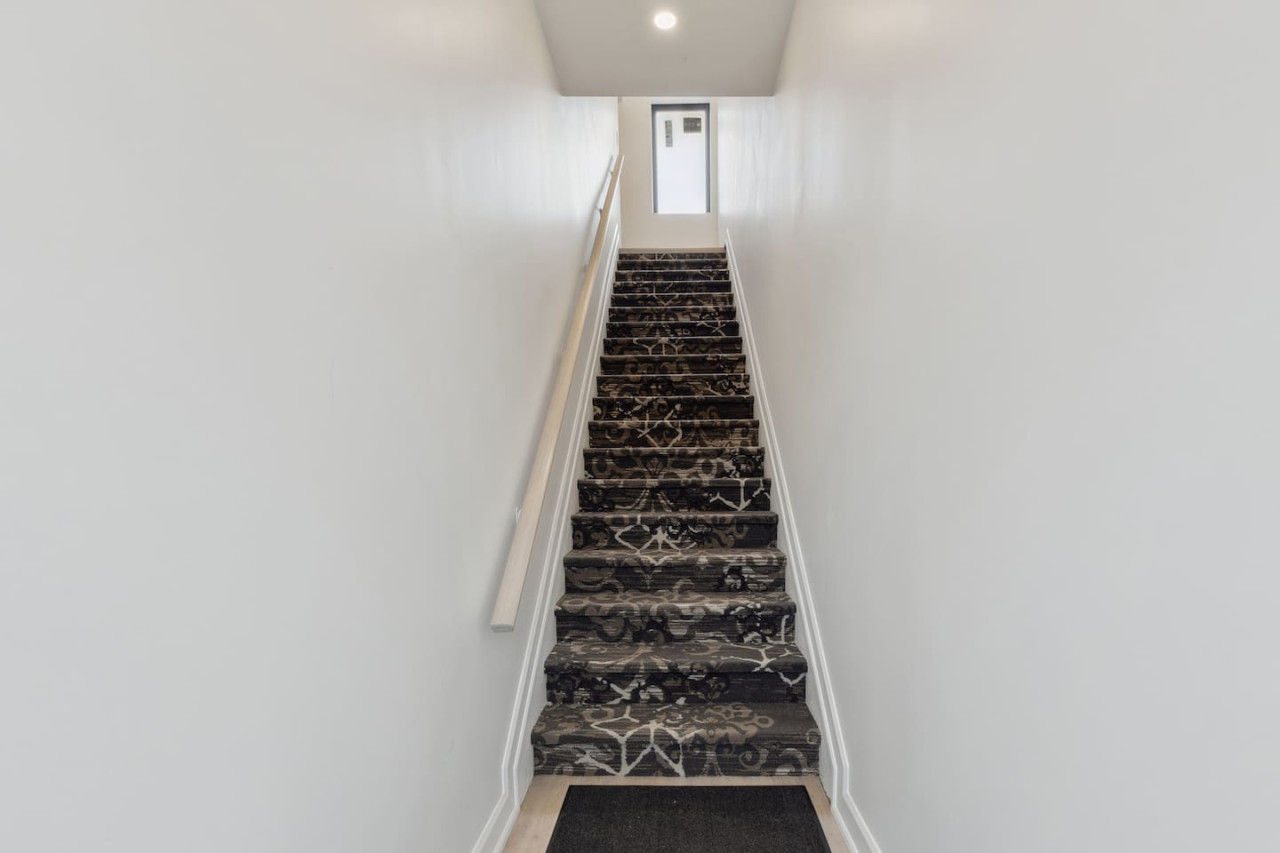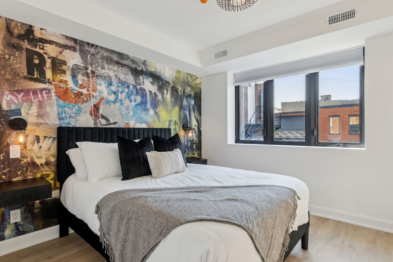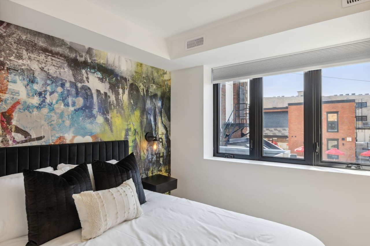 As you step inside, you'll be welcomed by the open-concept kitchen and living area. The cozy living space includes a couch facing the Roku smart TV and views of Collingwood’s lively Caesar Bar - one of our favourite spots! The kitchen is fully equipped for evenings when you're not dining at one of Collingwood's awesome restaurants. You'll find cookware, bakeware, cutlery, and a Keurig coffee maker ready for use - just bring your food, coffee pods, and spices/oils! Essentials like garbage bags, paper towels, dish soap, and towels are also provided.