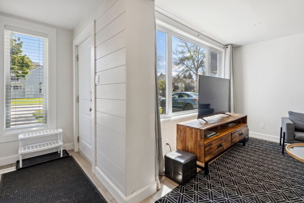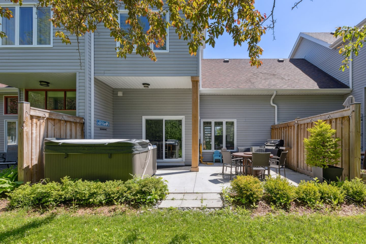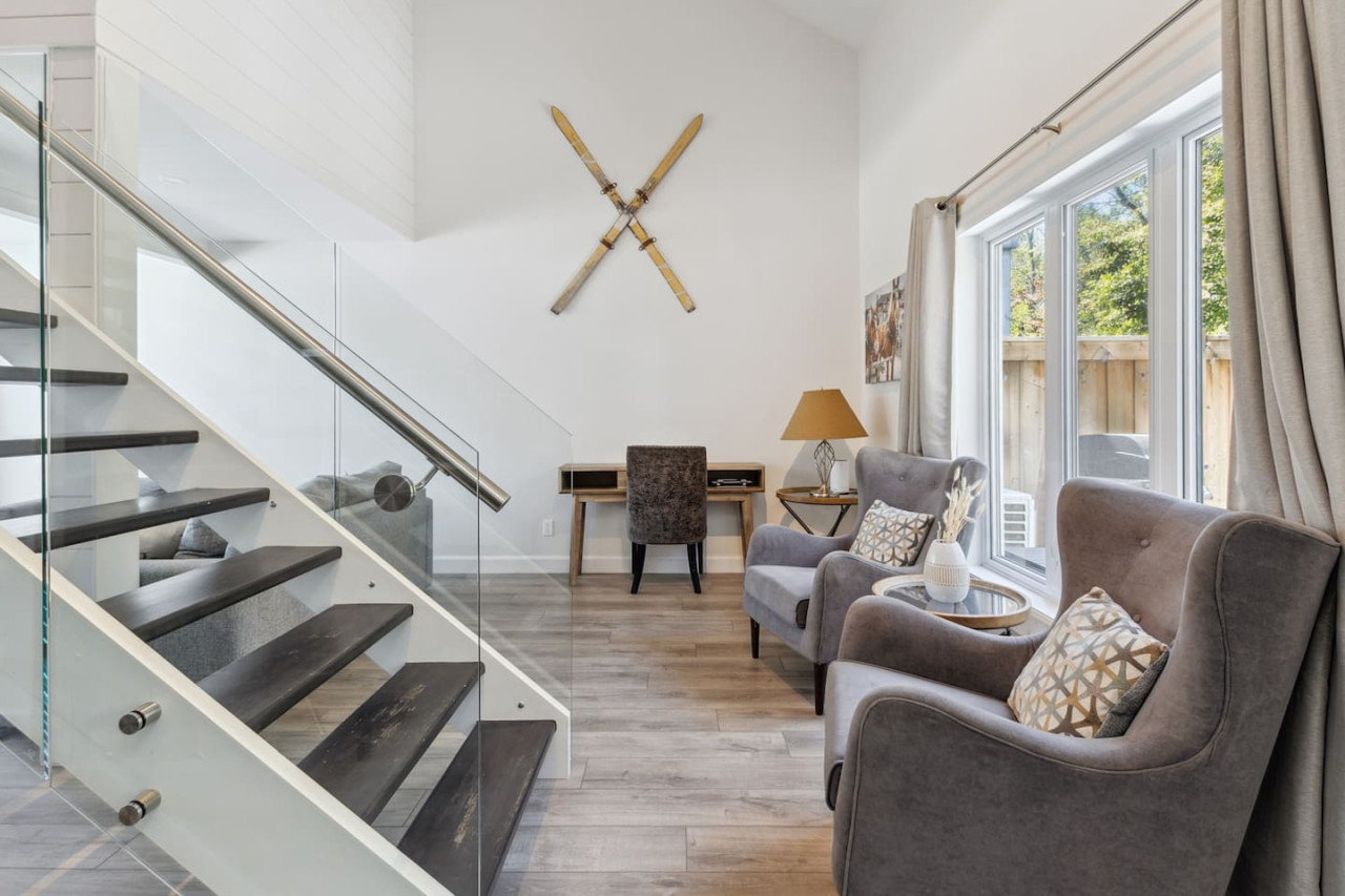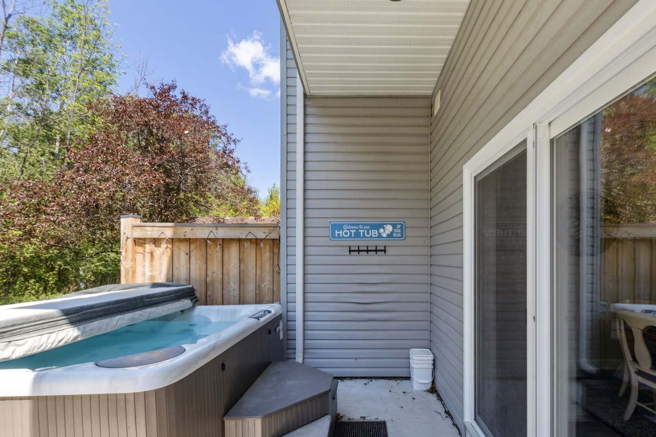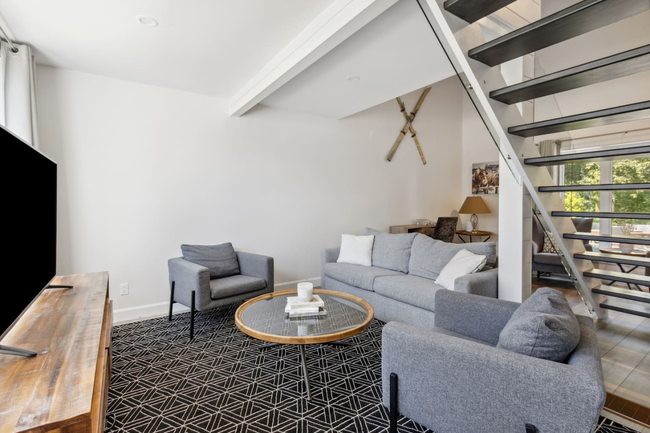 The living area features a couch and 2 chairs surrounding a Roku Smart TV. The large windows provide bright natural light. Sliding glass doors provide easy access to the private patio with outdoor dining space, a BBQ, and the hot tub.