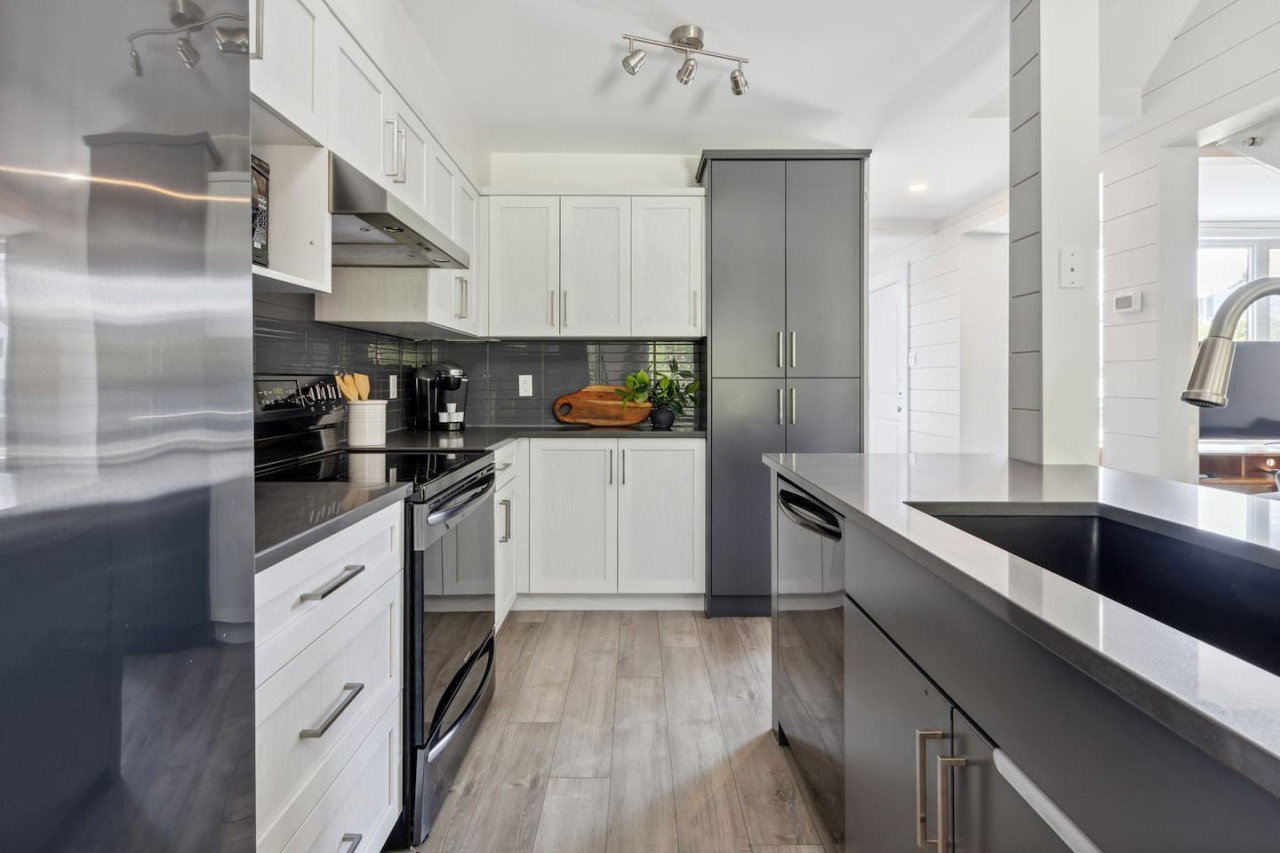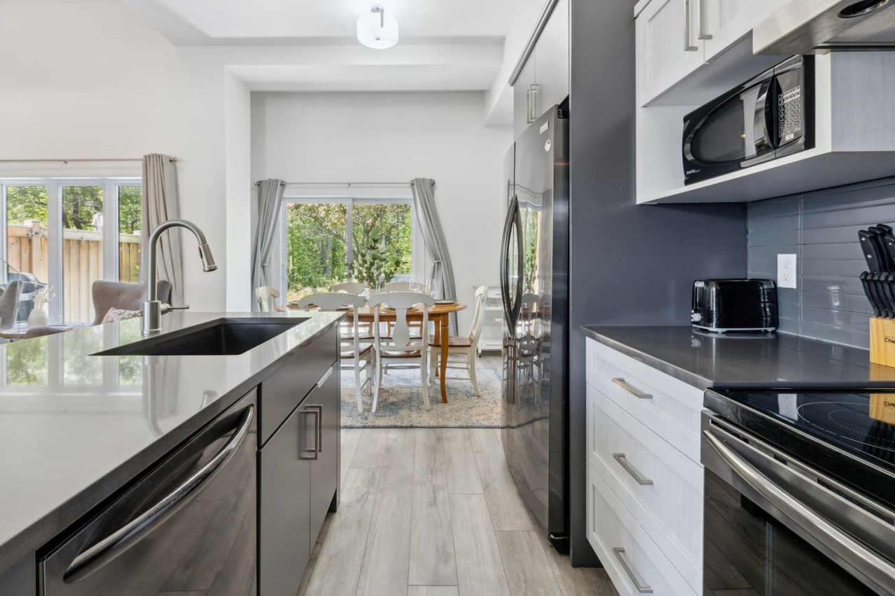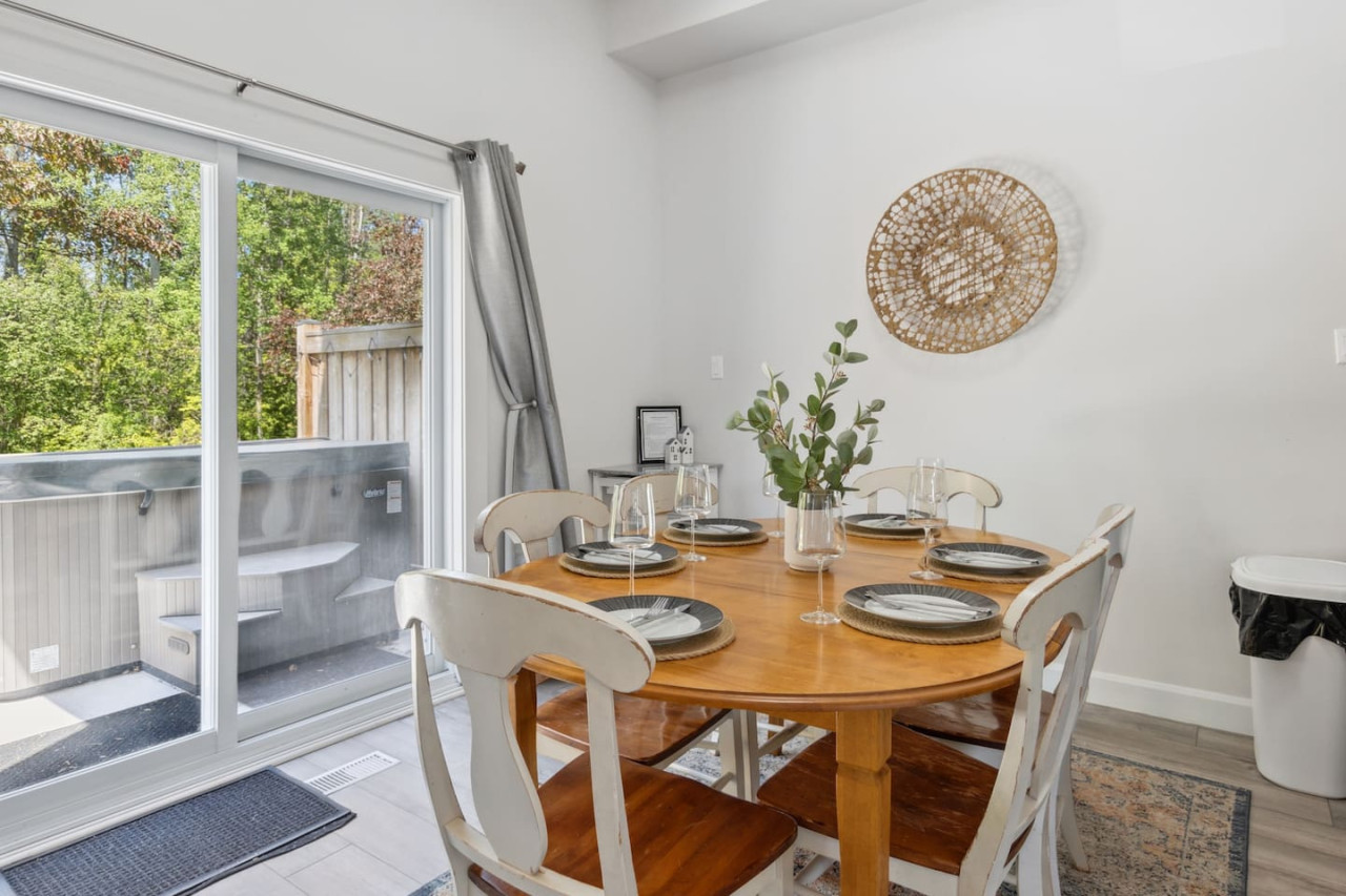 The modern and spacious kitchen is equipped with appliances and cooking basics, convenient for when you're not dining at one of the popular local restaurants. Enjoy your meals in the connected dining area or on the patio. This home includes cookware, bakeware, cutlery, utensils, Keurig+drip coffee maker, and BBQ tools; just bring your food and spices!