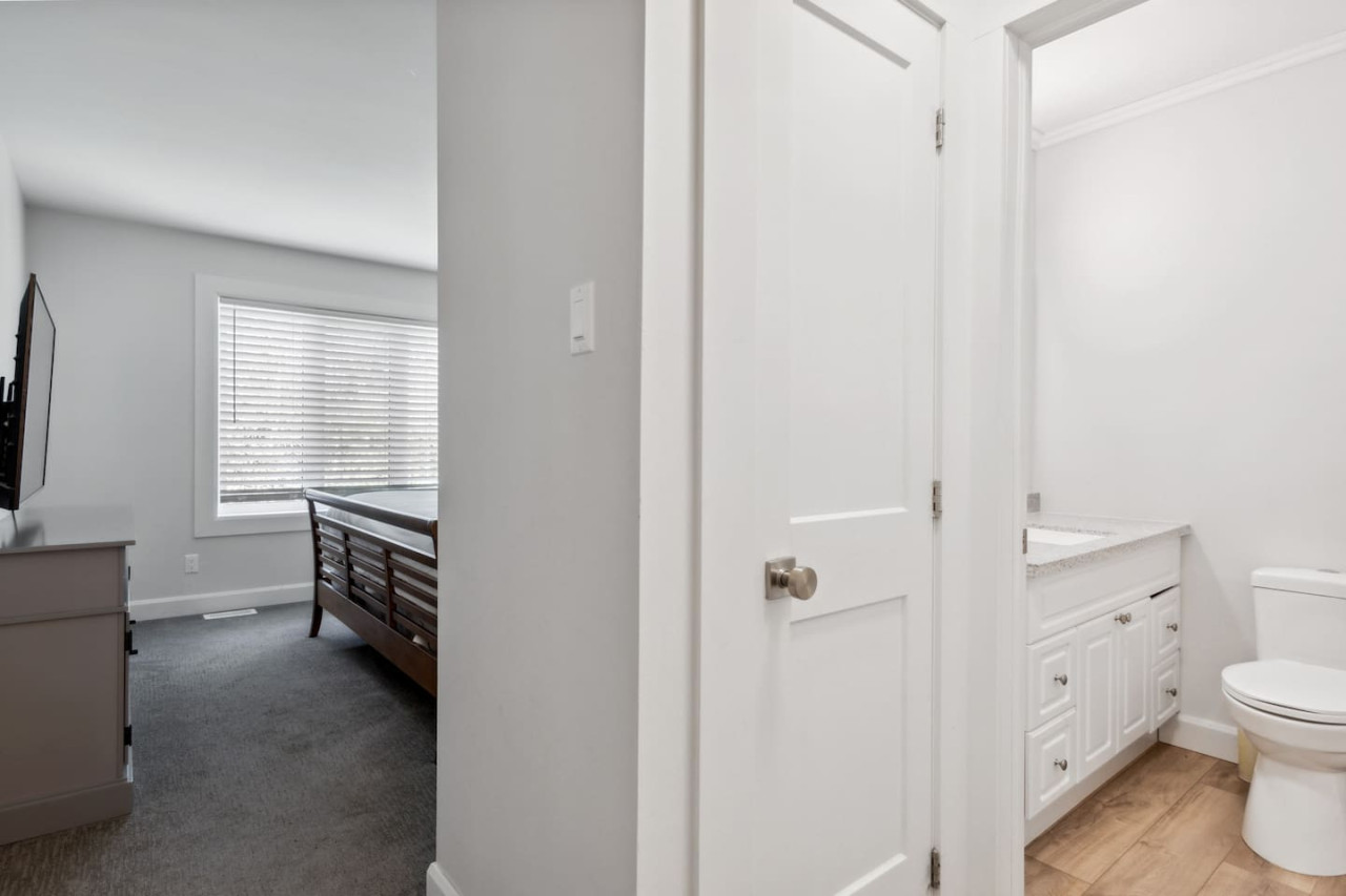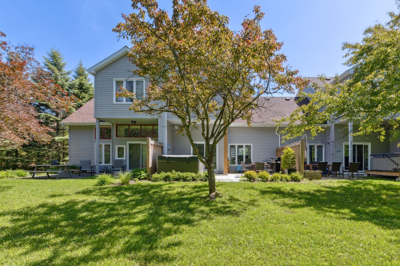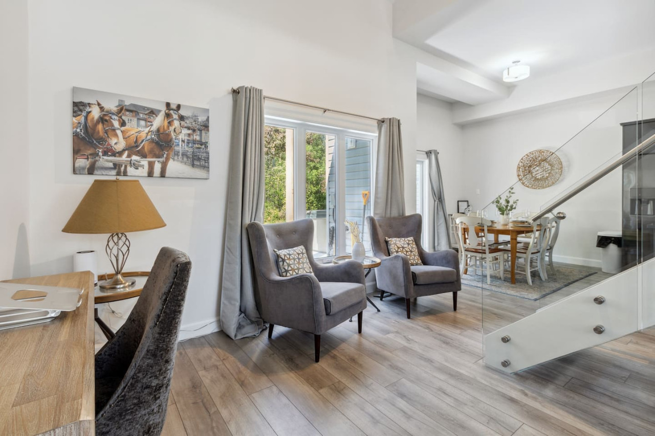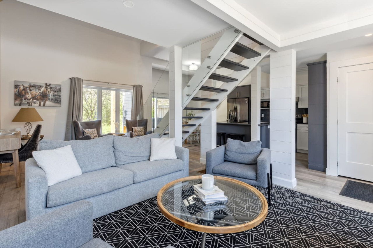 Featuring 3 bedrooms and 2.5 bathrooms. Bedroom #1 offers a King bed and private ensuite bathroom. Bedroom #2 has a Queen size bed facing a Smart TV. Bedroom #3 includes a single over double bunk bed, and the couch in the living area can pull out to a double sofa bed as required. Both full bathrooms in this home are on the second level, and the half bathroom can be found on the main level.