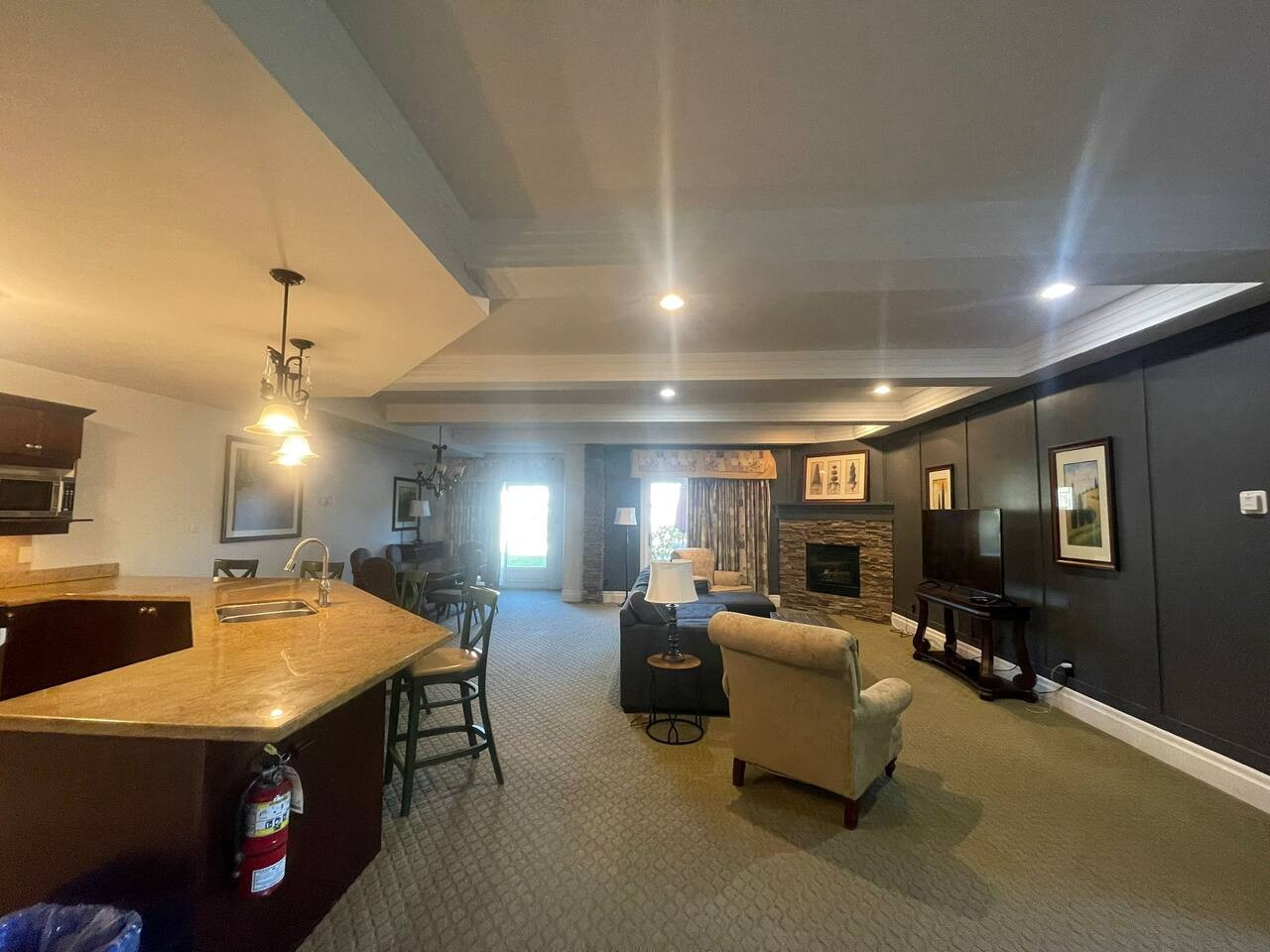 The living area invites you in with the large sectional couch facing the Smart TV with cable. On warm nights you can curl up by the gas fireplace. Sliding glass doors lead out to the private patio.