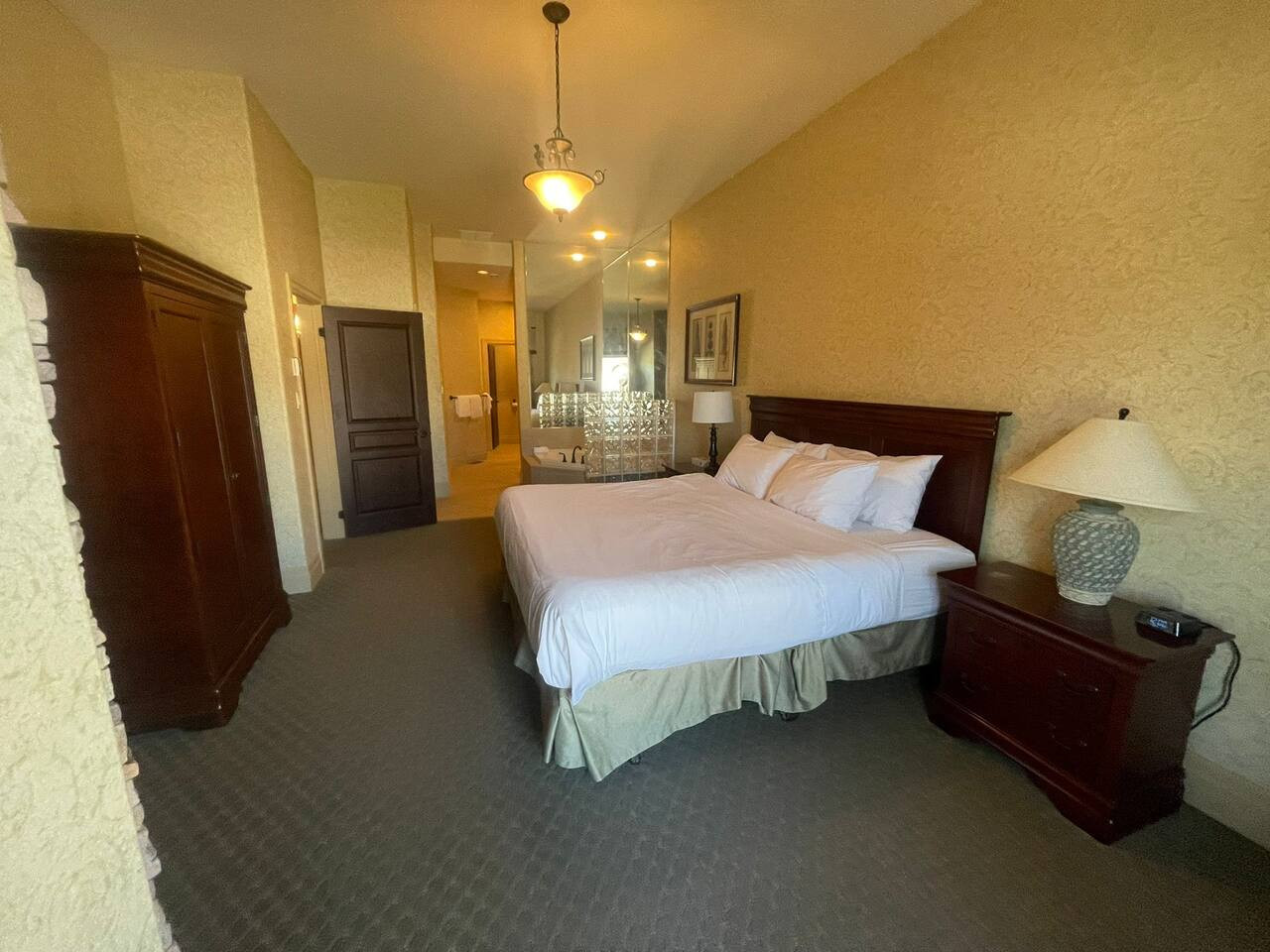 Bedroom 1 (upstairs): King bed with ensuite bathroom, TV, gas fireplace, and balcony
