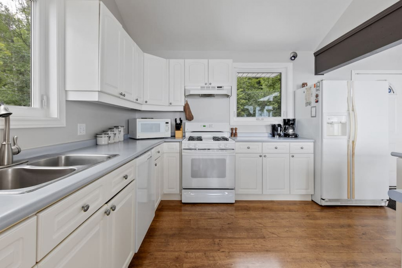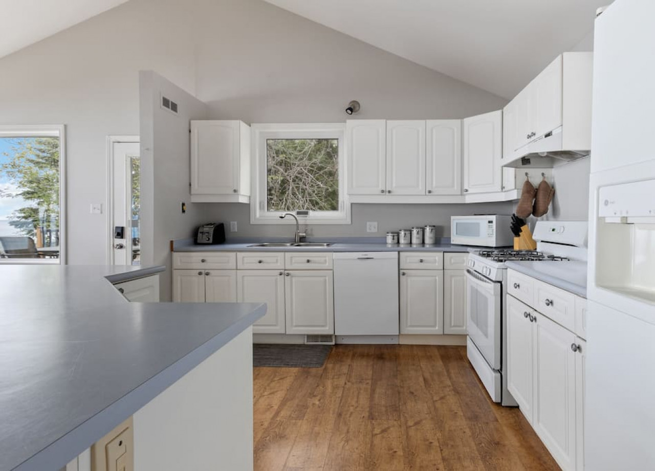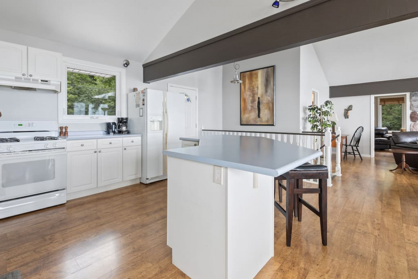 As you step into this inviting home, you'll be greeted by an open-concept living area that exudes warmth and comfort. The oversized living space features cathedral ceilings. The spacious dining area overlooks the water, the perfect compliment to dinner conversations. The well-equipped kitchen boasts ample cabinets, counter space, and a convenient breakfast bar that opens seamlessly to the living and dining areas.