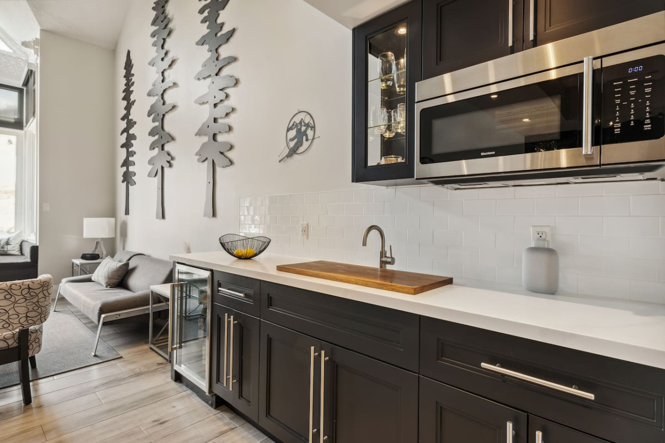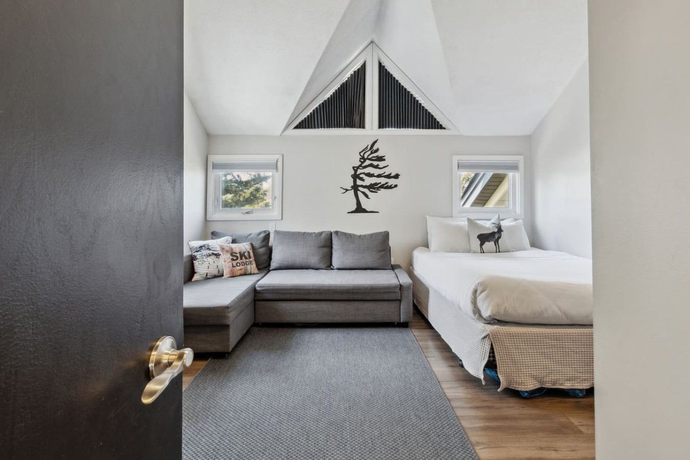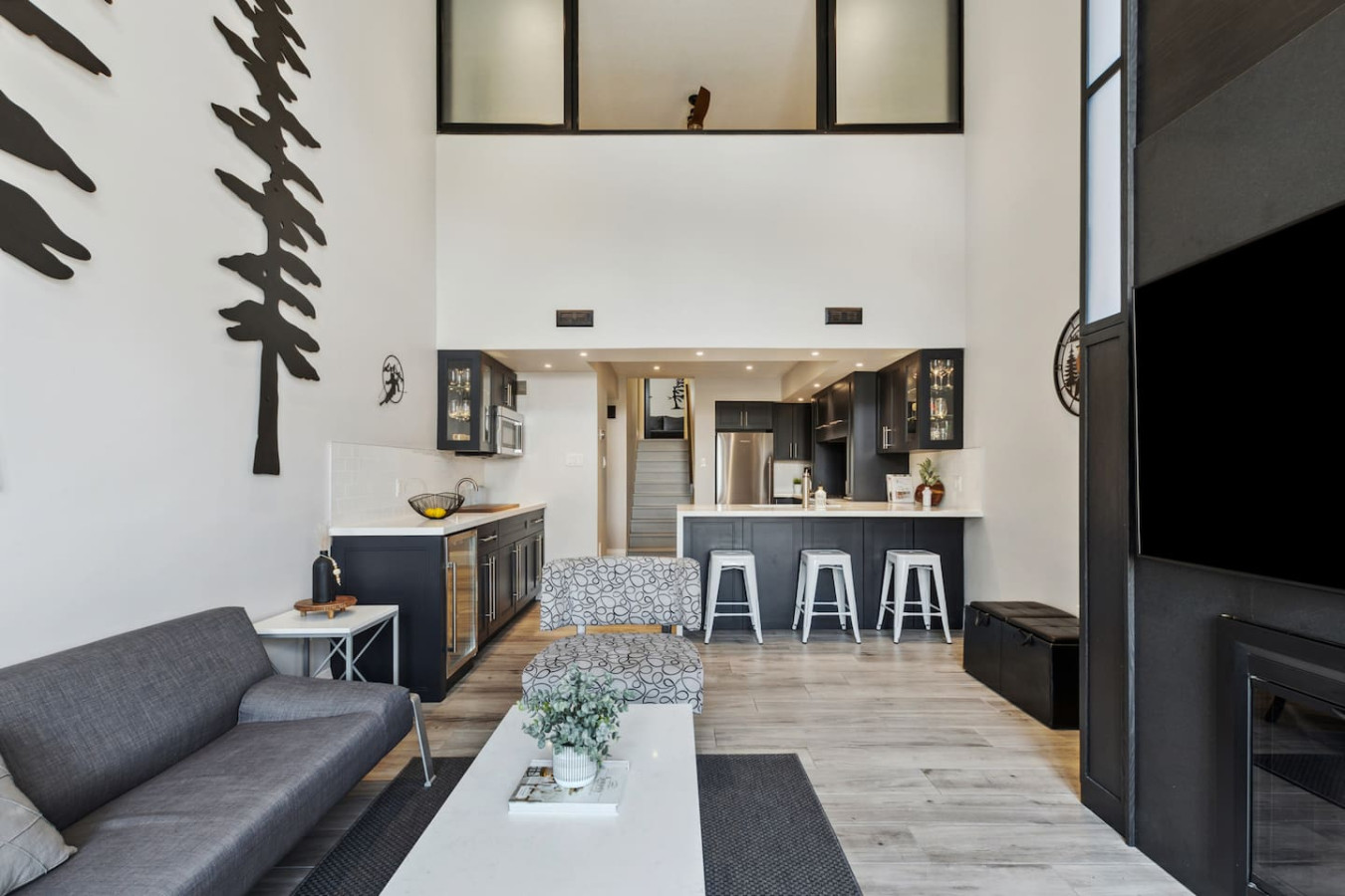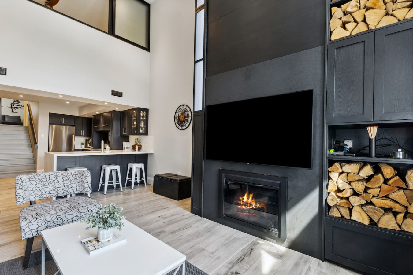 Kick back in the cozy living area, where soaring cathedral ceilings and large windows frame beautiful mountain views. Gather around the wood-burning fireplace or catch a movie on the Smart TV after a full day of exploring.