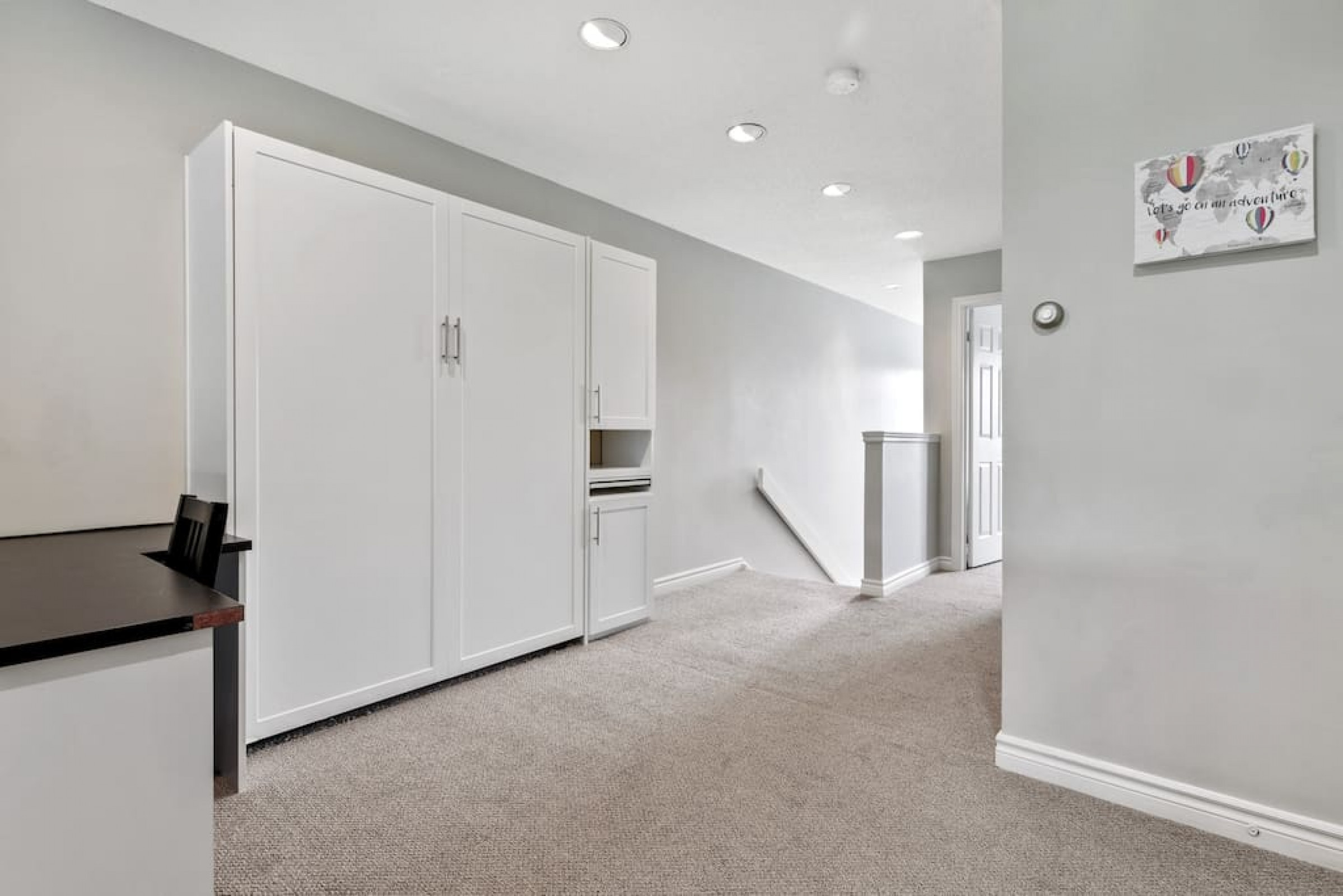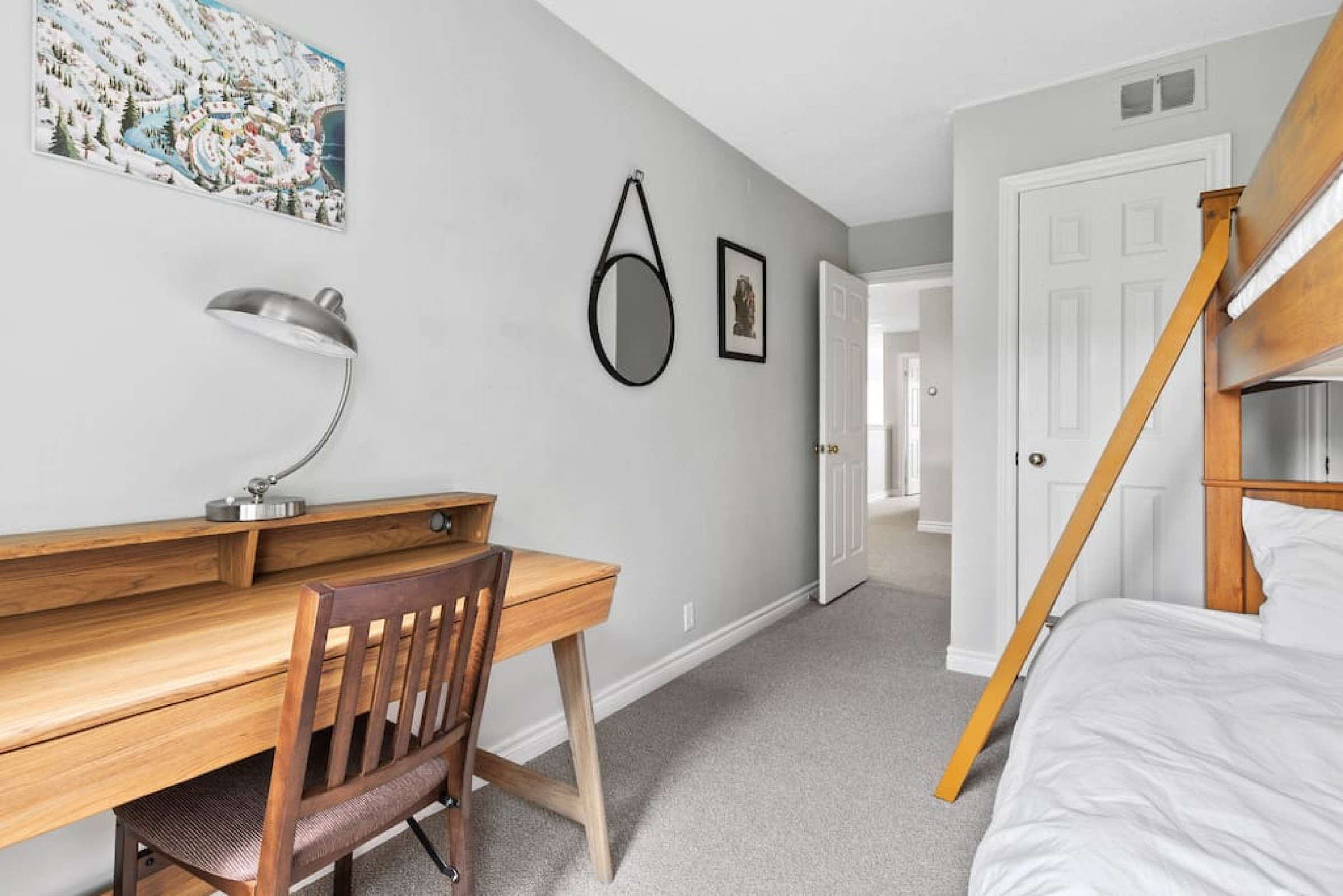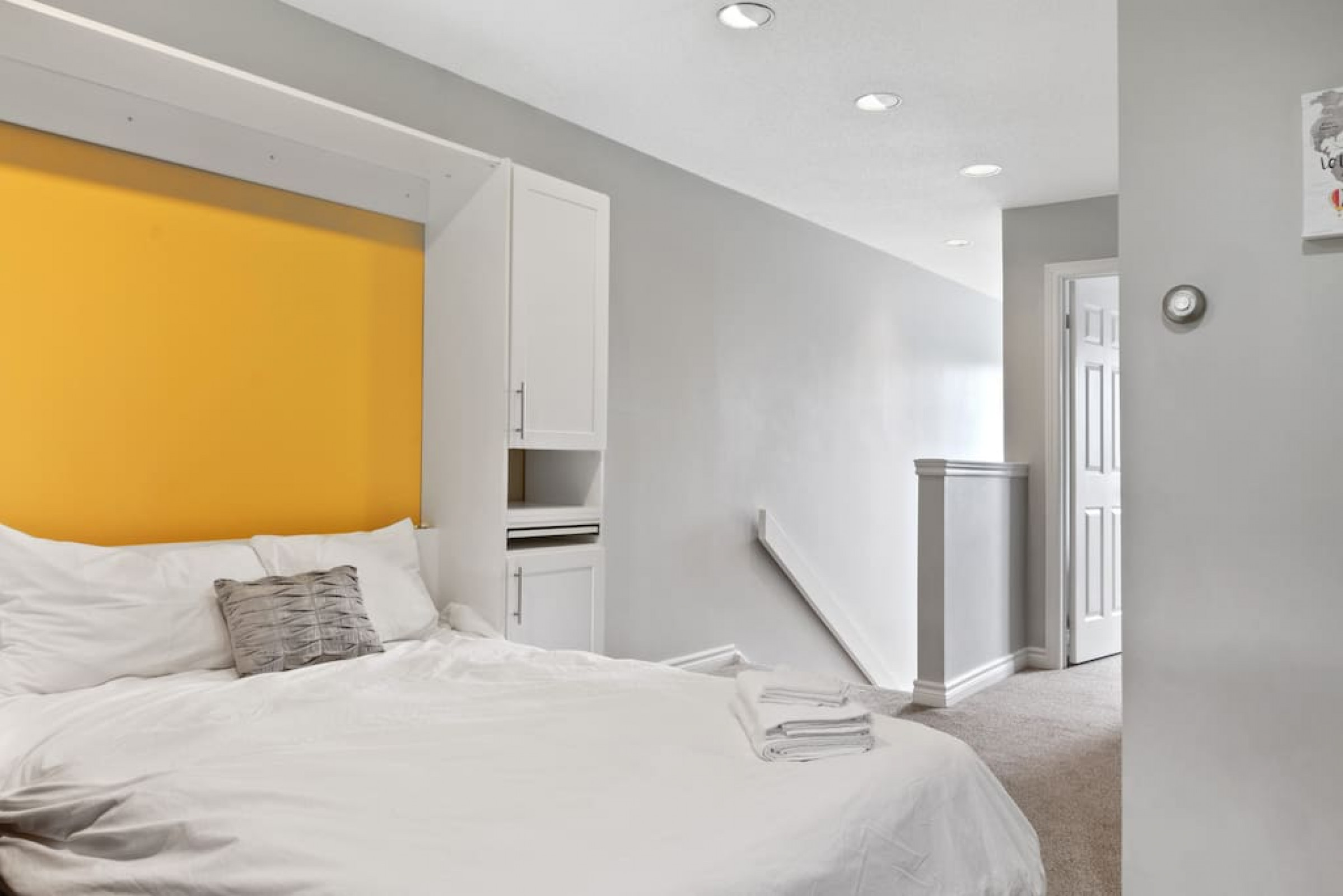 This home features three spacious bedrooms. The first bedroom has a Queen bed. The second bedroom has a King bed, along with a desk workstation and an ensuite bathroom. The third bedroom has a Single-over-Double Bunk bed and a desk workstation. The top level features a full size Murphy bed, storage and a desk workstation. All linens, pillows, and towels are included in your stay!
