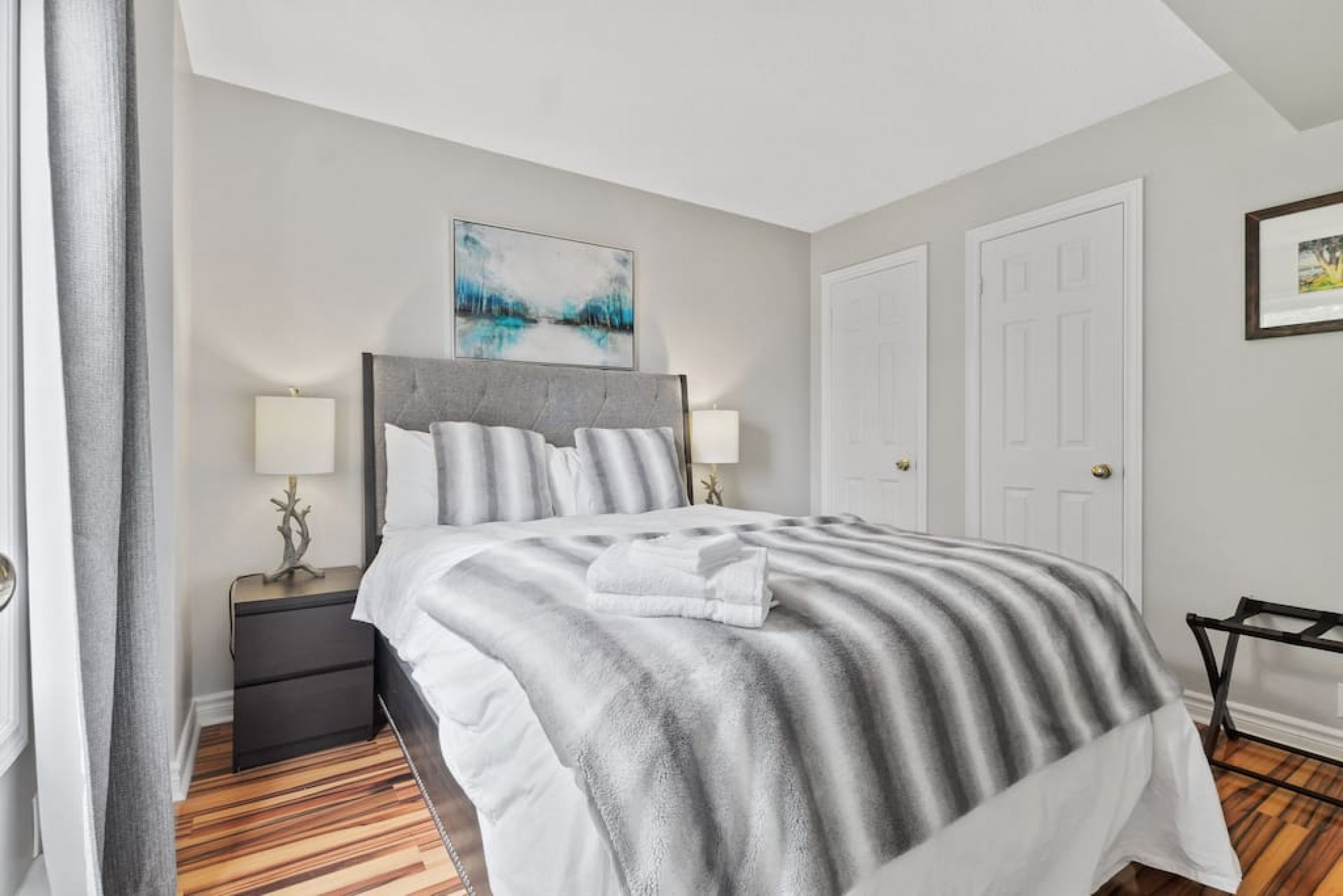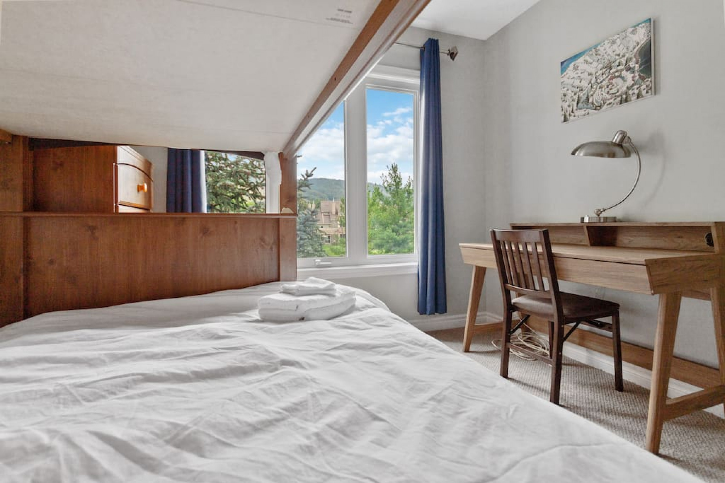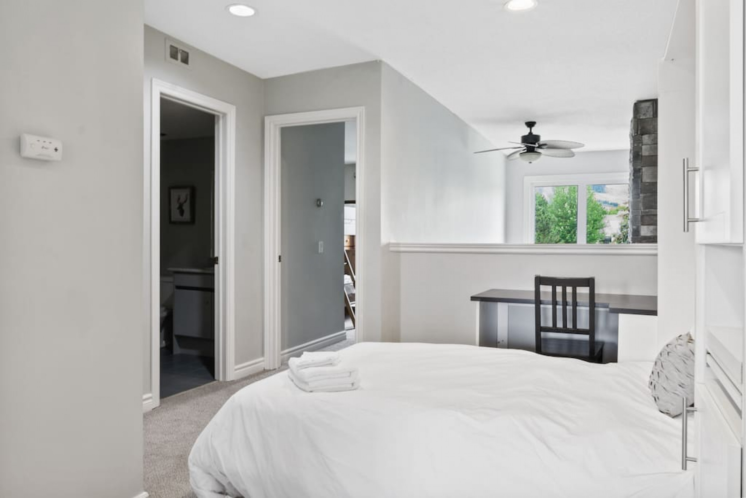 This home features three spacious bedrooms. The first bedroom has a Queen bed. The second bedroom has a King bed, along with a desk workstation and an ensuite bathroom. The third bedroom has a Single-over-Double Bunk bed and a desk workstation. The top level features a full size Murphy bed, storage and a desk workstation. All linens, pillows, and towels are included in your stay!