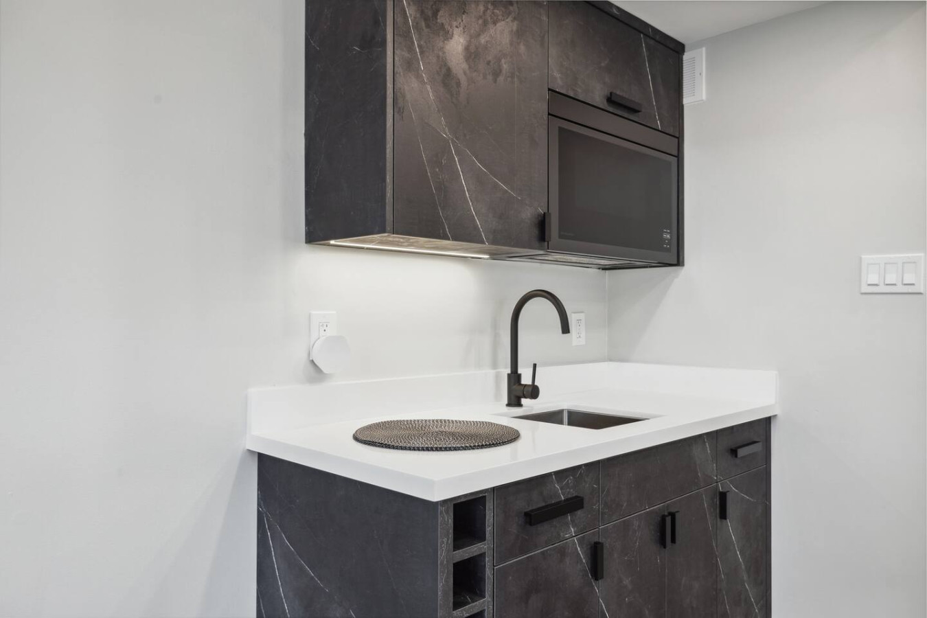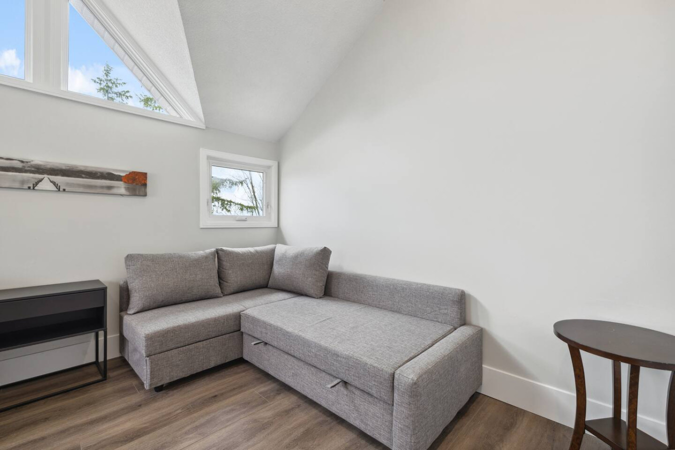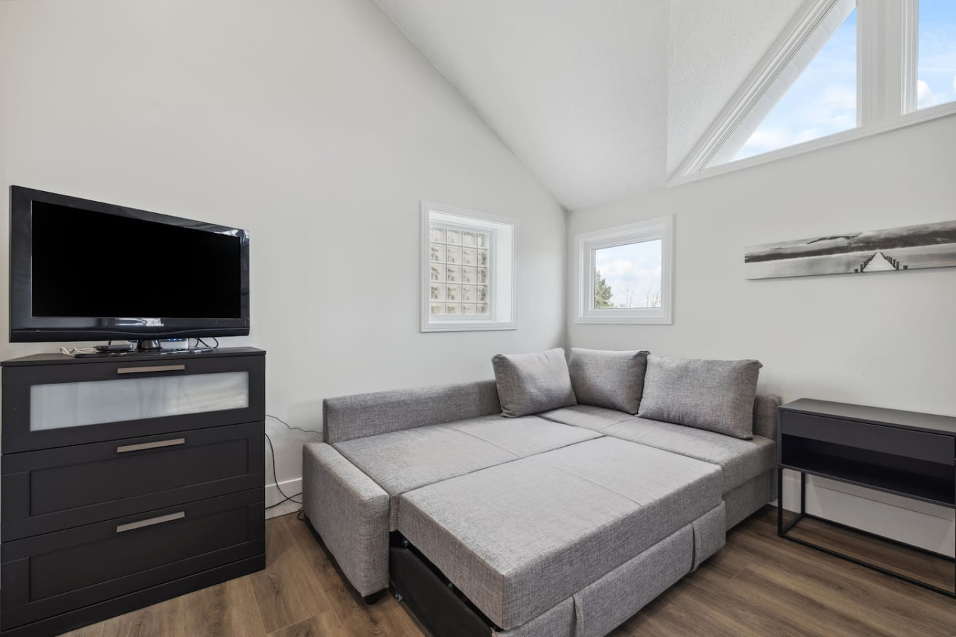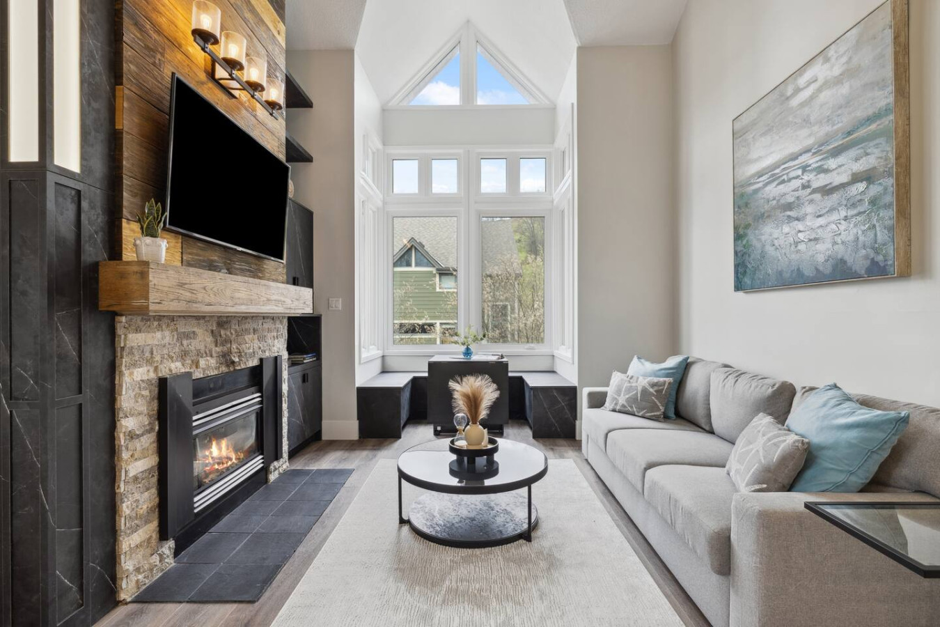 Unwind in the living area, including impressive cathedral ceilings and large windows facing the mountain which flood the unit with natural light. Couches surround the electric fireplace and Smart TV for nights after a day of adventure.