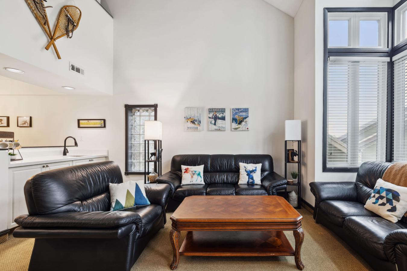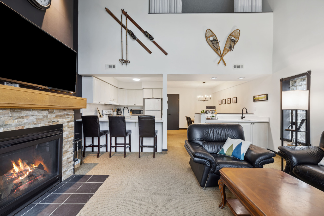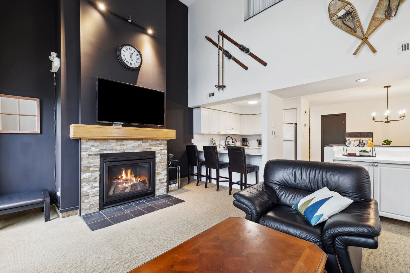 Unwind in the living area, where impressive cathedral ceilings with large windows offer mountain views. Seating surrounds the gas fireplace and Smart TV for nights after a day of adventure.