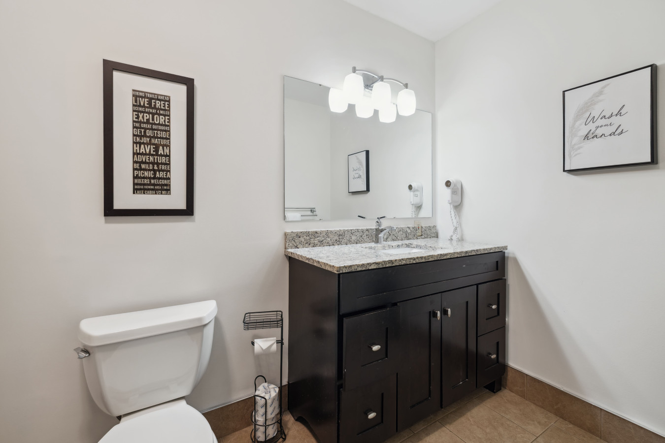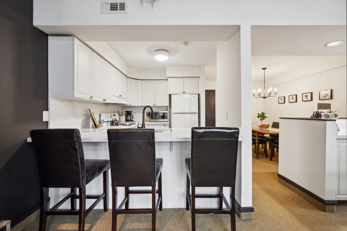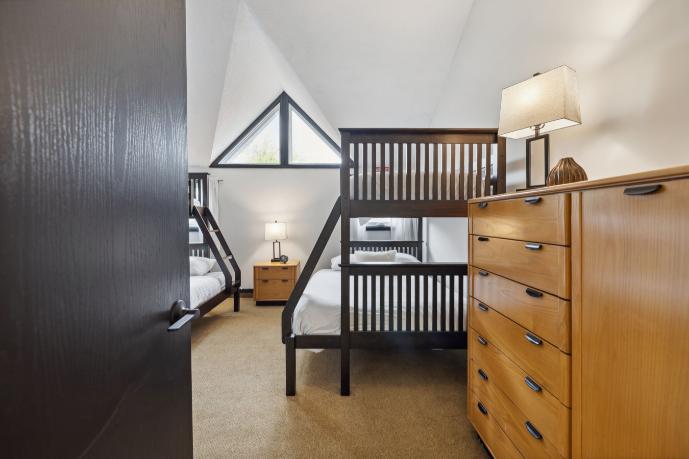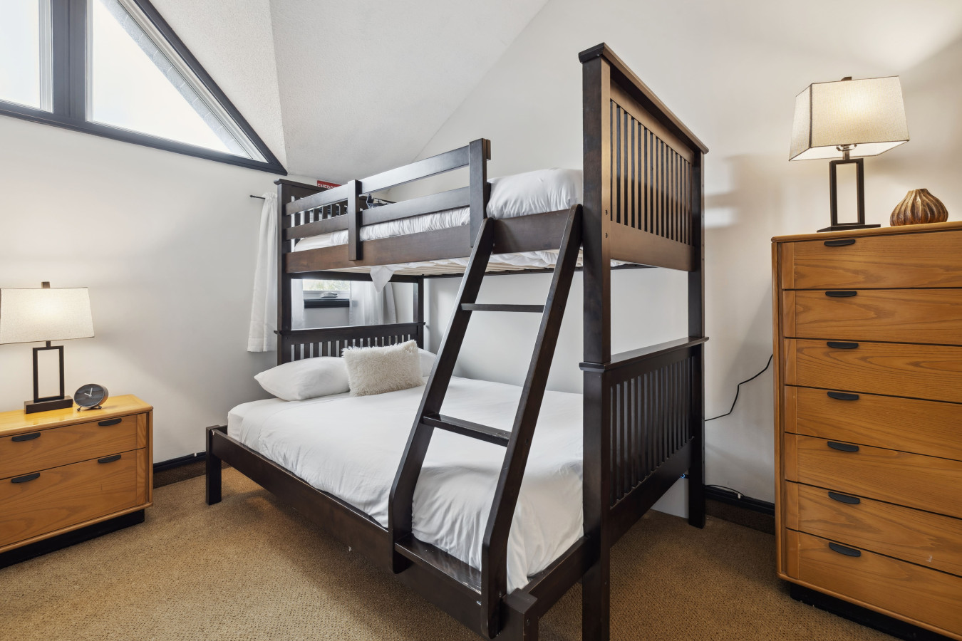 There are 2 bedrooms in this condo, both on the second floor. Bedroom 1 features one double size bed and a full ensuite bathroom, and bedroom 2 has two twin over double bunk beds. The second full bathroom is across from bedroom 2 on the second floor. Guests can also enjoy the convenience of having a washer/dryer available for use, just bring your detergent!