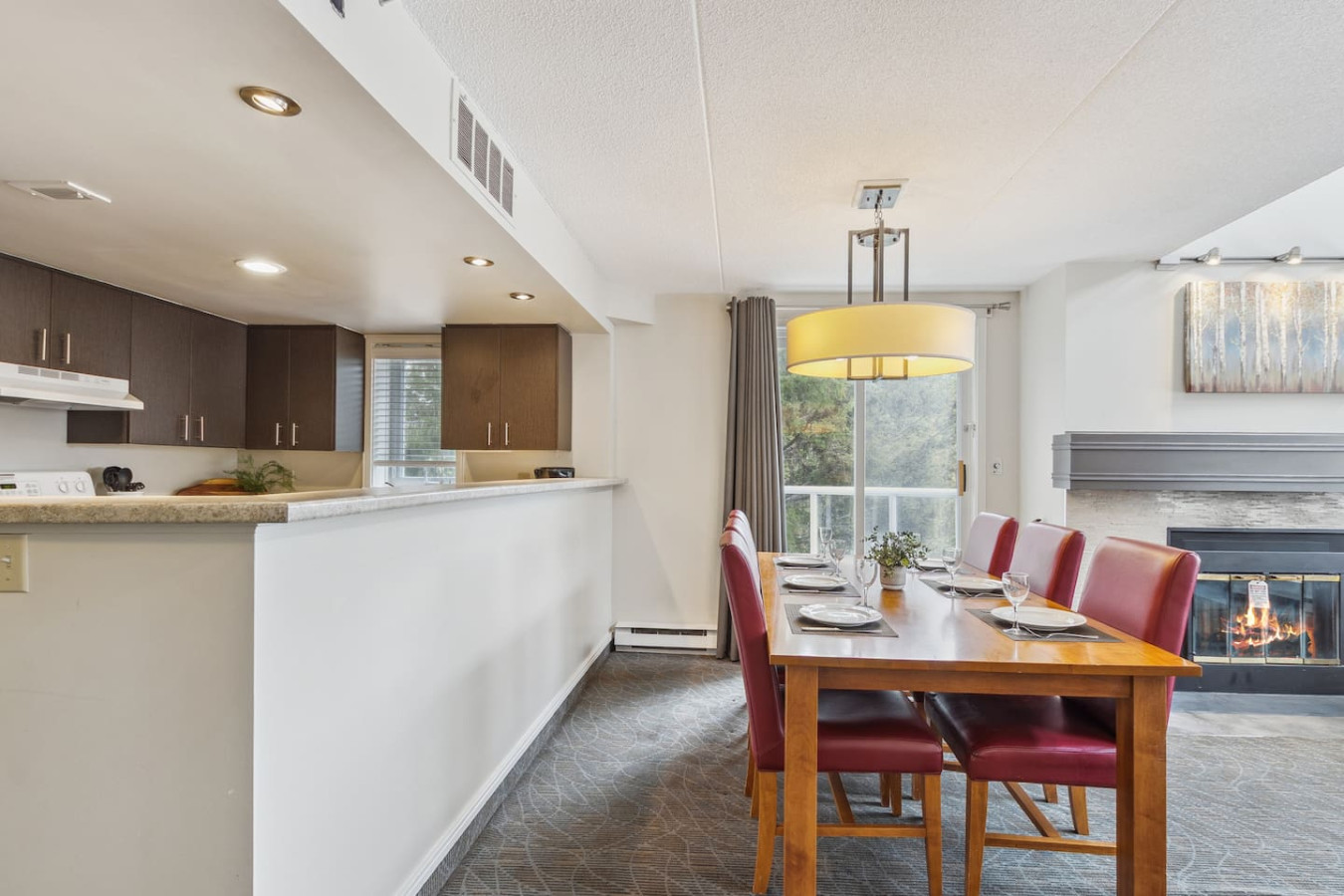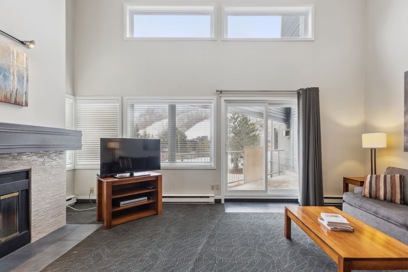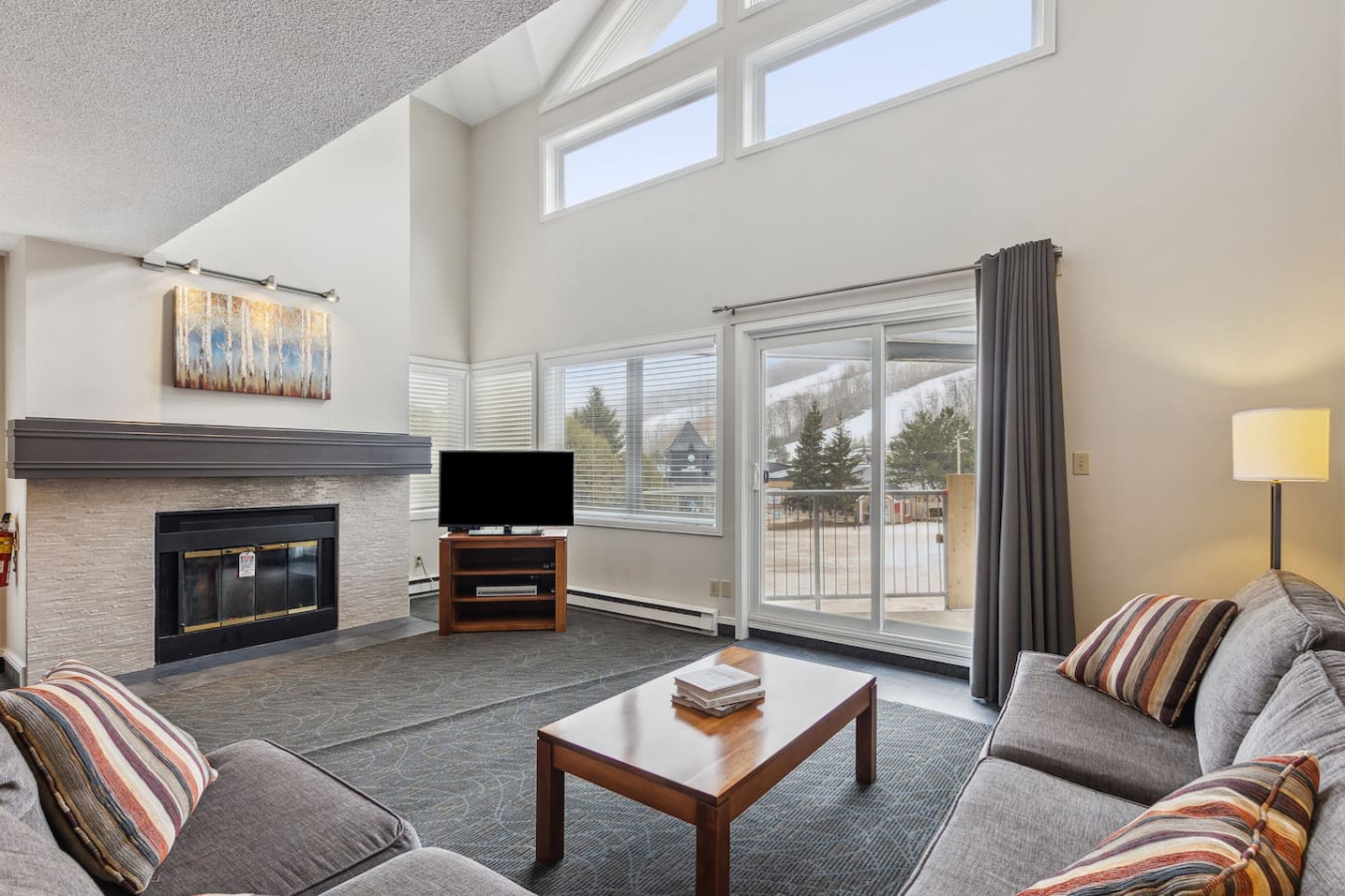 The living area features couches facing the cable TV and decorative fireplace (not permitted to be used), the perfect place to unwind après-ski. Sliding glass doors lead out to the private balcony with views of the slopes and village.