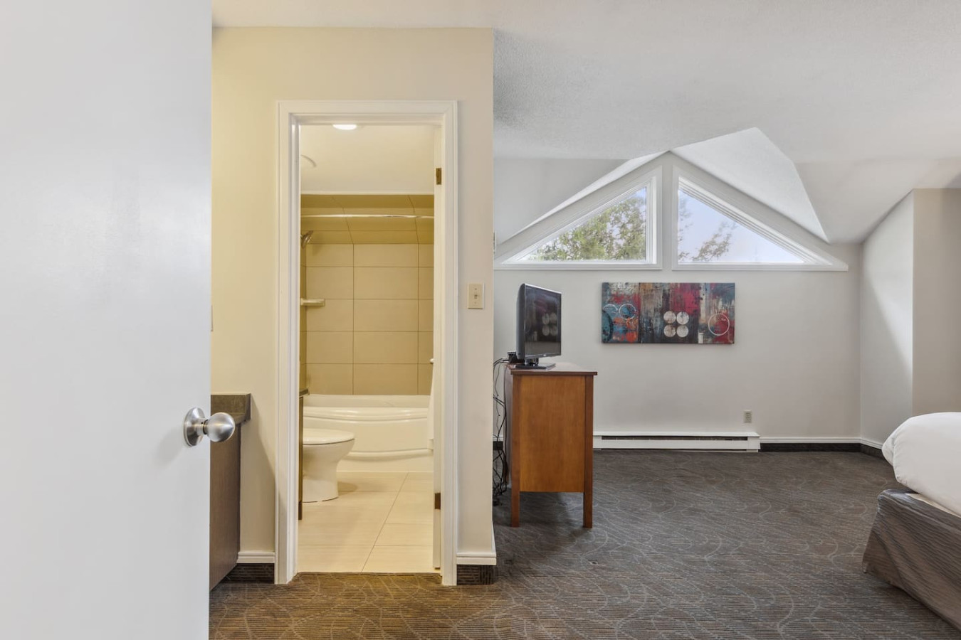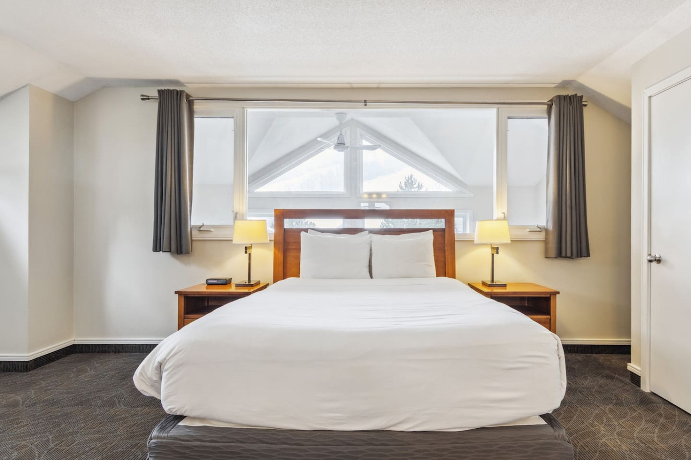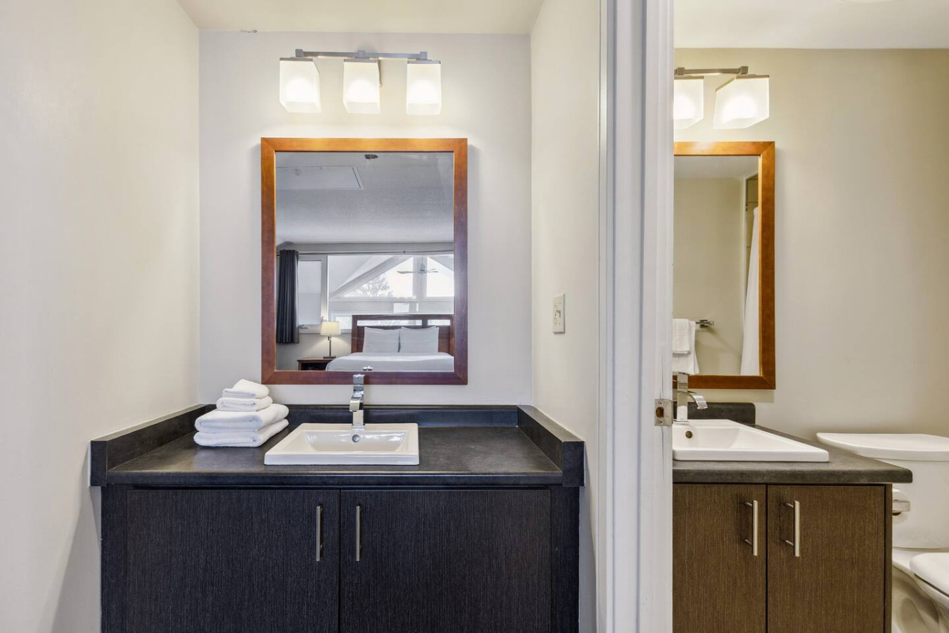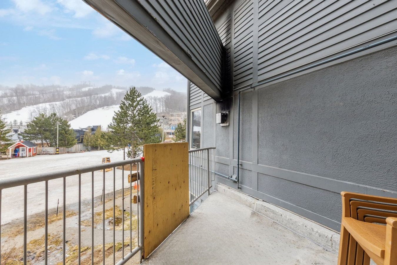 The living area features couches facing the cable TV and decorative fireplace (not permitted to be used), the perfect place to unwind après-ski. Sliding glass doors lead out to the private balcony with views of the slopes and village.