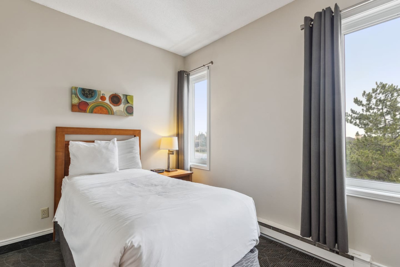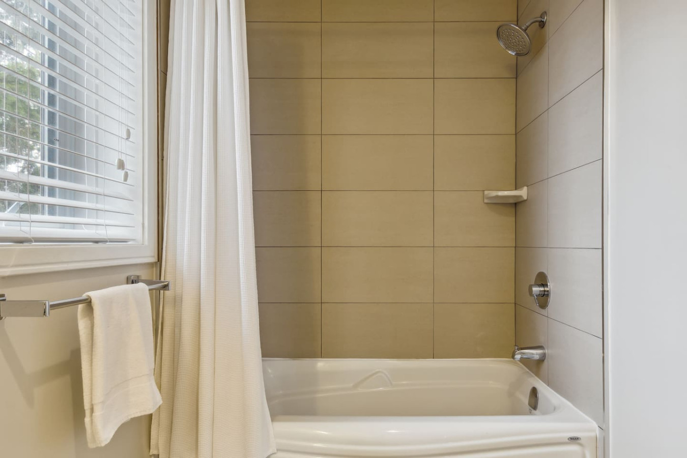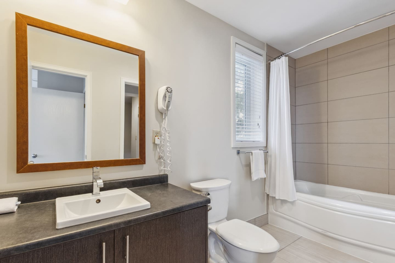 There are 2 bedrooms in this home. Bedroom #1, the primary, has a Queen size bed and cable TV. Bedroom #2 has 2 single beds and the living room has a double size sofa bed for additional sleeping space. There are 2 full washrooms in this home, both with a shower-in-tub.