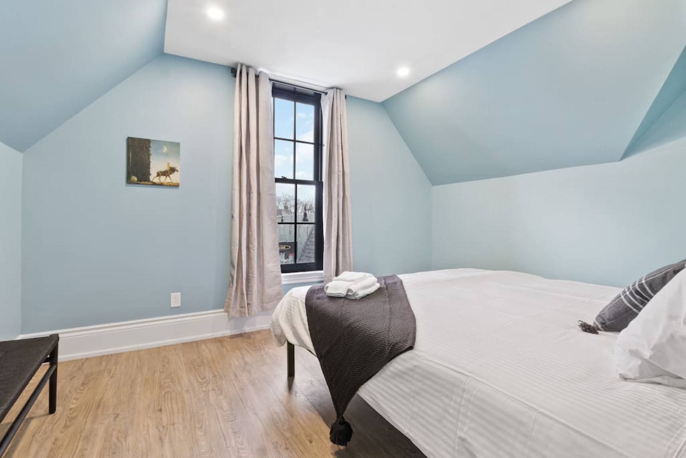 With views of the downtown core, the first generously sized bedroom features a King bed and plenty of light in the space, while the second bedroom hosts a Queen bed. Both bedrooms have been recently updated with a fresh coat of paint and contemporary decor.