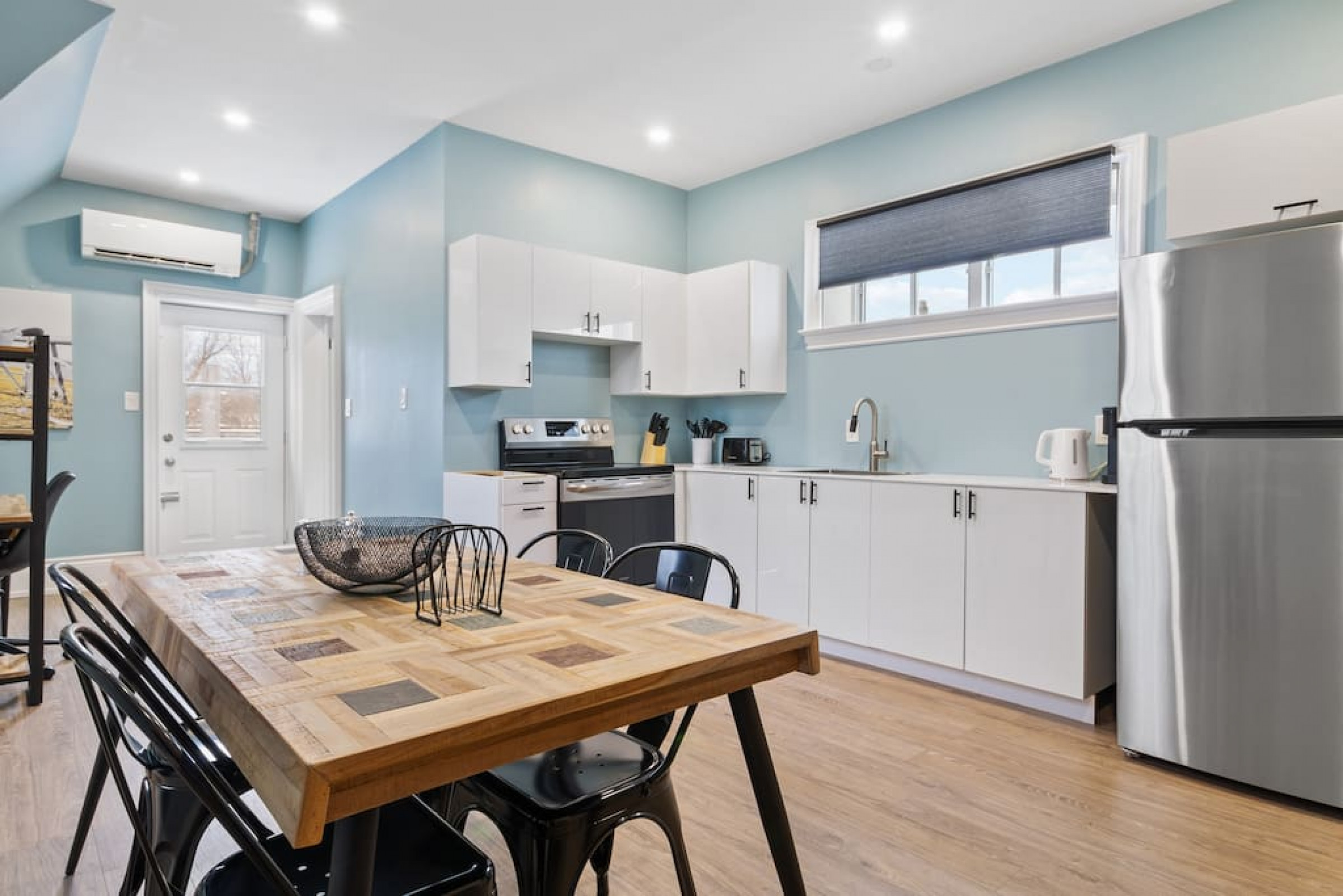 The kitchen has an abundance of natural light from the surrounding windows and ample lighting at night with the potlights throughout. Enjoy making breakfast just steps away from the spacious dining area. Stainless steel appliances include a fridge and stove. Leave the cookware, bakeware and utensils at home as they are provided throughout your stay. Just bring your coffee, food and spices!