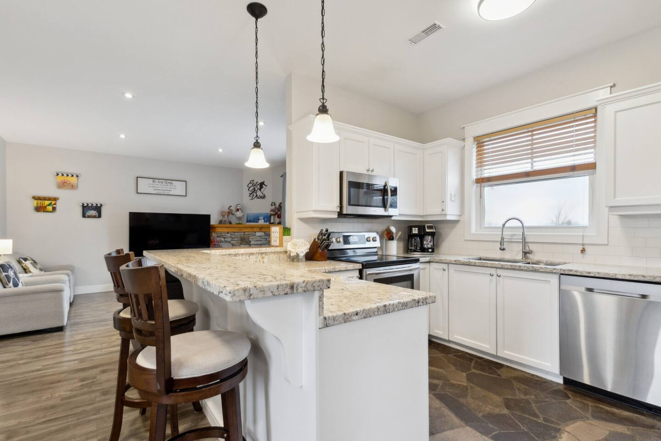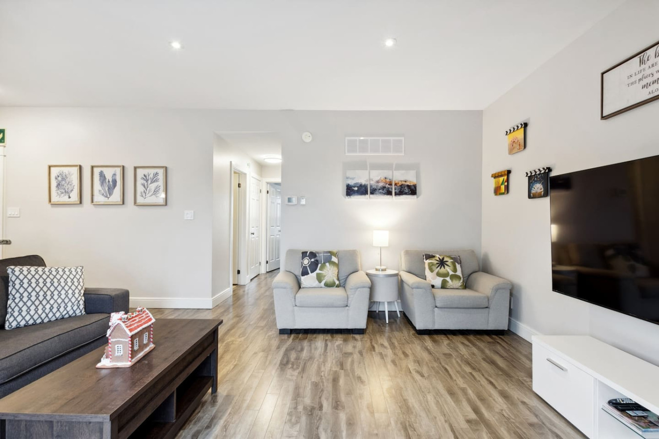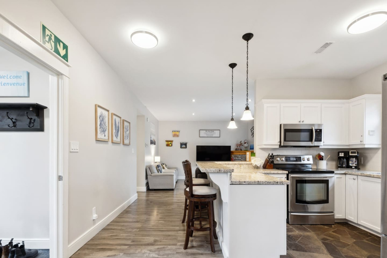 The spacious kitchen includes modern appliances and a dining area with room for 6 to gather. For the warmer months, there is a private balcony with a BBQ and outdoor dining area. With everything you need to prepare your own meals, you can enjoy the flexibility and convenience of cooking during your stay, or enjoy take out from the many local restaurants in Blue or Collingwood.