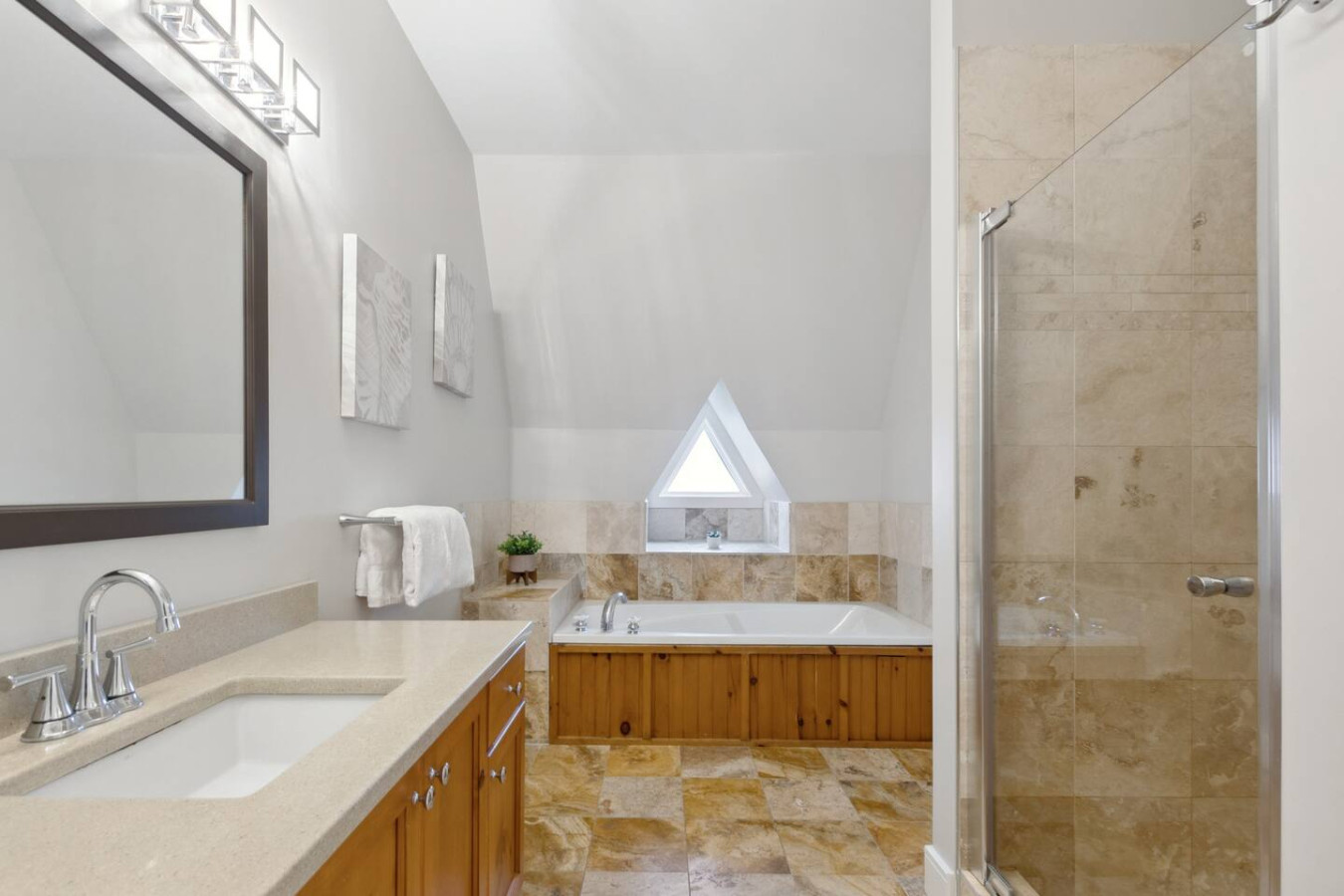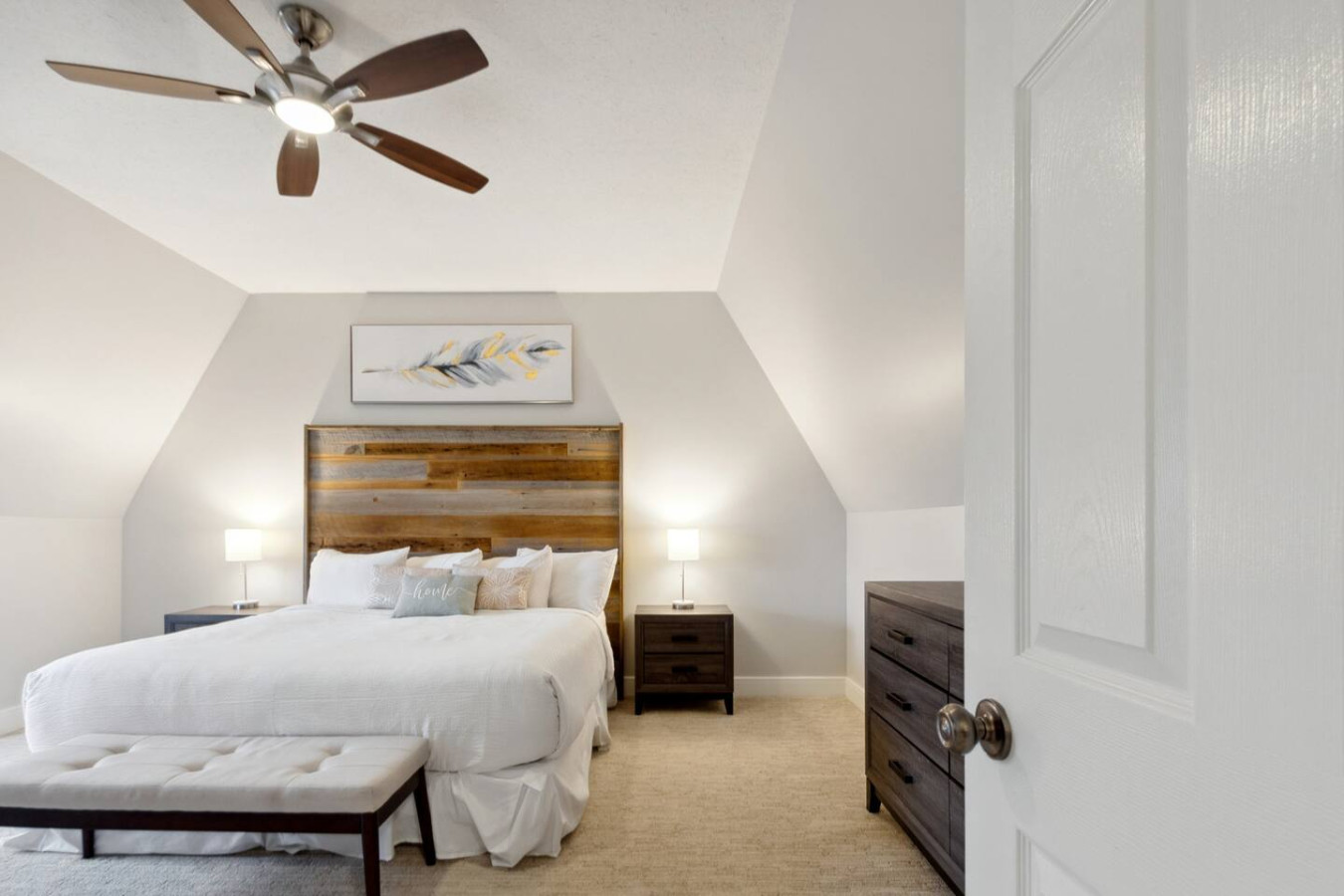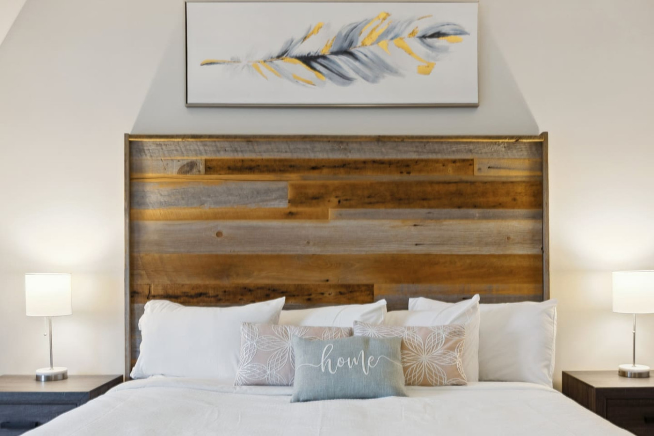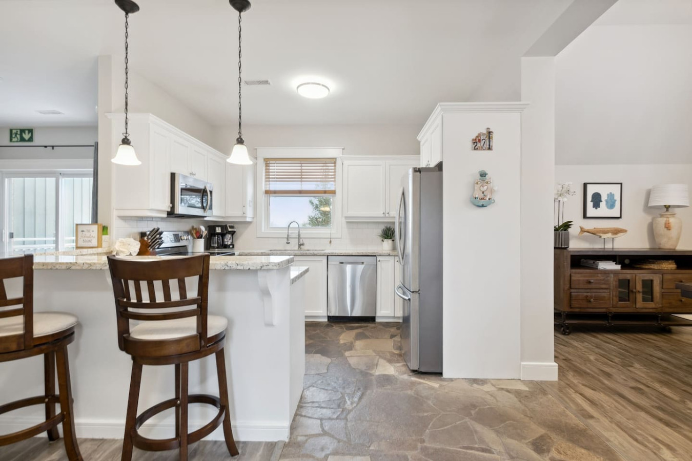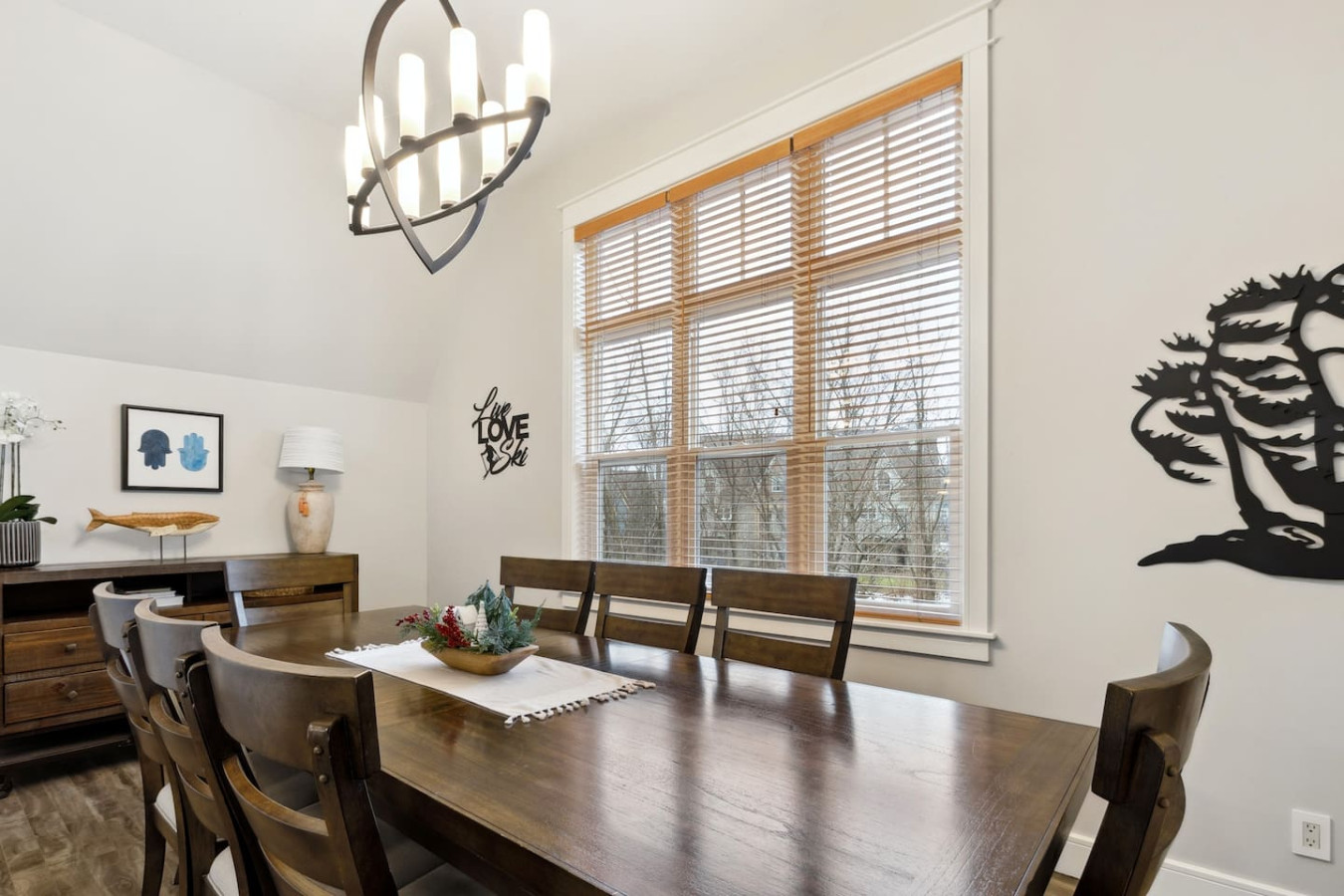 This home is the perfect blend of comfort and character with both rustic and modern accents. The living area has a gas fireplace and Smart TV with cable surrounded by comfortable seating. The couch can pull out to a double size sofa bed to accommodate additional guests.