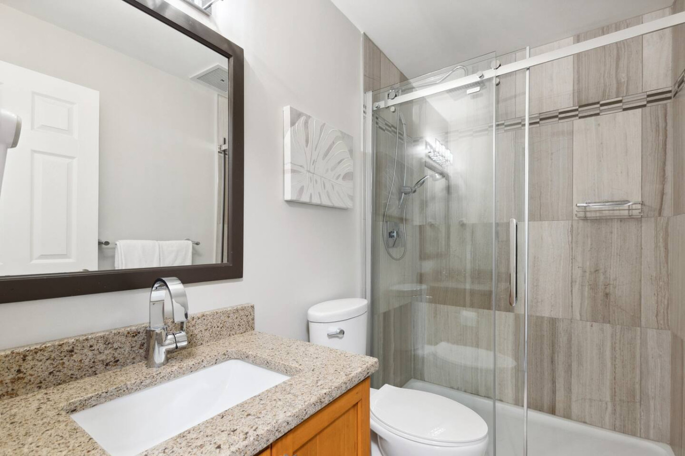 The condo has three bedrooms. Bedroom one is the primary bedroom with a king size bed and private ensuite. Bedroom 2 features a queen size bed, and bedroom 3 has two single beds. There are 2 total bathrooms in this home with one shower and one shower-in-tub. All linens, pillows and towels are included in your stay.