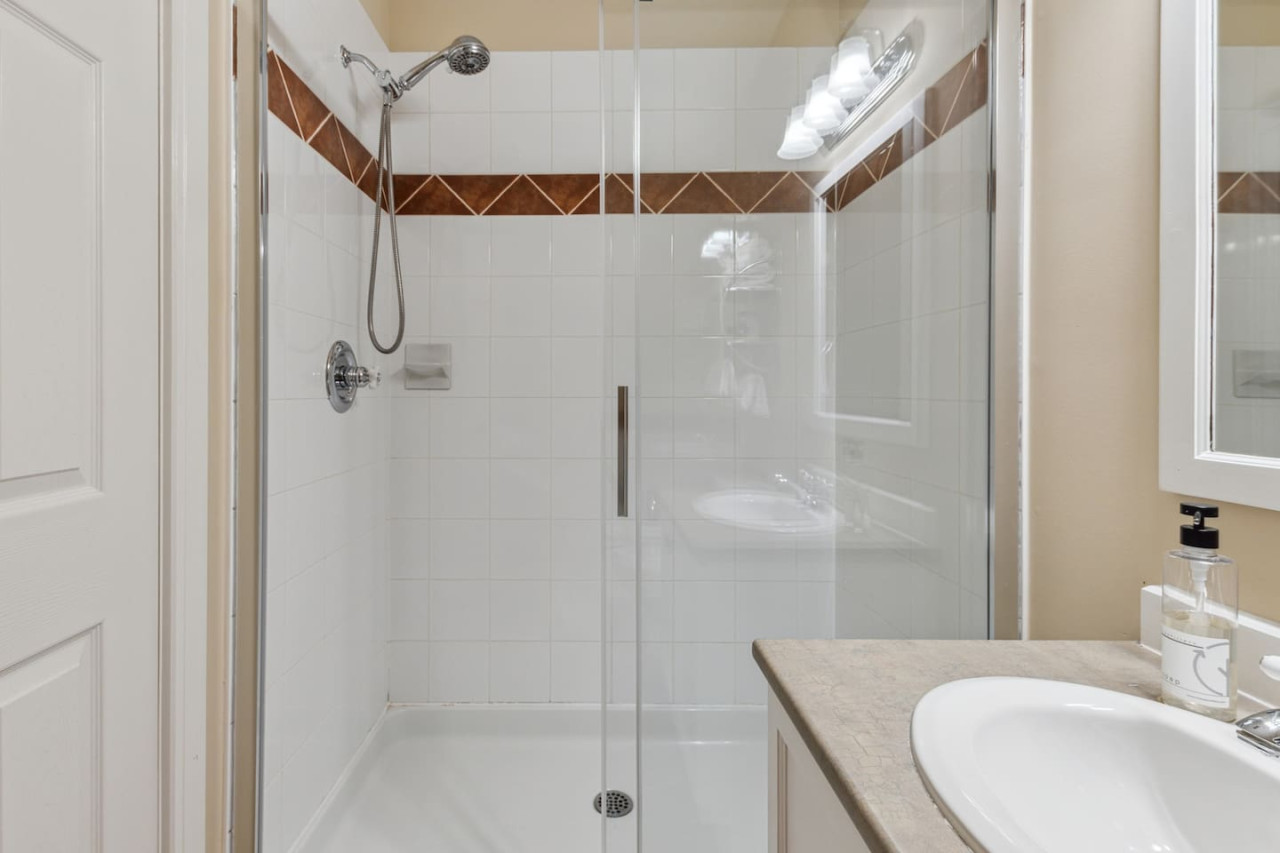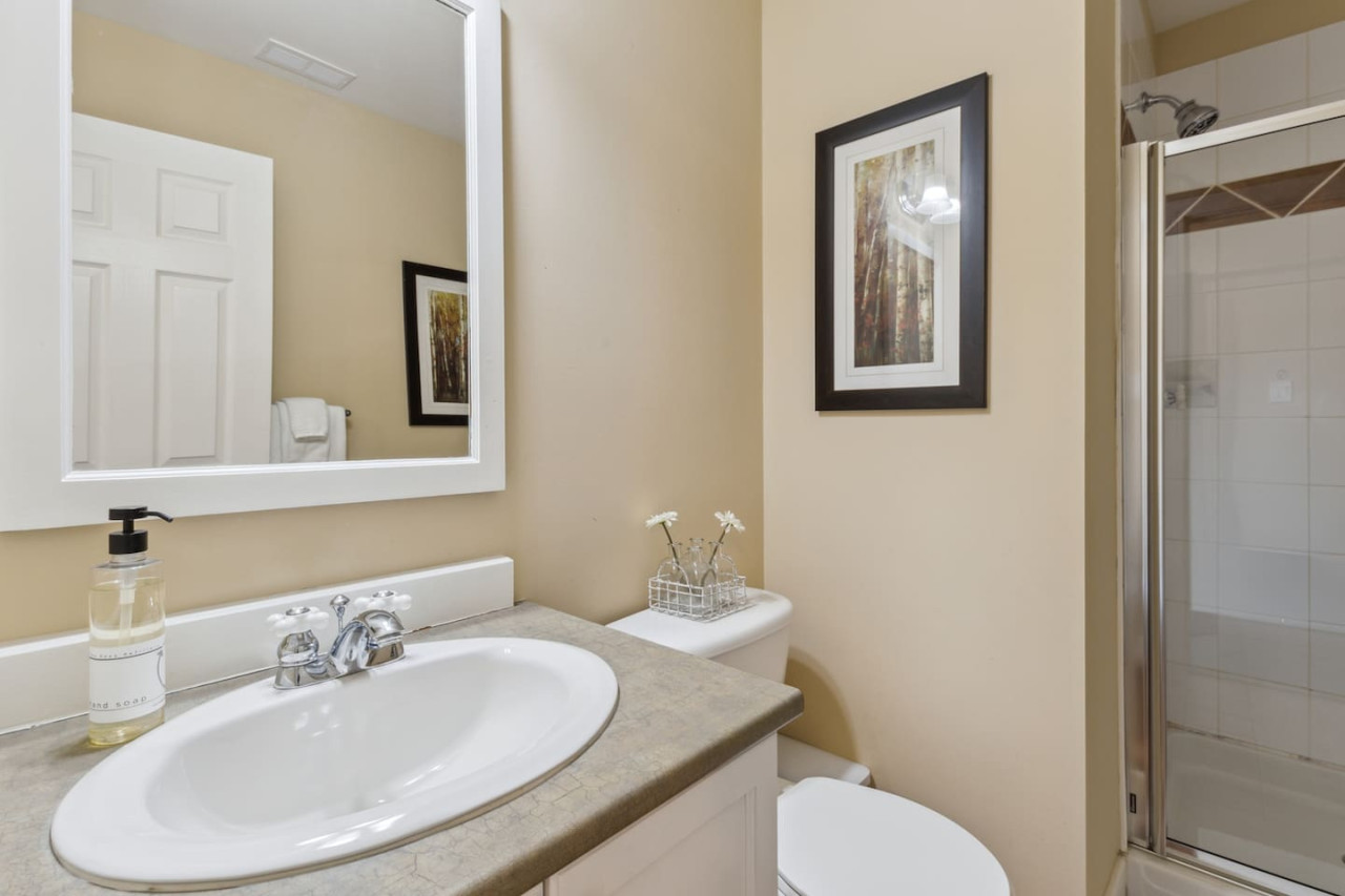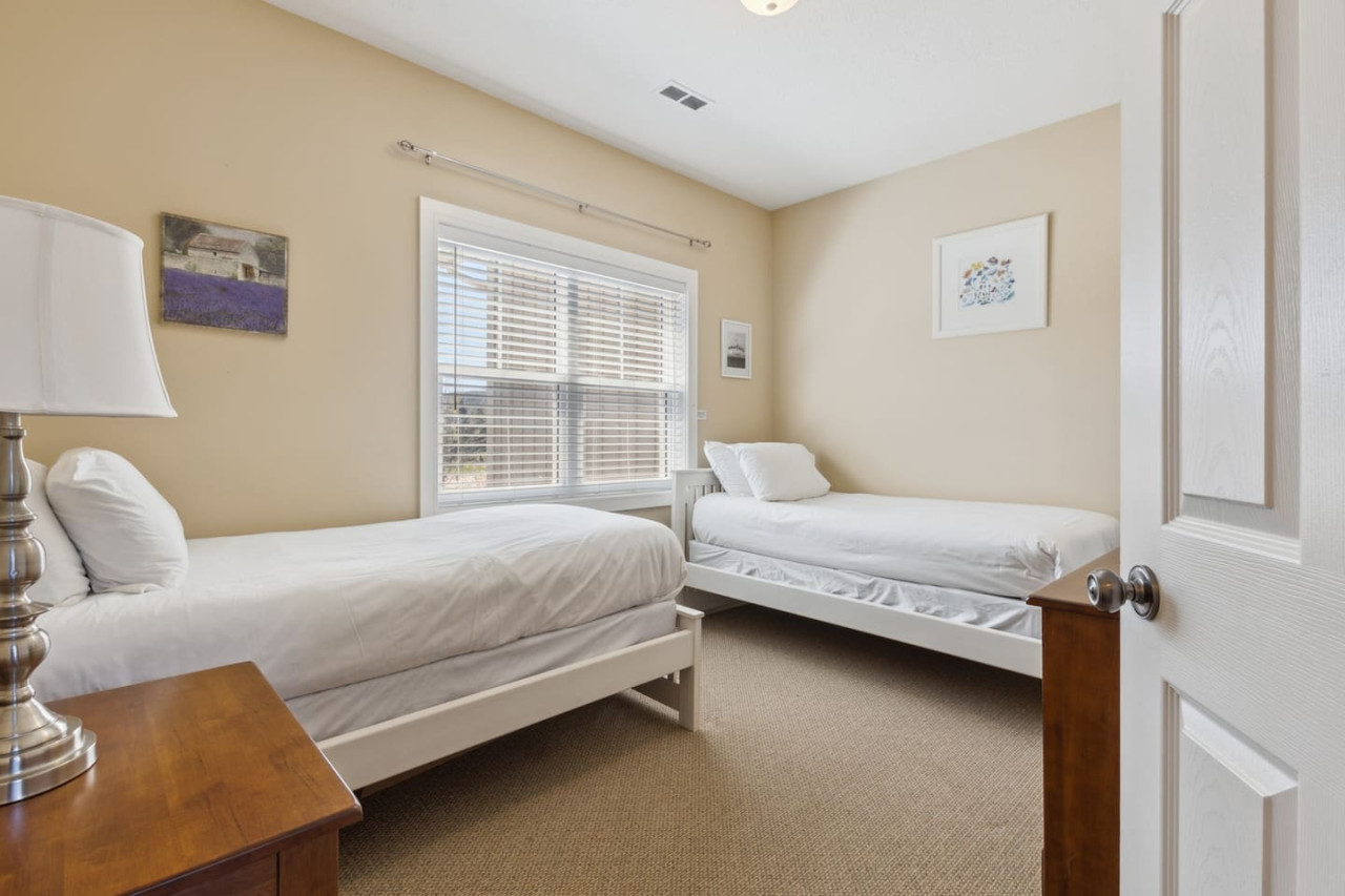The condo features two bedrooms, one on the main level and one on the upper level. Bedroom one has 2 twin beds, and bedroom two has 1 queen bed with an ensuite bathroom. There are 2 total bathrooms in this home with one shower and one shower-in-tub. All linens, pillows and towels are included in your stay.