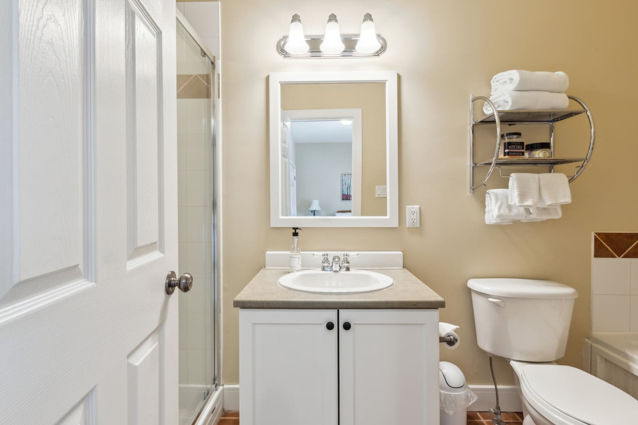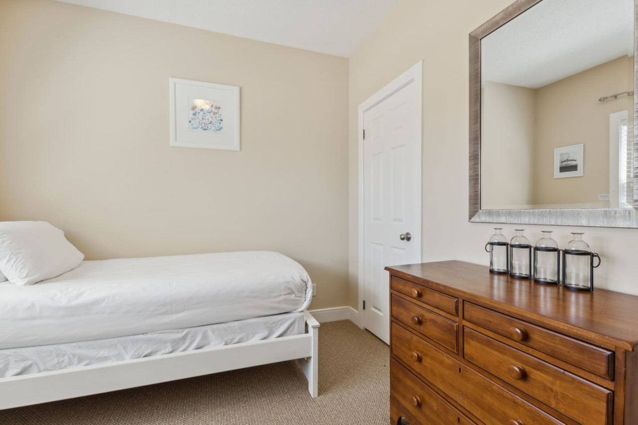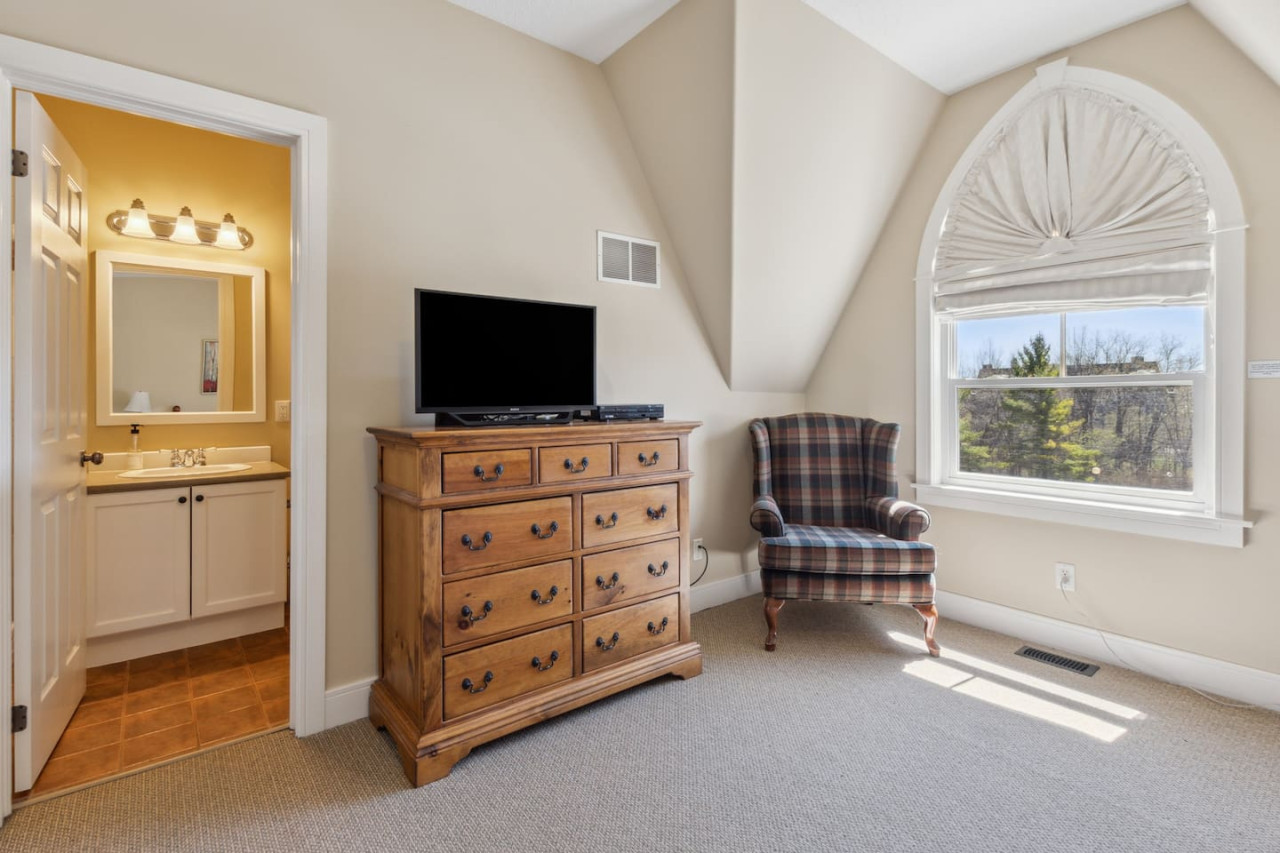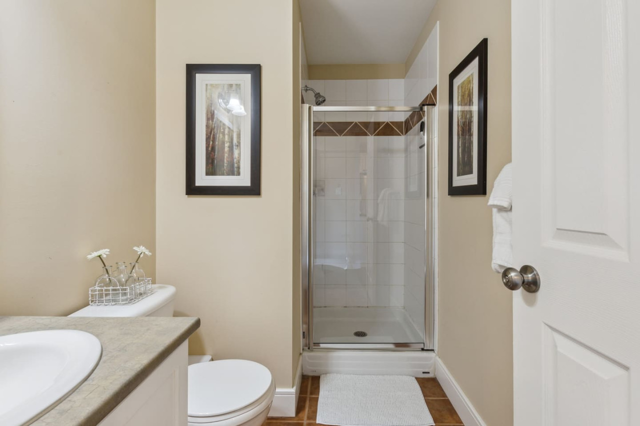 The condo features two bedrooms, one on the main level and one on the upper level. Bedroom one has 2 twin beds, and bedroom two has 1 queen bed with an ensuite bathroom. There are 2 total bathrooms in this home with one shower and one shower-in-tub. All linens, pillows and towels are included in your stay.