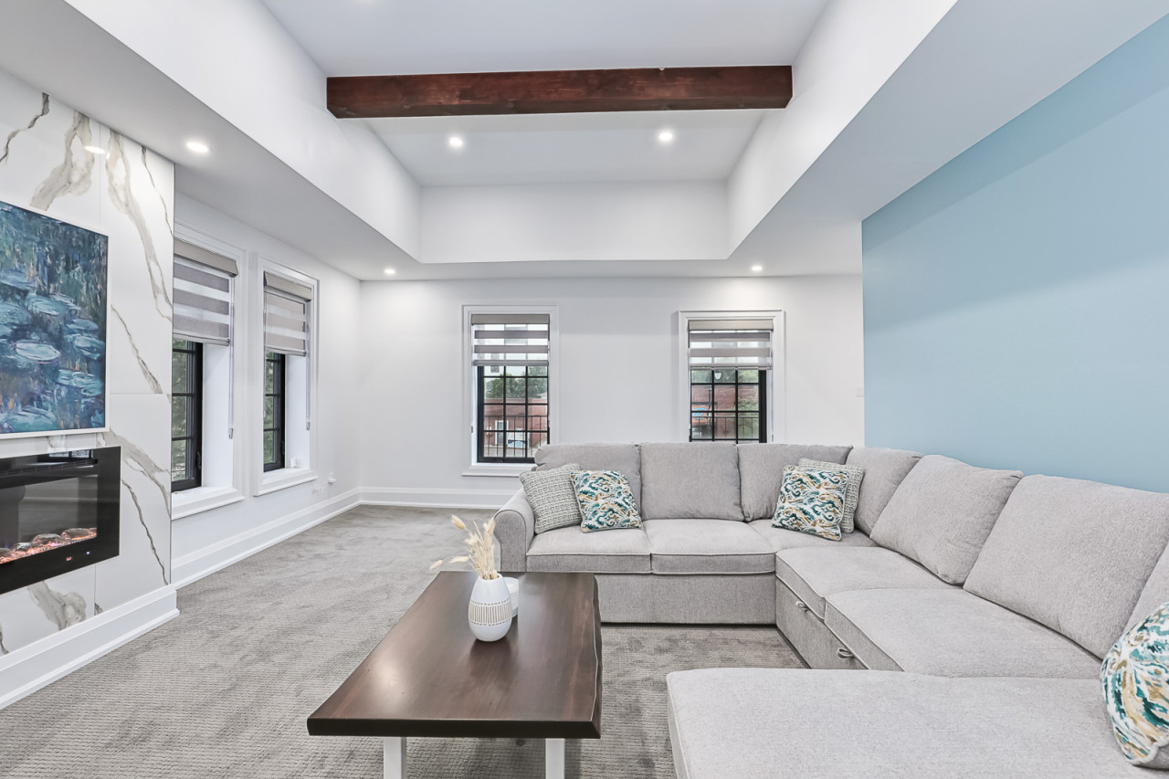 As you walk through the door, you’re greeted with a staircase up to the open concept living space. The living area features a large sectional couch facing the electric fireplace and Samsung Smart TV. For larger groups, the couch can pull out to a double size sofa bed.