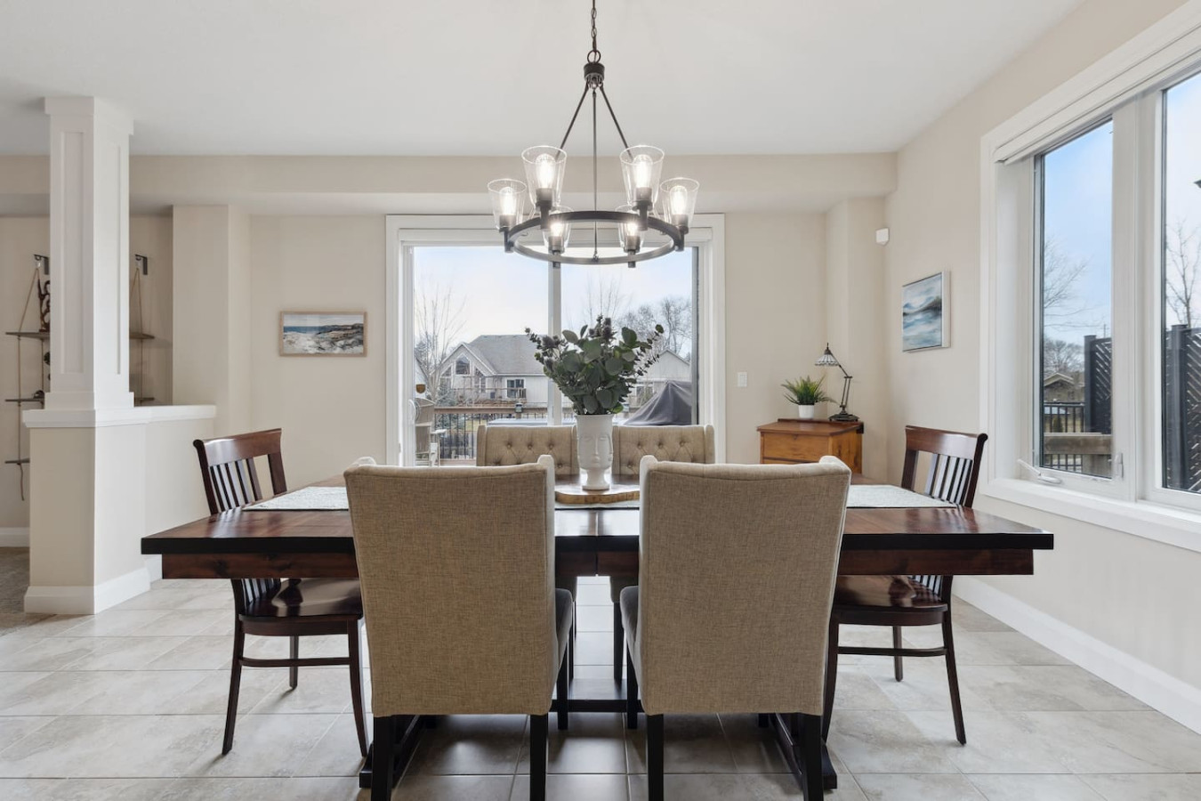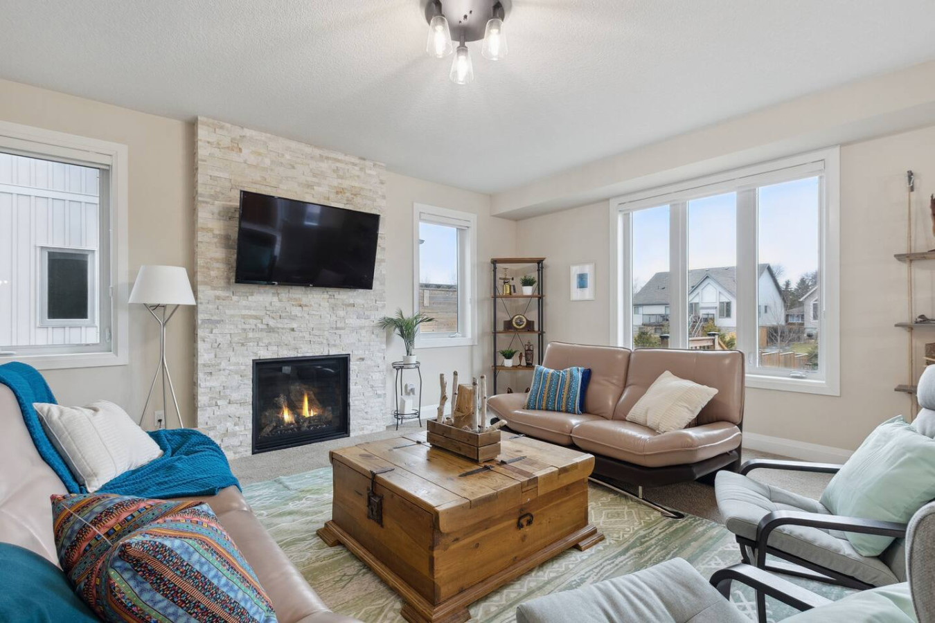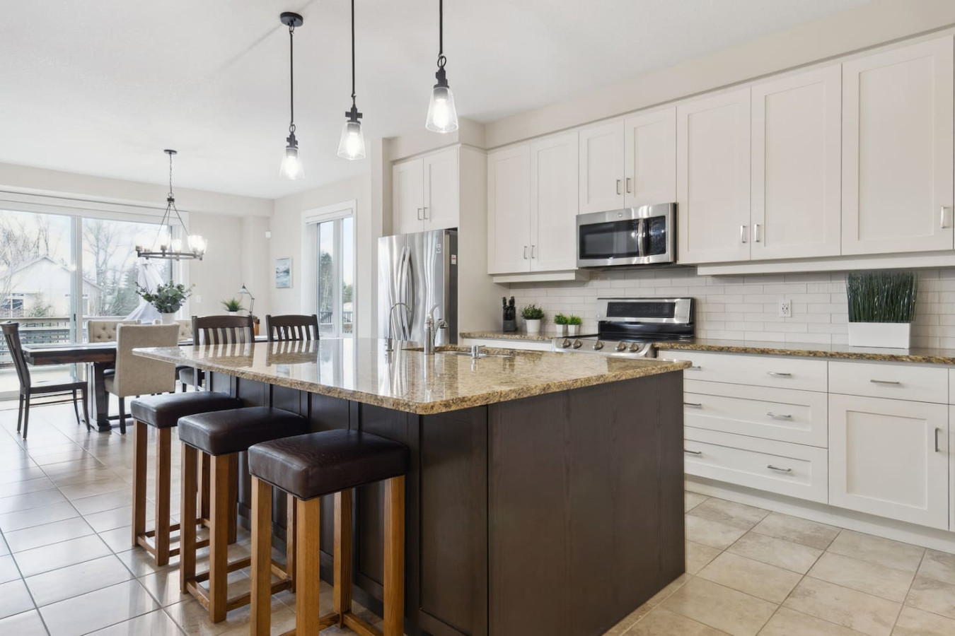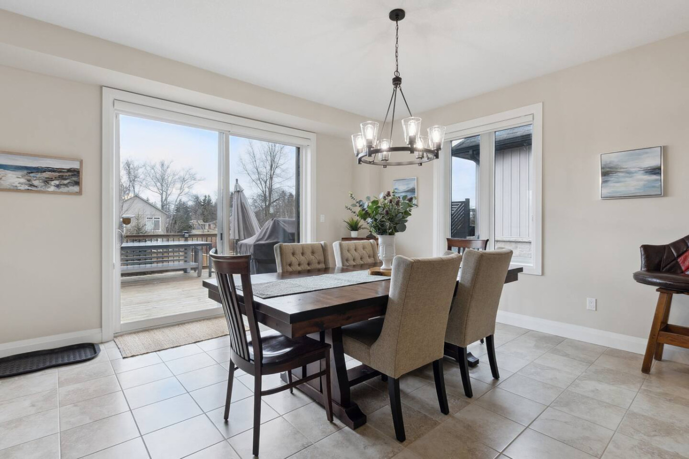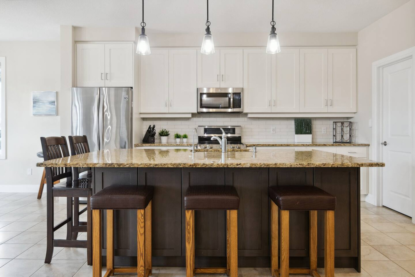 As you walk through the door, you’ll be greeted by the living area featuring ample seating surrounding the gas fireplace and Smart TV. Sliding glass doors lead out to the private deck with the gas BBQ and outdoor dining area. Please note, the fire pit shown in the backyard photos has been removed from the property.