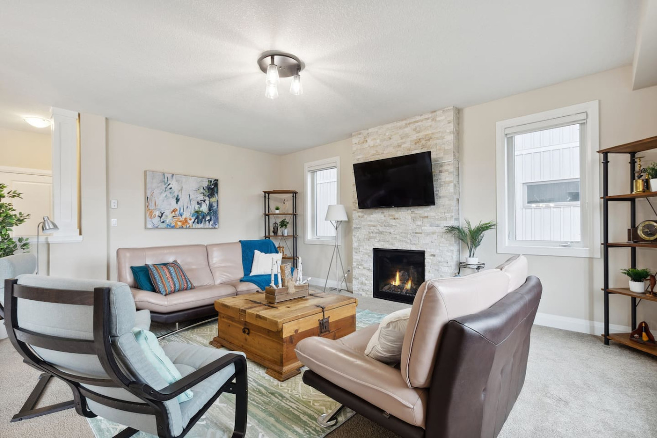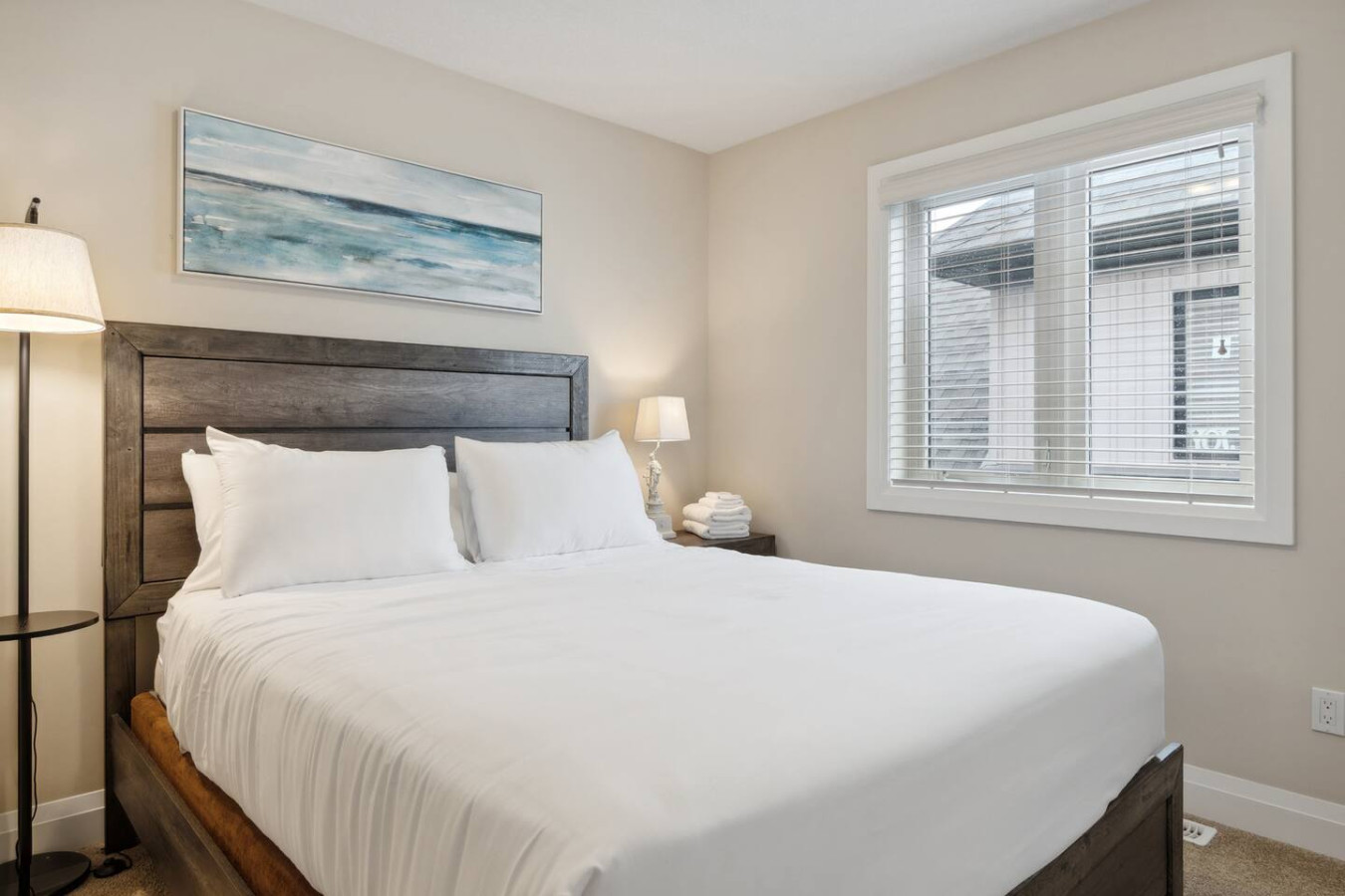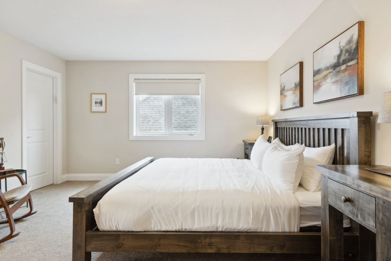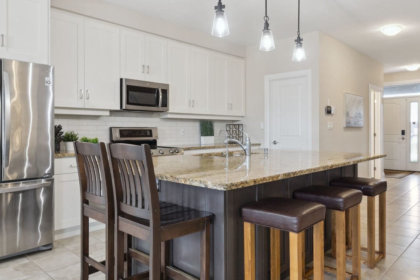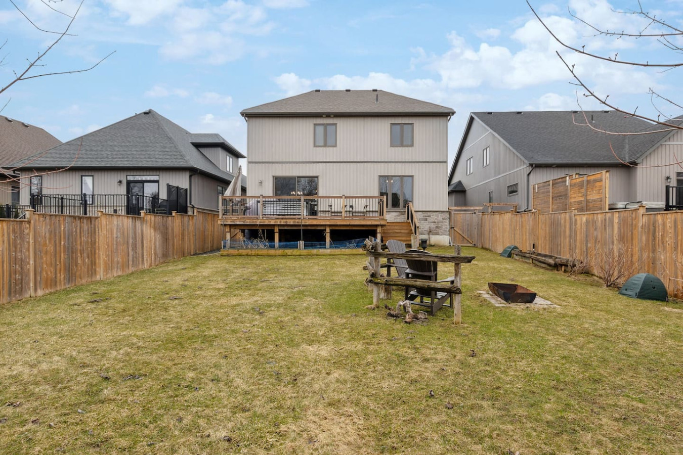 As you walk through the door, you’ll be greeted by the living area featuring ample seating surrounding the gas fireplace and Smart TV. Sliding glass doors lead out to the private deck with the gas BBQ and outdoor dining area. Please note, the fire pit shown in the backyard photos has been removed from the property.