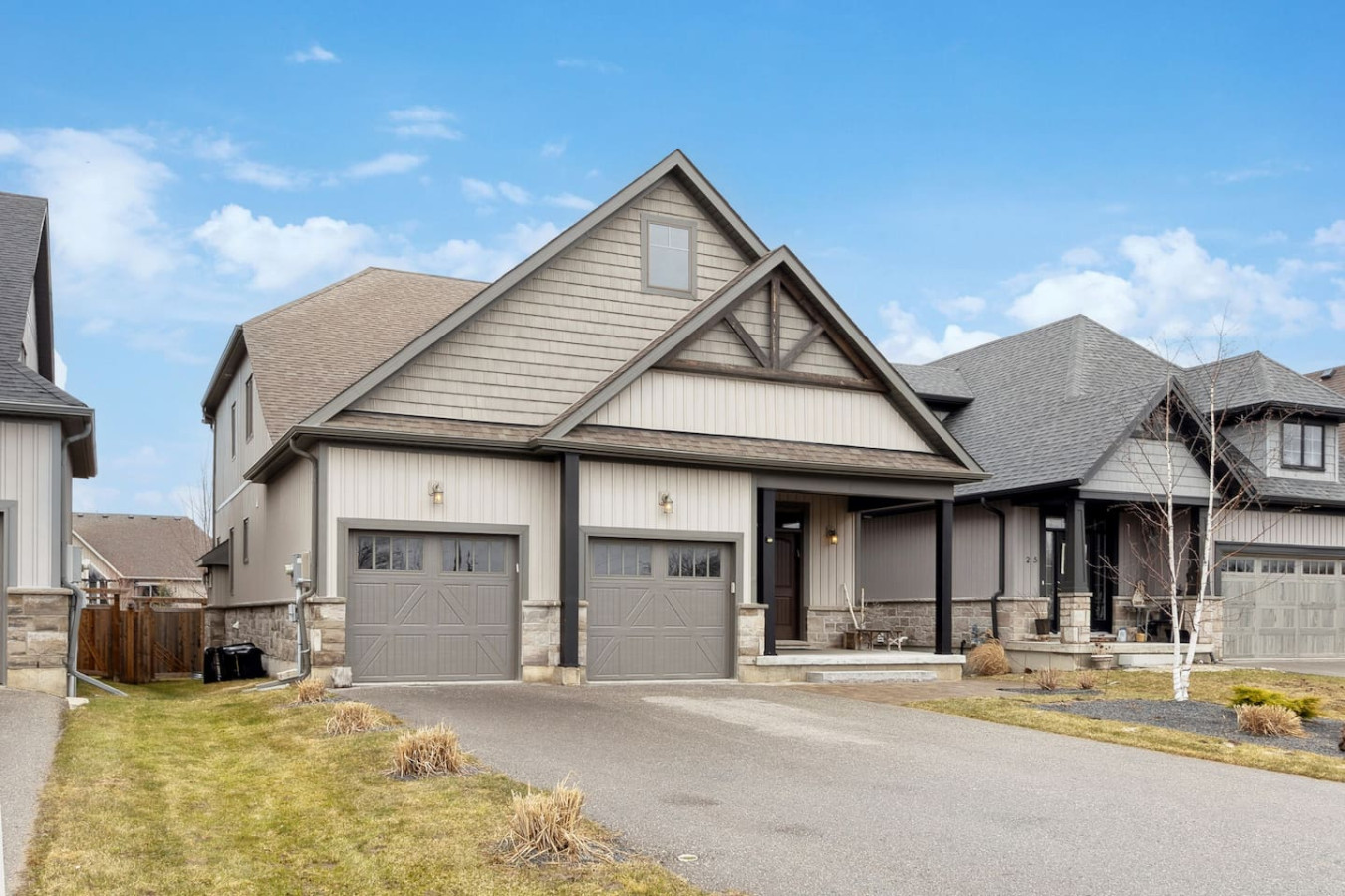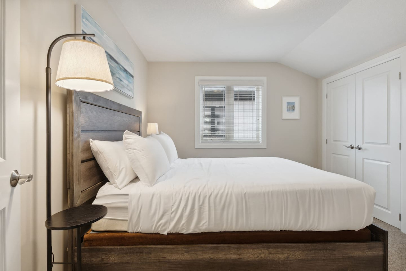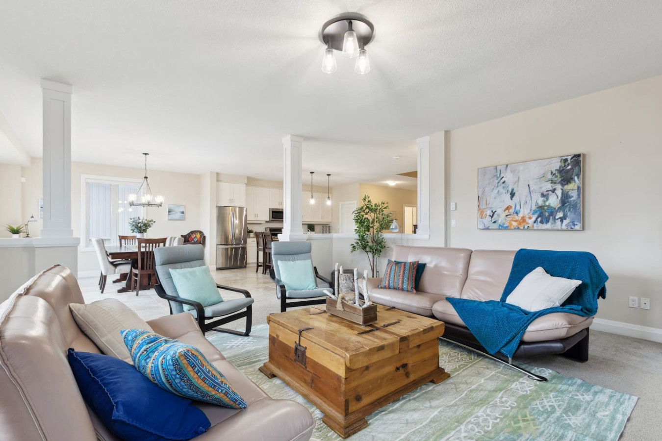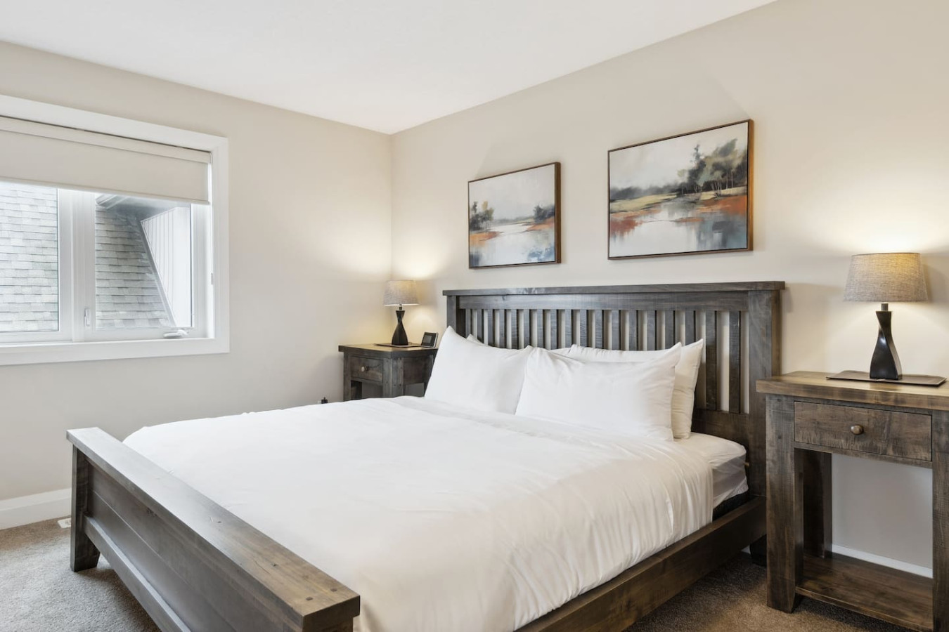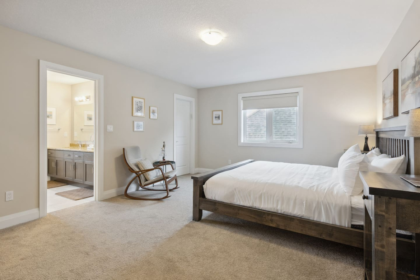 As you walk through the door, you’ll be greeted by the living area featuring ample seating surrounding the gas fireplace and Smart TV. Sliding glass doors lead out to the private deck with the gas BBQ and outdoor dining area. Please note, the fire pit shown in the backyard photos has been removed from the property.