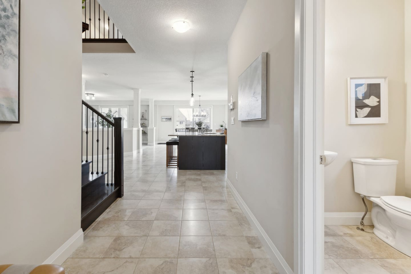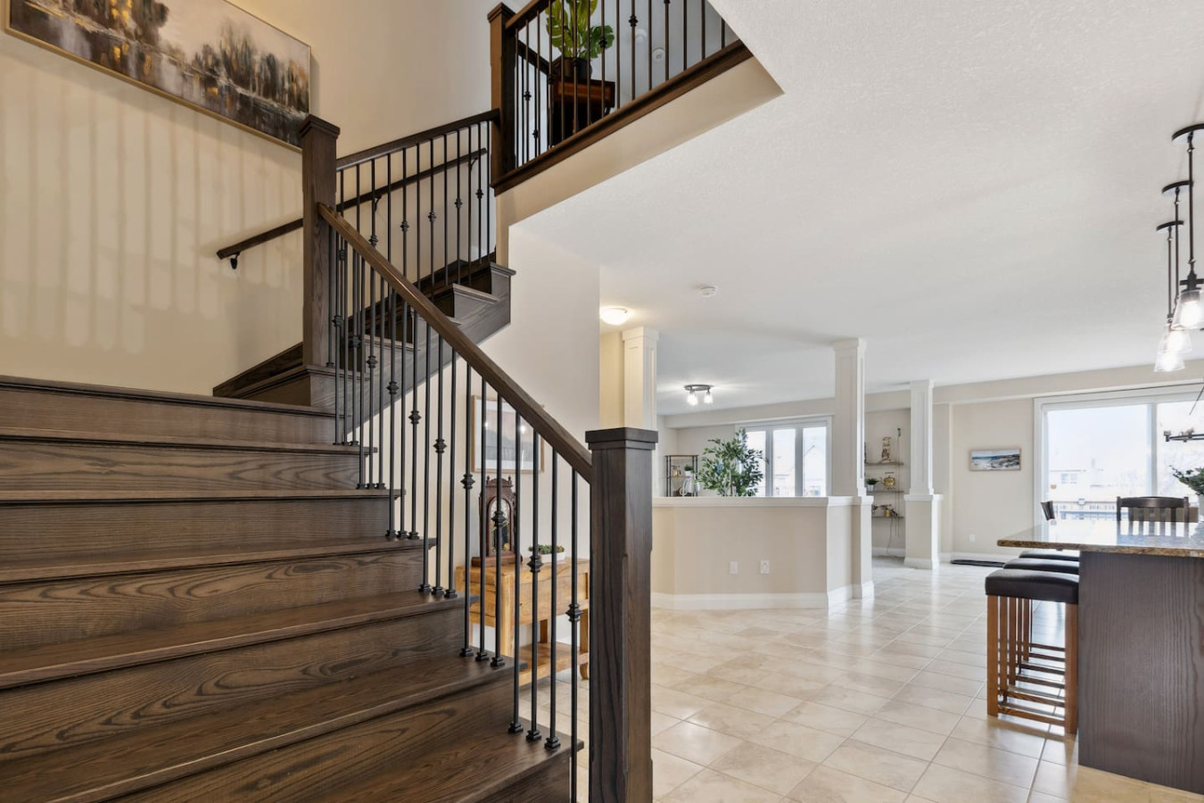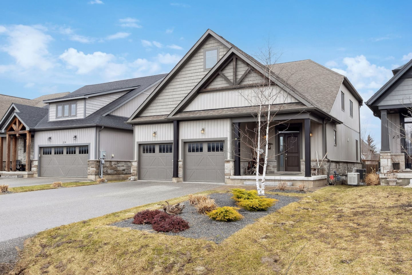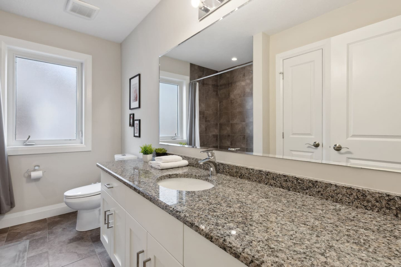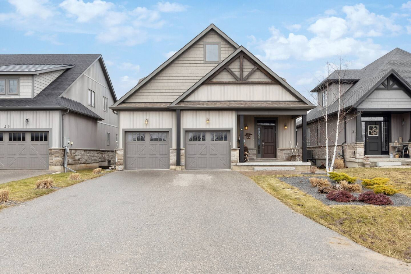 As you walk through the door, you’ll be greeted by the living area featuring ample seating surrounding the gas fireplace and Smart TV. Sliding glass doors lead out to the private deck with the gas BBQ and outdoor dining area. Please note, the fire pit shown in the backyard photos has been removed from the property.