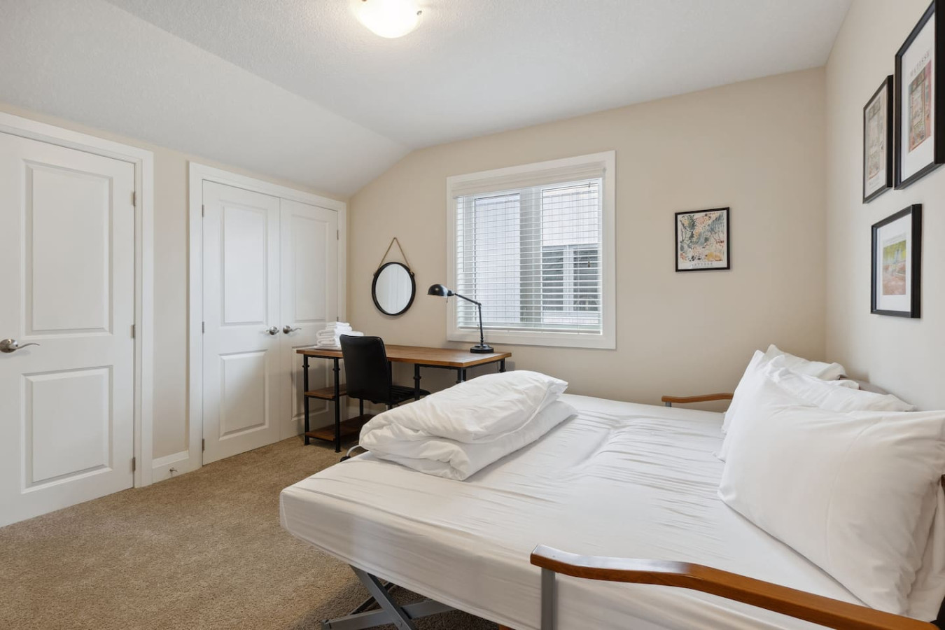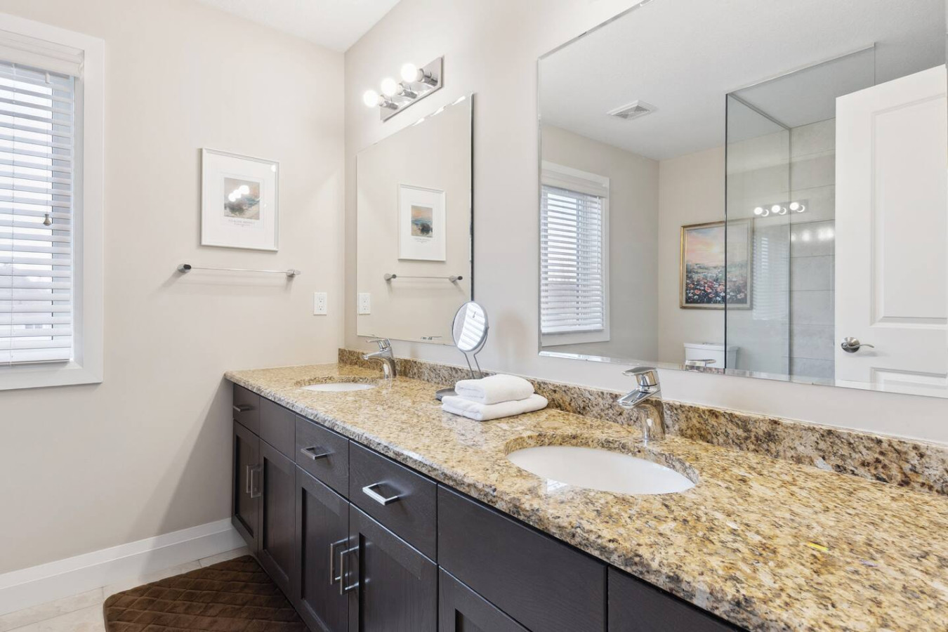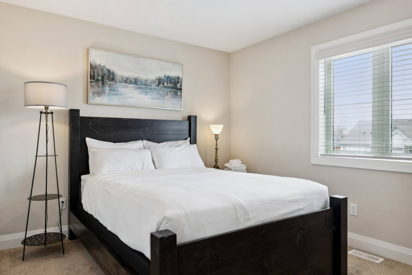 This home has 4 bedrooms and 2.5 bathrooms. Bedroom #1, the primary, has a king size bed and ensuite bathroom with a shower. Bedroom #2 and #3 each has a queen size bed. Bedroom #4 has a double size futon and a private workspace. The second full bathroom is upstairs and there is a half bathroom beside the kitchen.