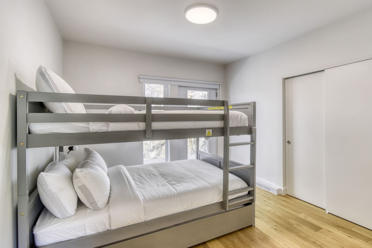 Cette maison dispose de 3 chambres à coucher. La chambre 1 dispose d'un lit King avec vue sur le lac et les montagnes, et d'une salle de bains privative. La chambre n°2 comprend un lit Queen et la chambre n°3 un lit double superposé avec un lit gigogne extractible. Veuillez noter que le lit simple indiqué dans la partie de cette annonce consacrée à la configuration des lits est le lit gigogne. La deuxième salle de bains complète de cette maison est située près de l'entrée du salon.