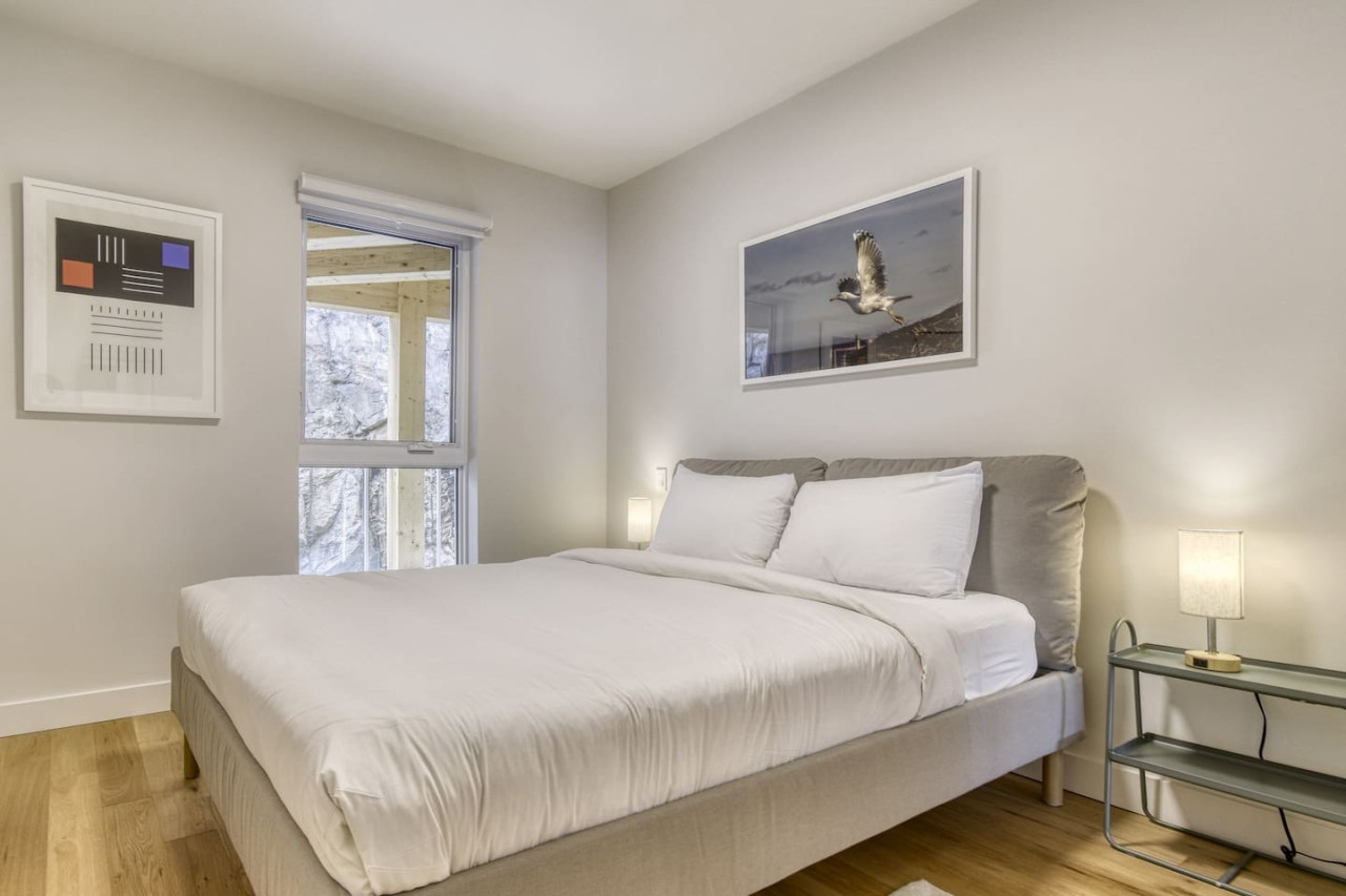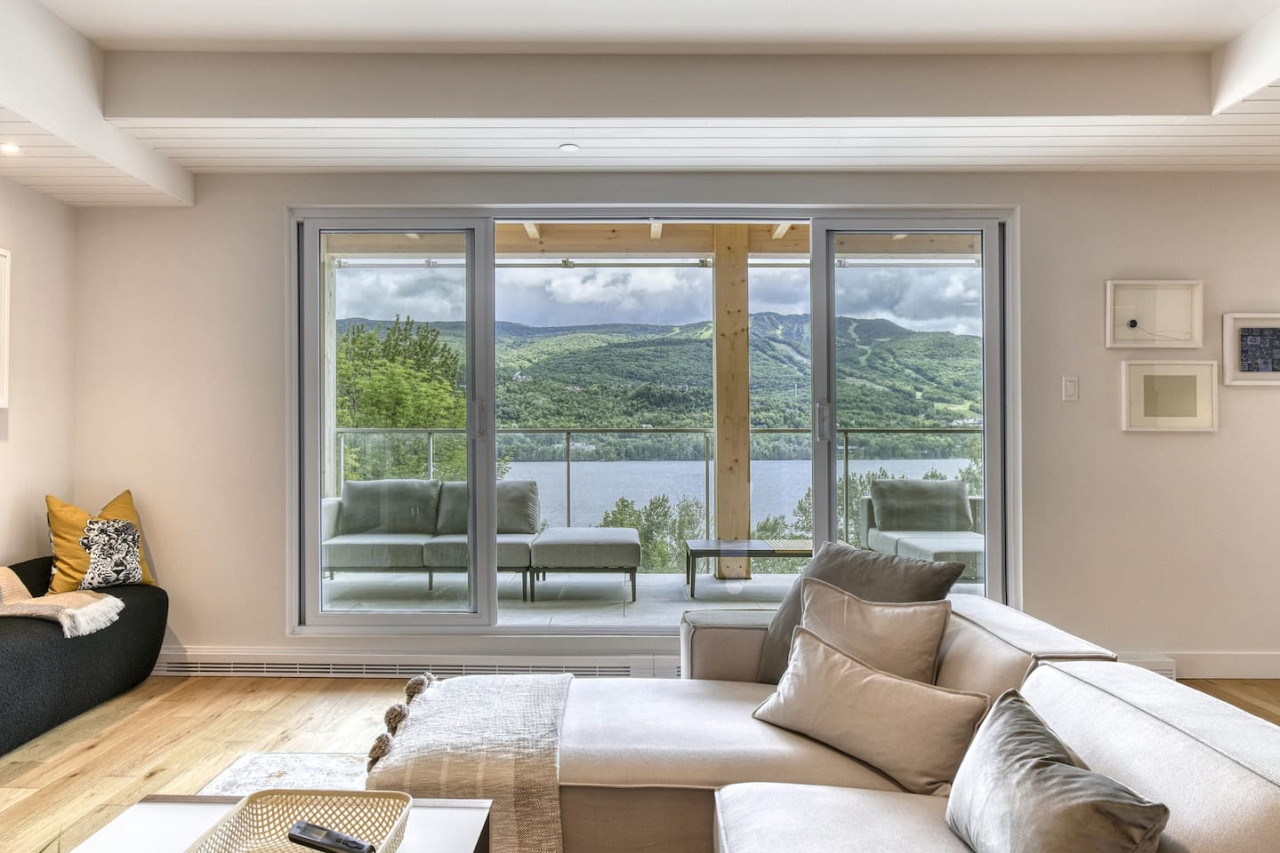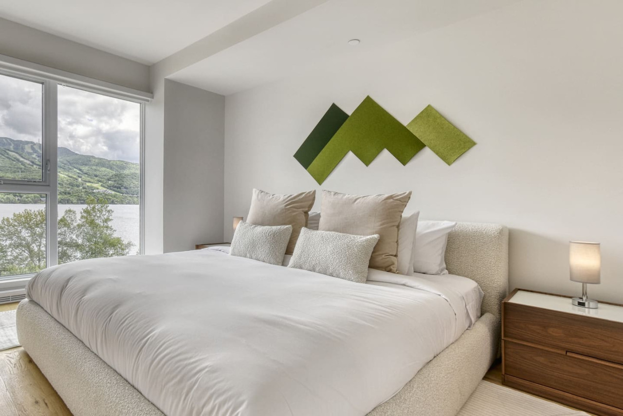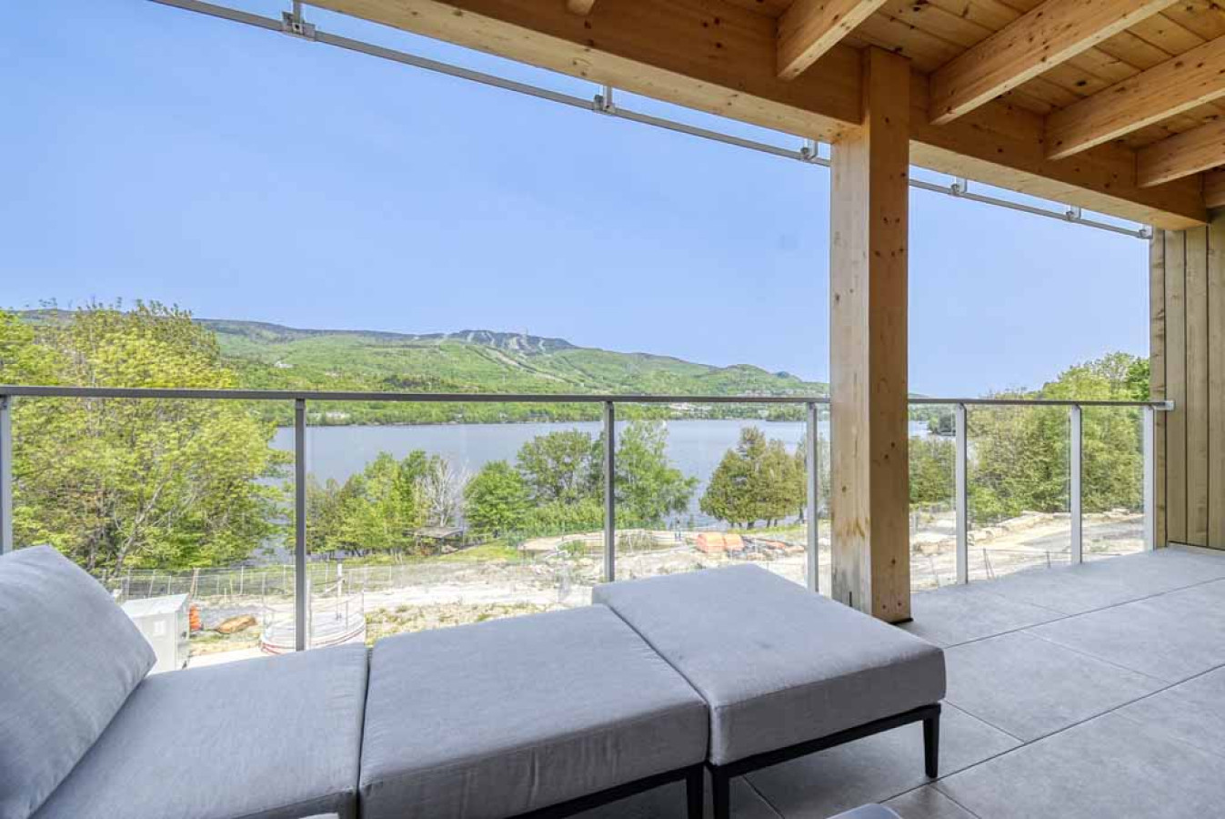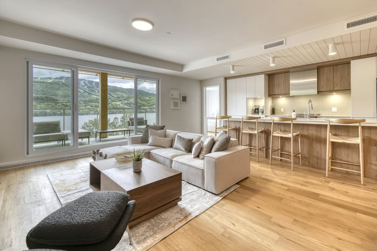 This condo embraces a minimalistic, clean, modern style while maintaining a practical, cozy and welcoming feel. The open concept living space features a comfortable sofa and chairs facing the gas fireplace and Smart TV, as well as an outdoor private balcony featuring breathtaking views of Lac Tremblant and the Ski Hill. The space is stocked with ample games for couples or families with children to enjoy together. No matter the weather or season, you’ll find an area to gather and relax in our lakeside home after a long day of skiing or exploring the area.