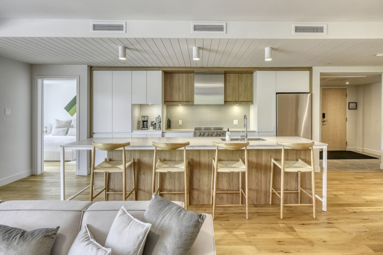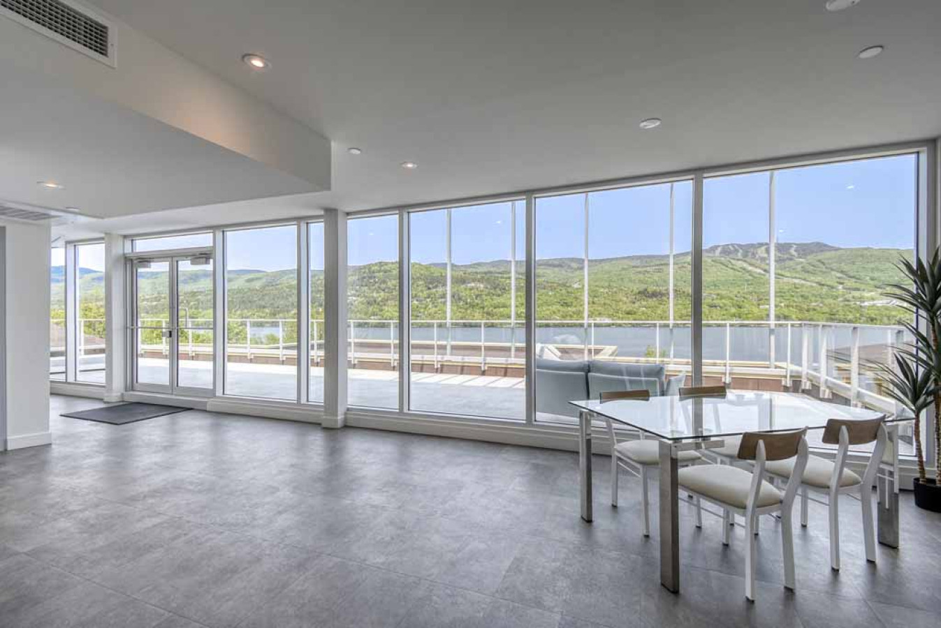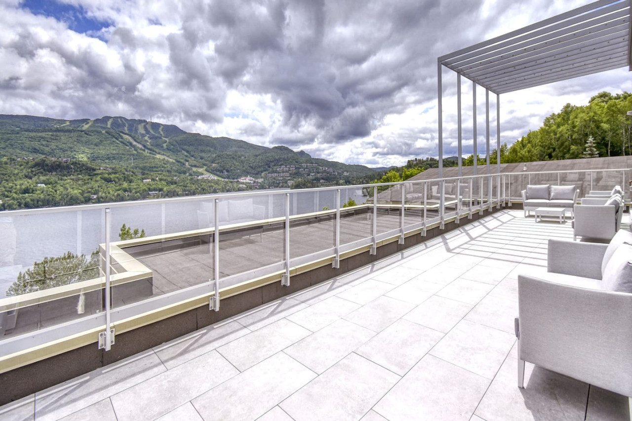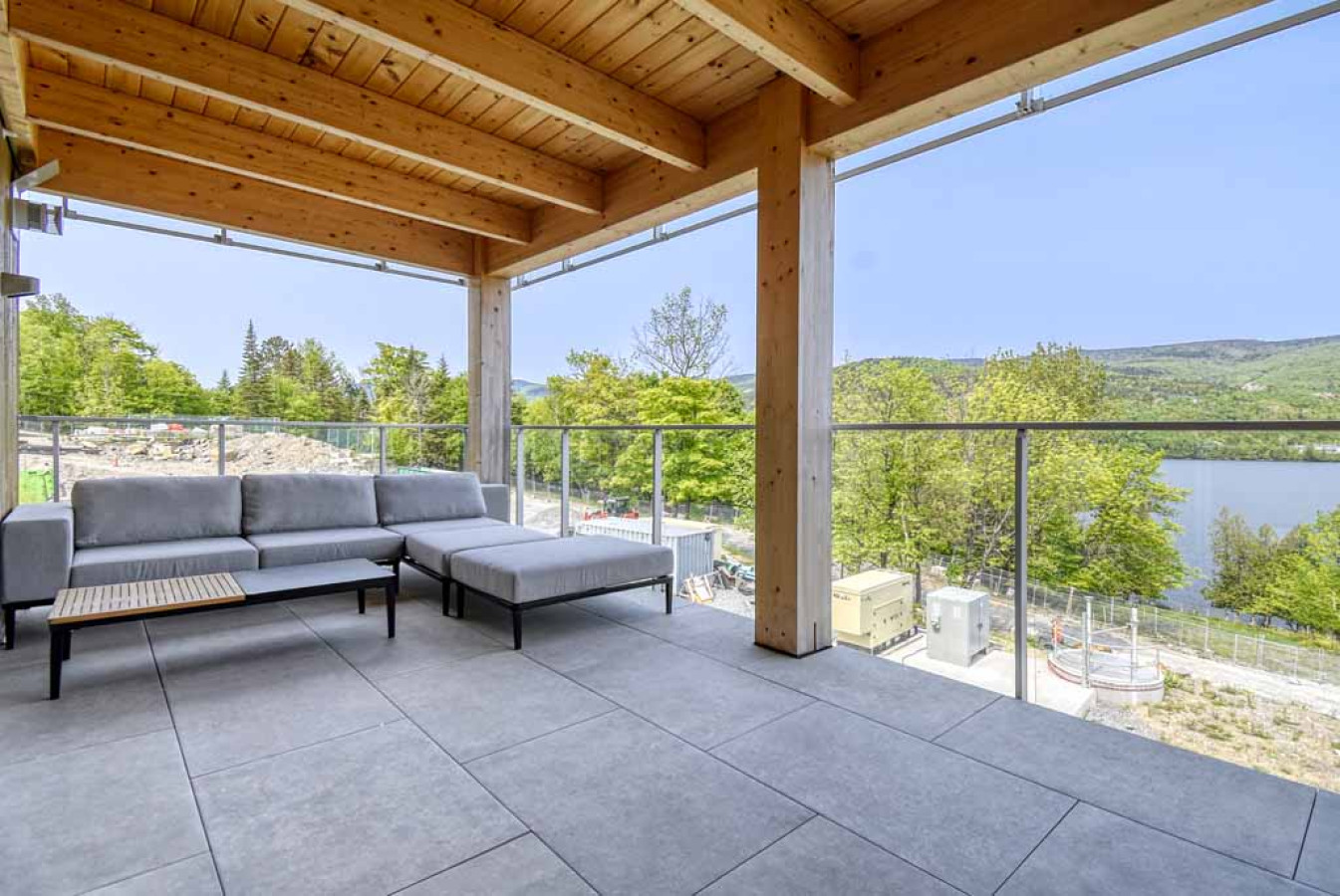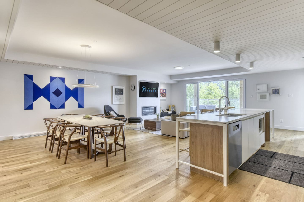 This condo embraces a minimalistic, clean, modern style while maintaining a practical, cozy and welcoming feel. The open concept living space features a comfortable sofa and chairs facing the gas fireplace and Smart TV, as well as an outdoor private balcony featuring breathtaking views of Lac Tremblant and the Ski Hill. The space is stocked with ample games for couples or families with children to enjoy together. No matter the weather or season, you’ll find an area to gather and relax in our lakeside home after a long day of skiing or exploring the area.