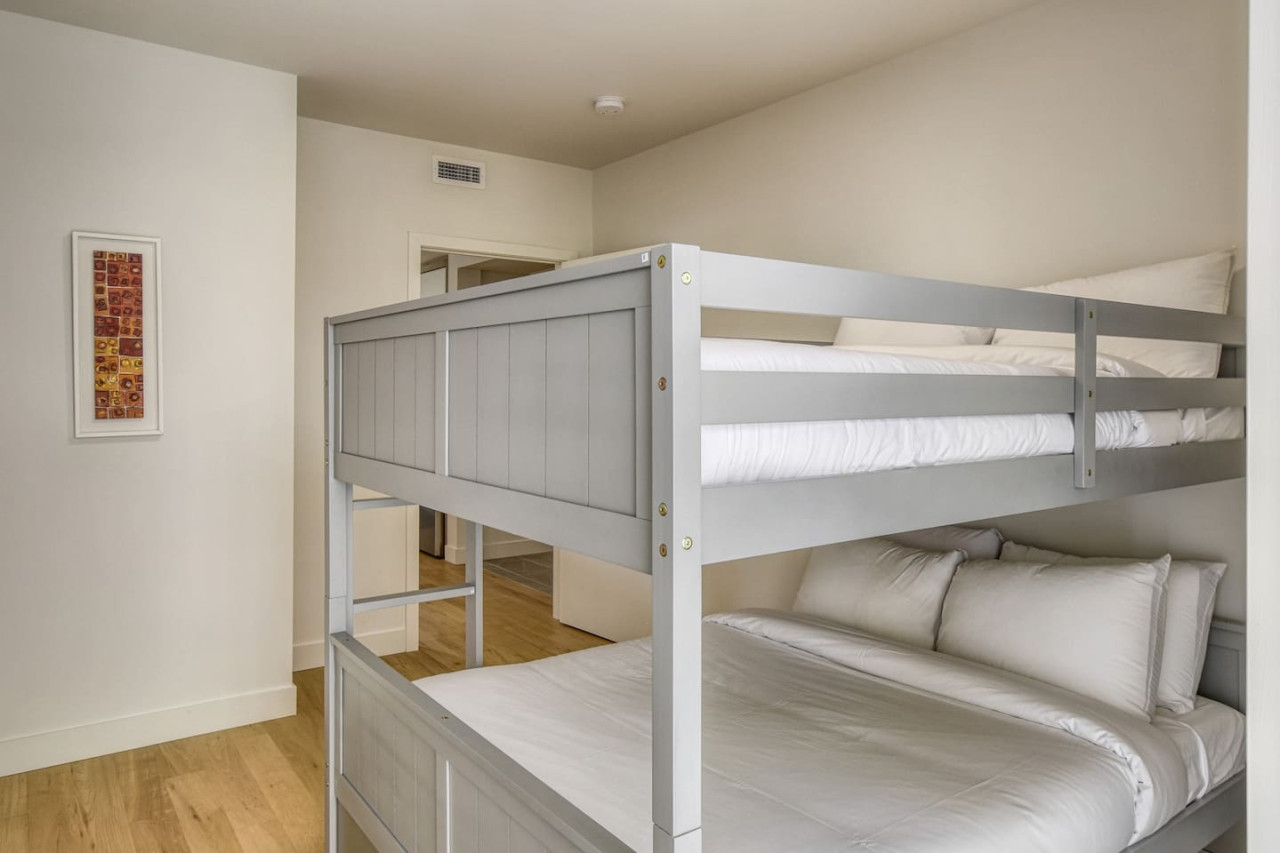 This home has 3 bedrooms. Bedroom #1 features a King size bed with lake and mountain views, and a private ensuite bathroom. Bedroom #2 includes a Queen size bed, and Bedroom #3 has a double bunk bed with a pull out Single trundle bed. Please note the single bed in the bed configuration portion of this listing is the trundle bed. The second full bathroom in this home is located near the entrance off of the living room.
