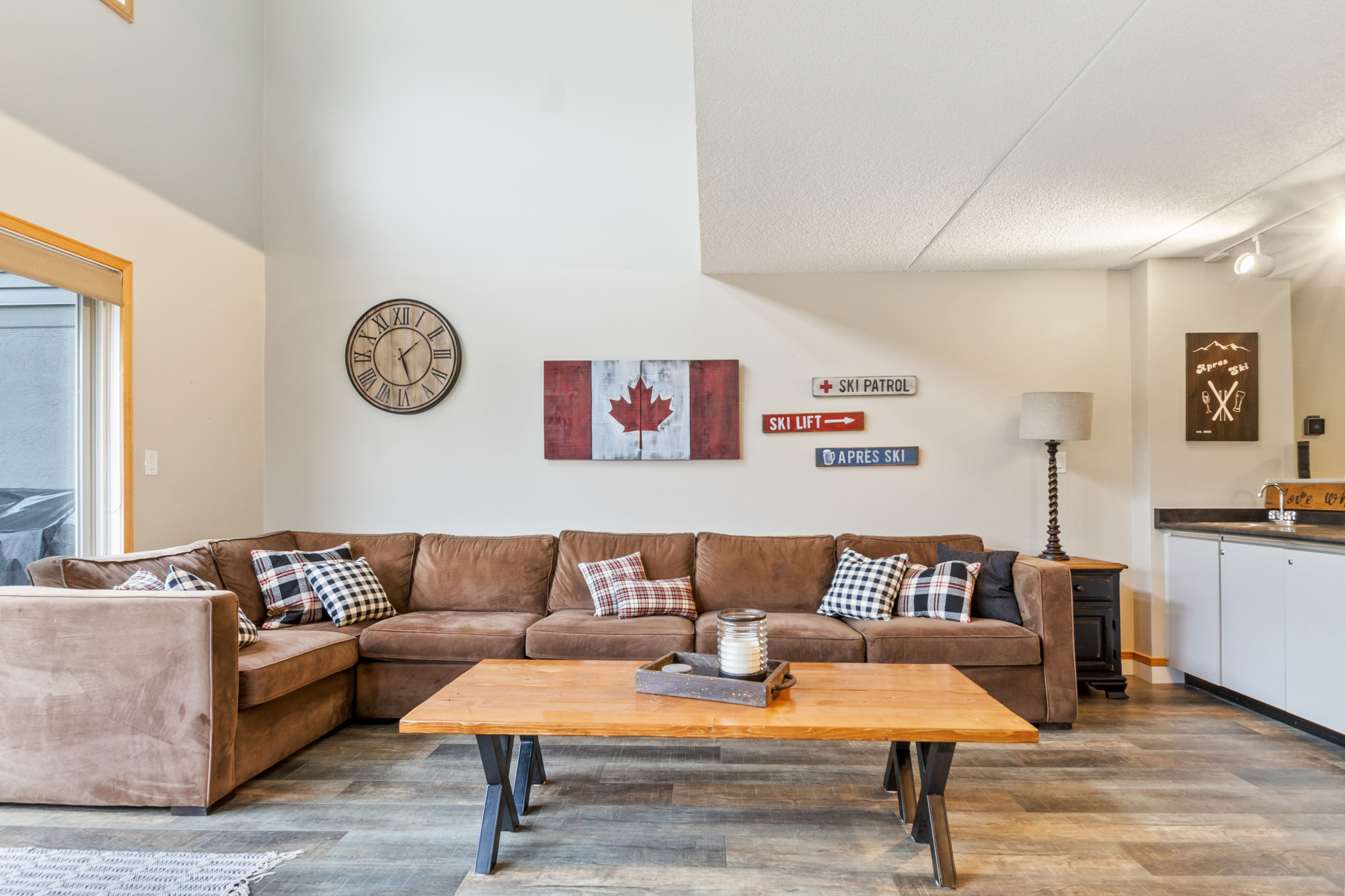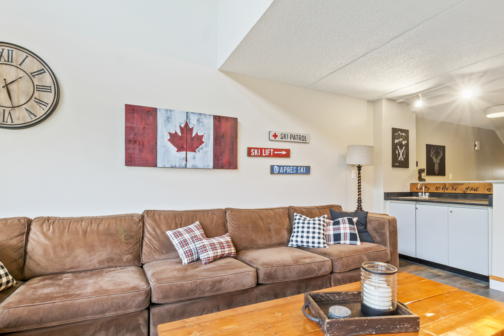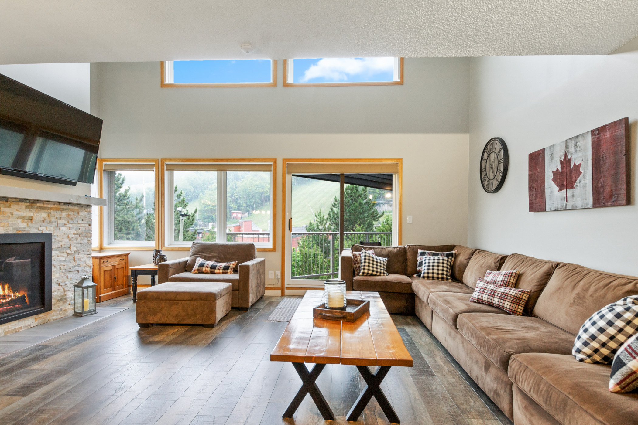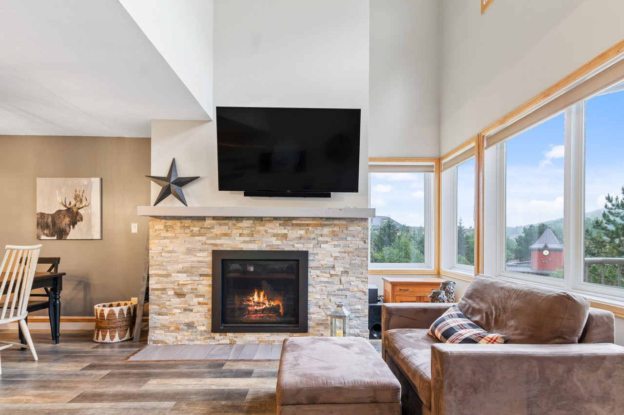 The living room area is bright and spacious with its high vaulted ceilings and large windows, enhanced by breathtaking views of the mountainside. Curl up and enjoy a movie or your favourite TV show on the large Smart TV while warming up in front of the electric fireplace. There is lots of space in this living room for entertainment and to gather around with your group. Kindly note, the wifi at this unit is not strong.