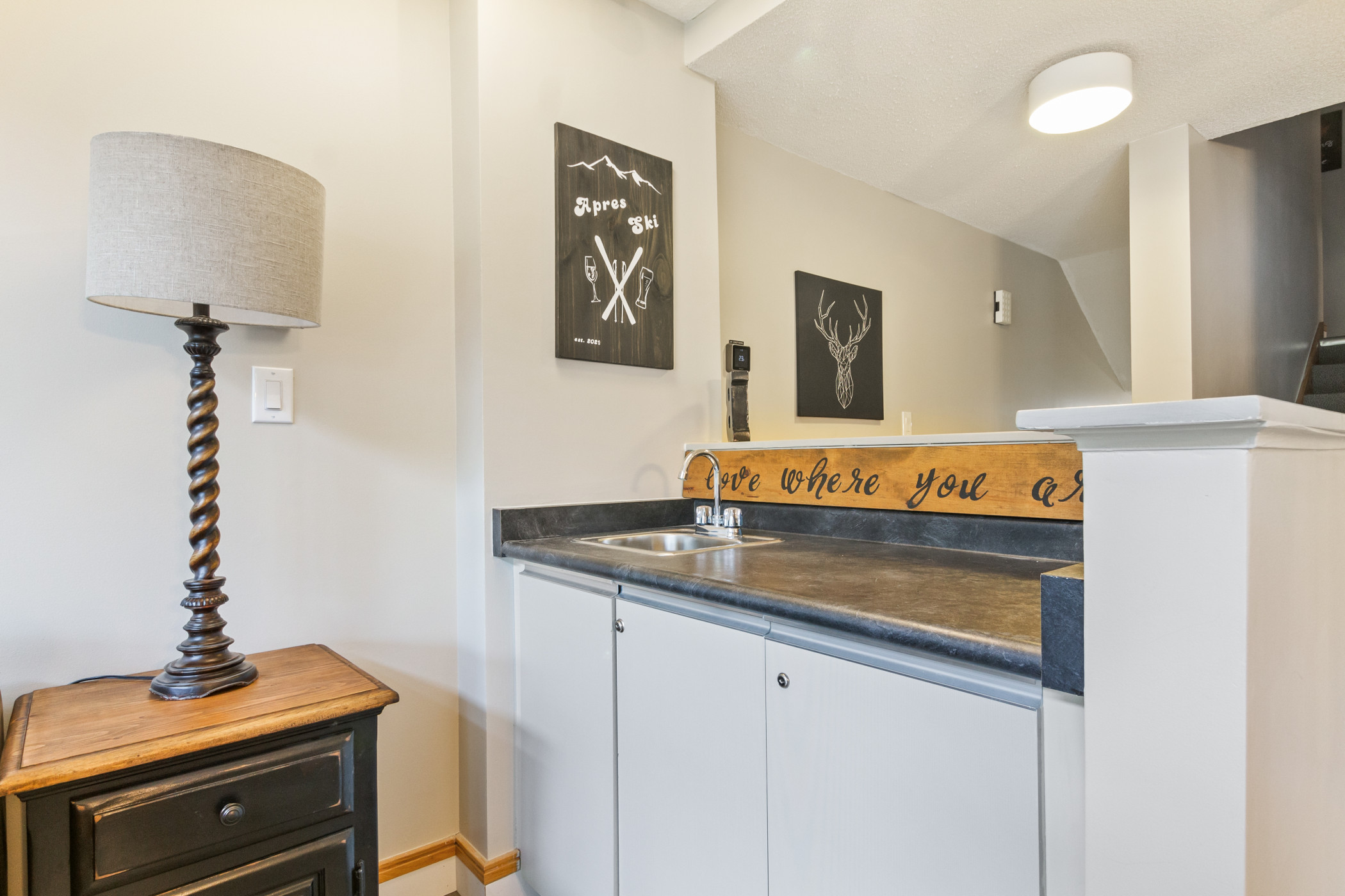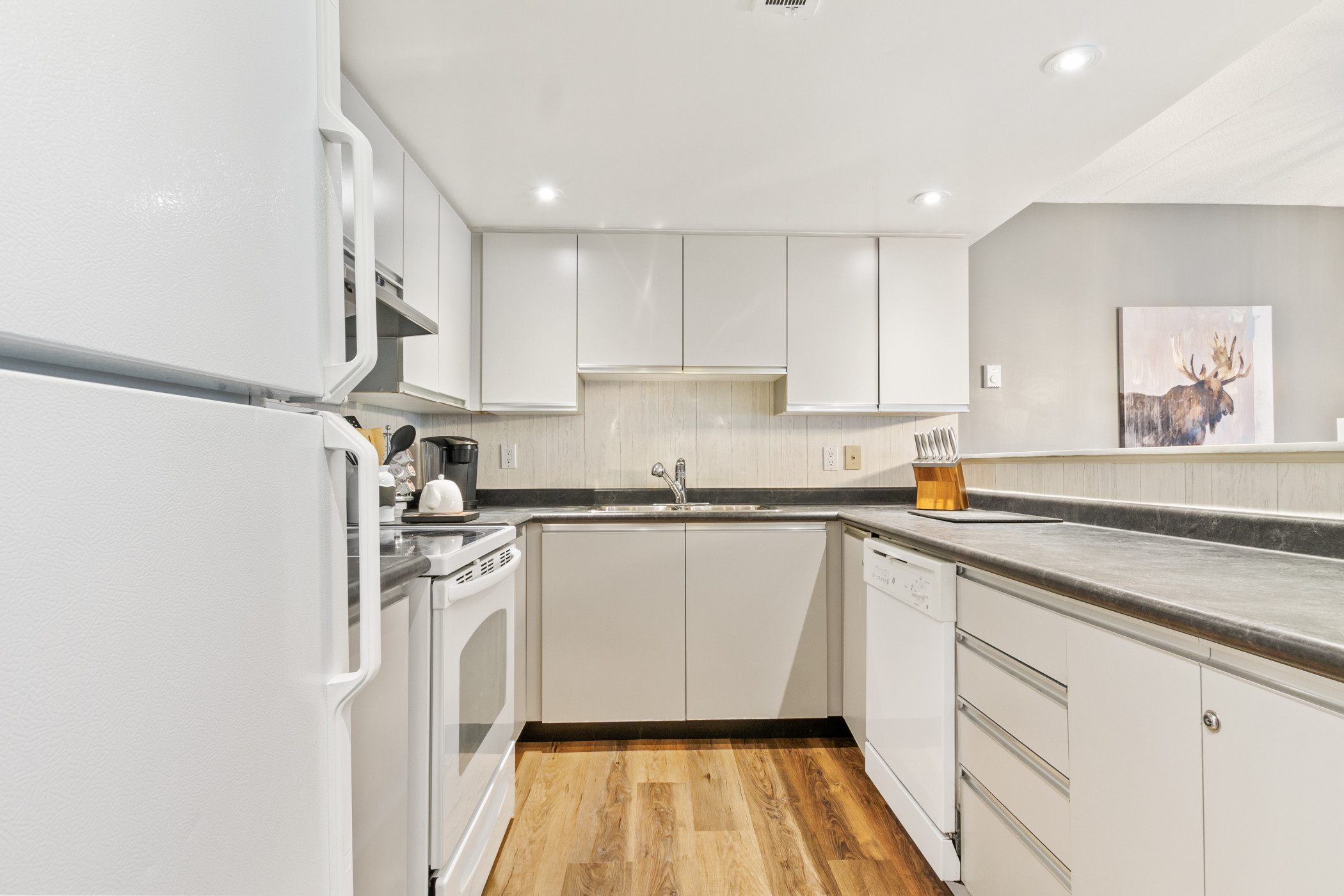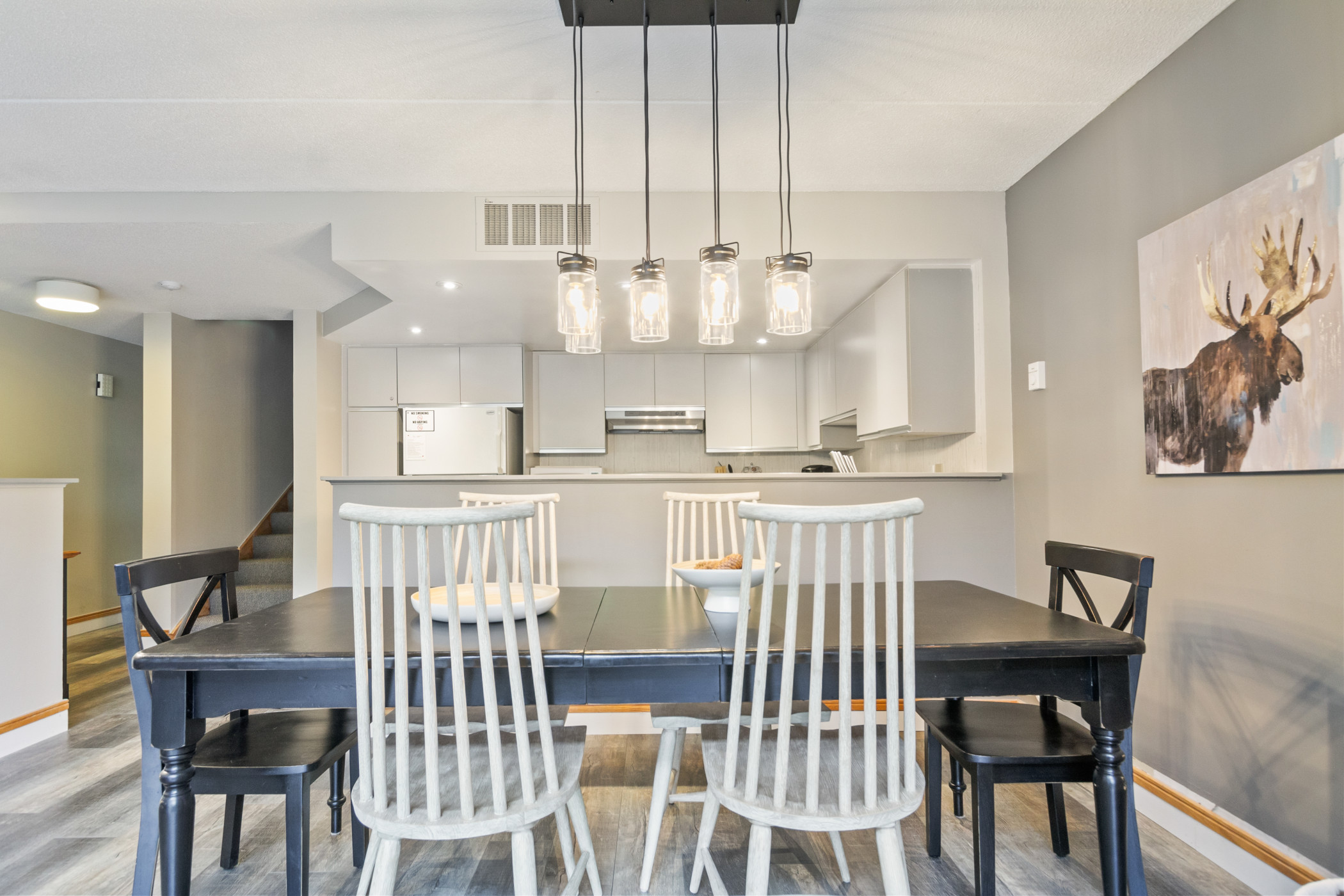 The living room area is bright and spacious with its high vaulted ceilings and large windows, enhanced by breathtaking views of the mountainside. Curl up and enjoy a movie or your favourite TV show on the large Smart TV while warming up in front of the electric fireplace. There is lots of space in this living room for entertainment and to gather around with your group. Kindly note, the wifi at this unit is not strong.