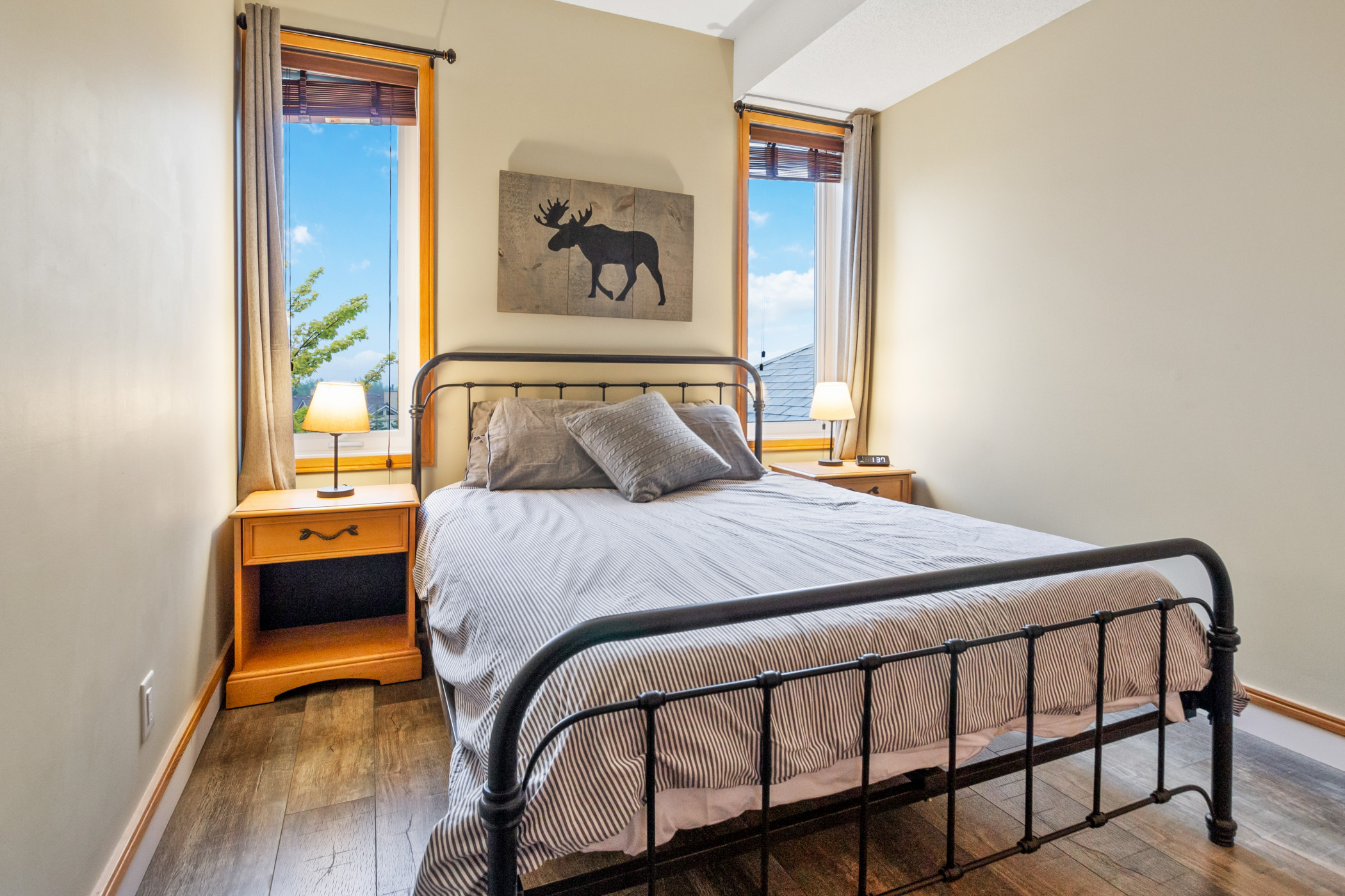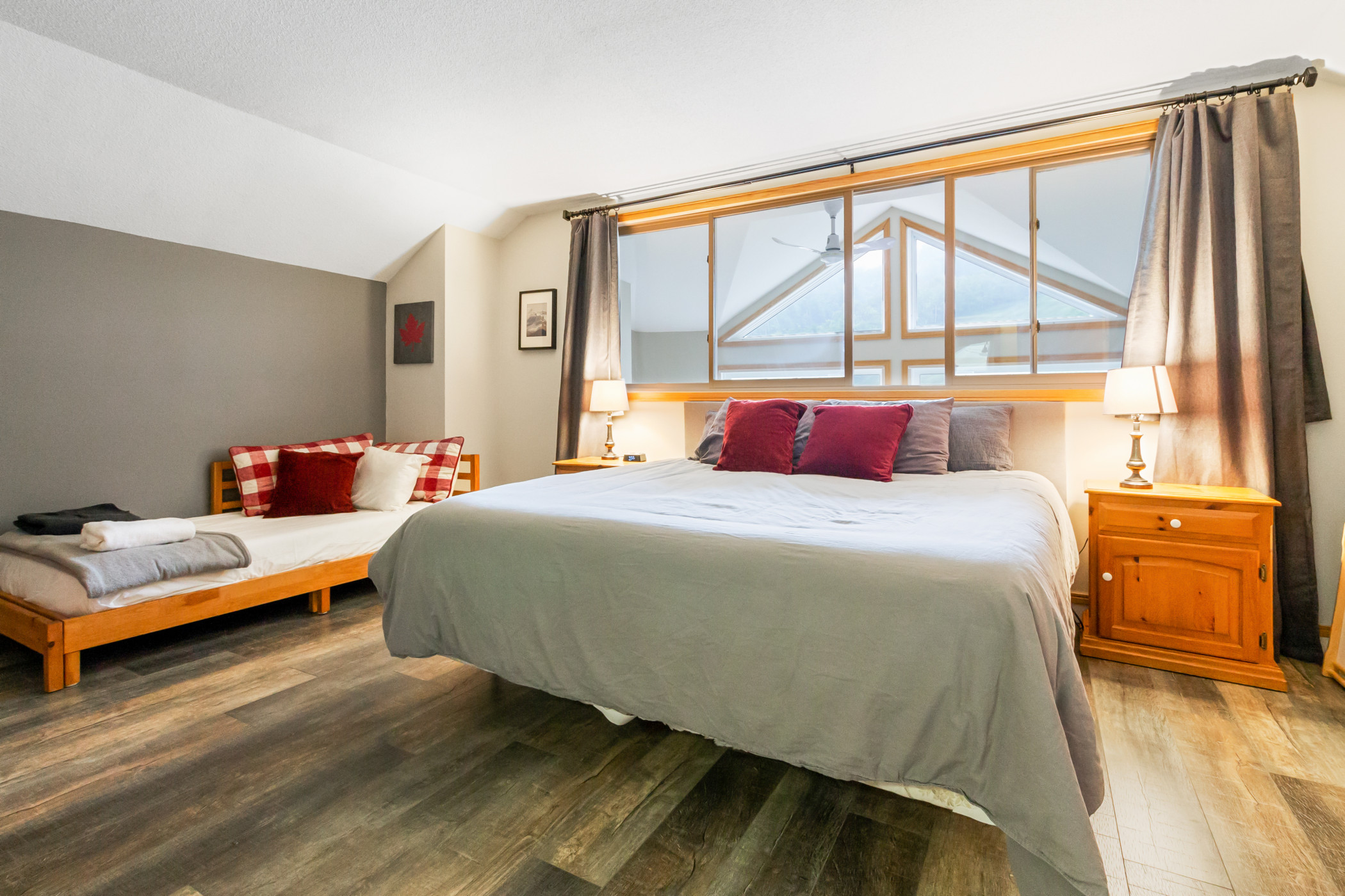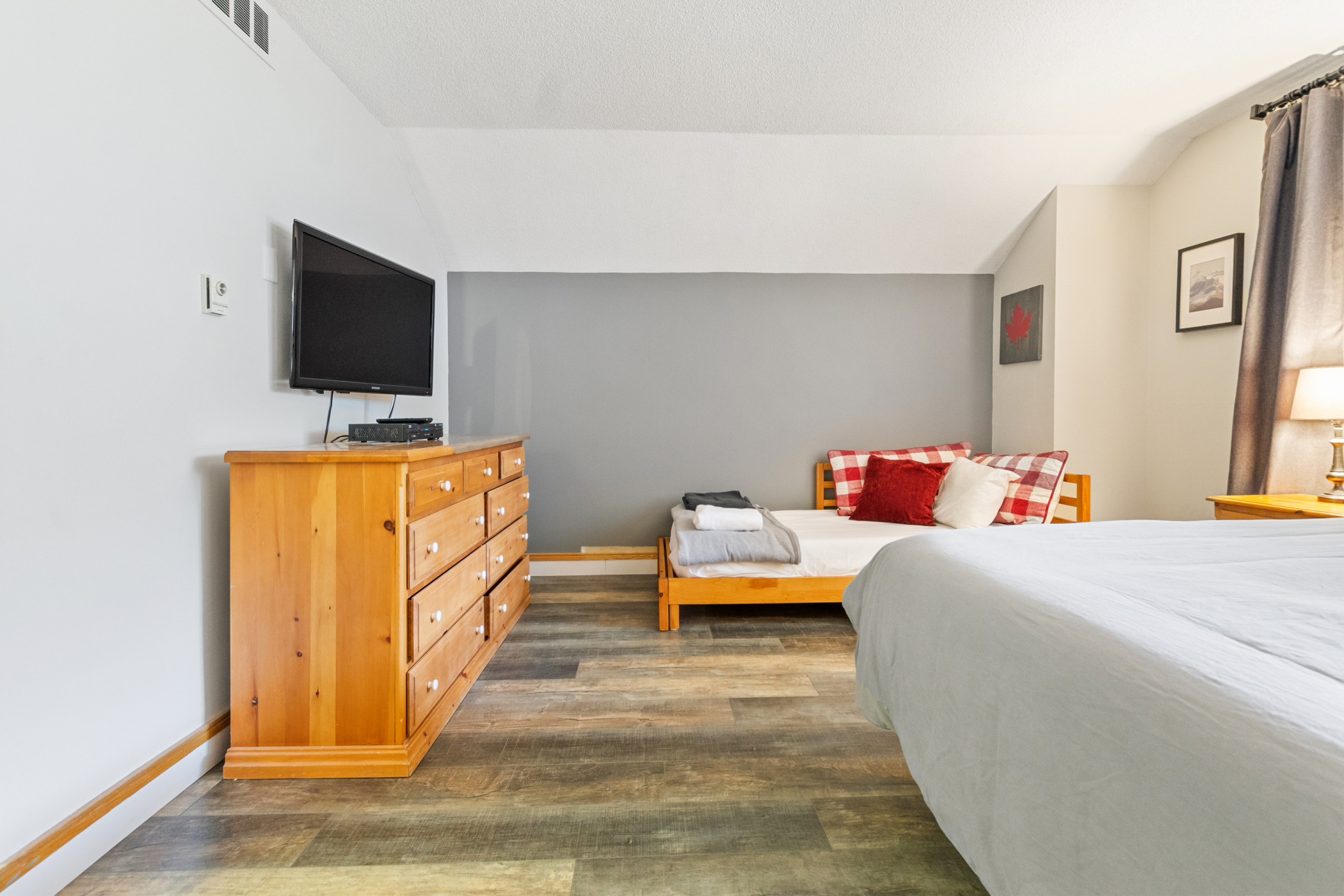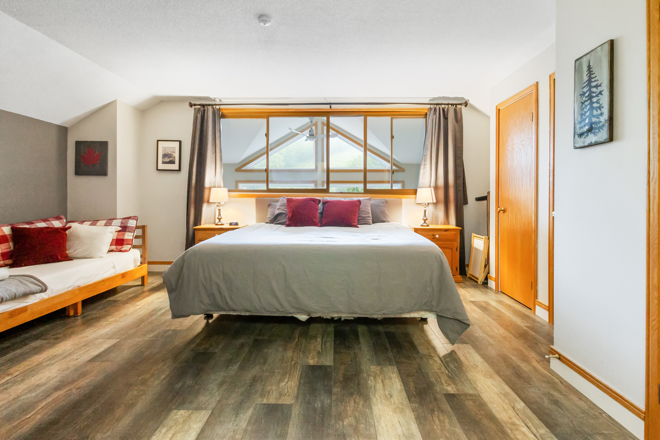The living room area is bright and spacious with its high vaulted ceilings and large windows, enhanced by breathtaking views of the mountainside. Curl up and enjoy a movie or your favourite TV show on the large Smart TV while warming up in front of the electric fireplace. There is lots of space in this living room for entertainment and to gather around with your group. Kindly note, the wifi at this unit is not strong.