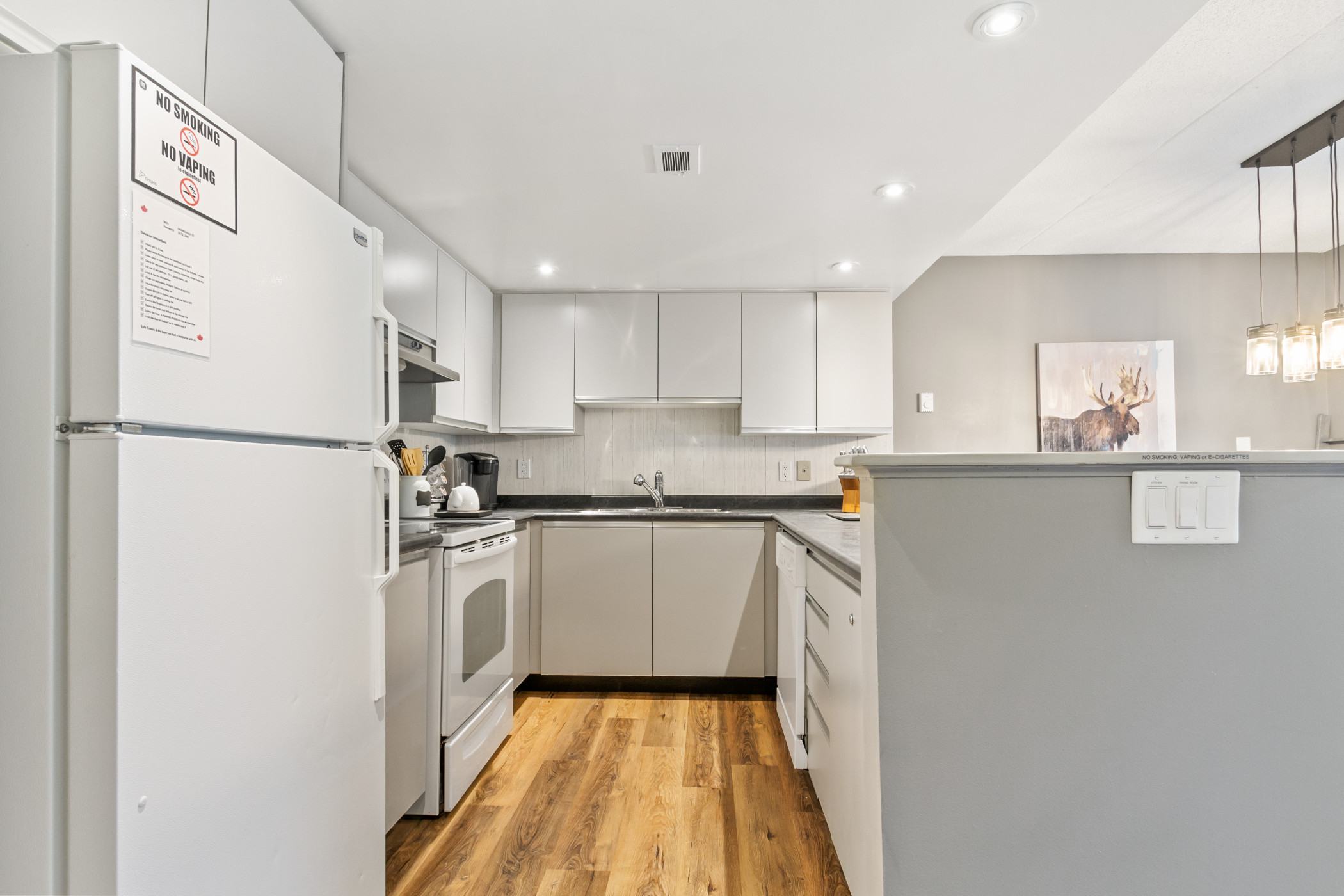 This kitchen offers all of the amenities needed for cooking and entertaining. The open concept kitchen, dining area, and living room are centered with access to the balcony with a BBQ. The fully equipped kitchen contains everything you need including all cookware, bakeware, cutlery, utensils and BBQ tools. A long wooden table in the dining area will provide plenty of seating for your group while dining and enjoying the company of loved ones. All you need to bring is your food and seasonings!