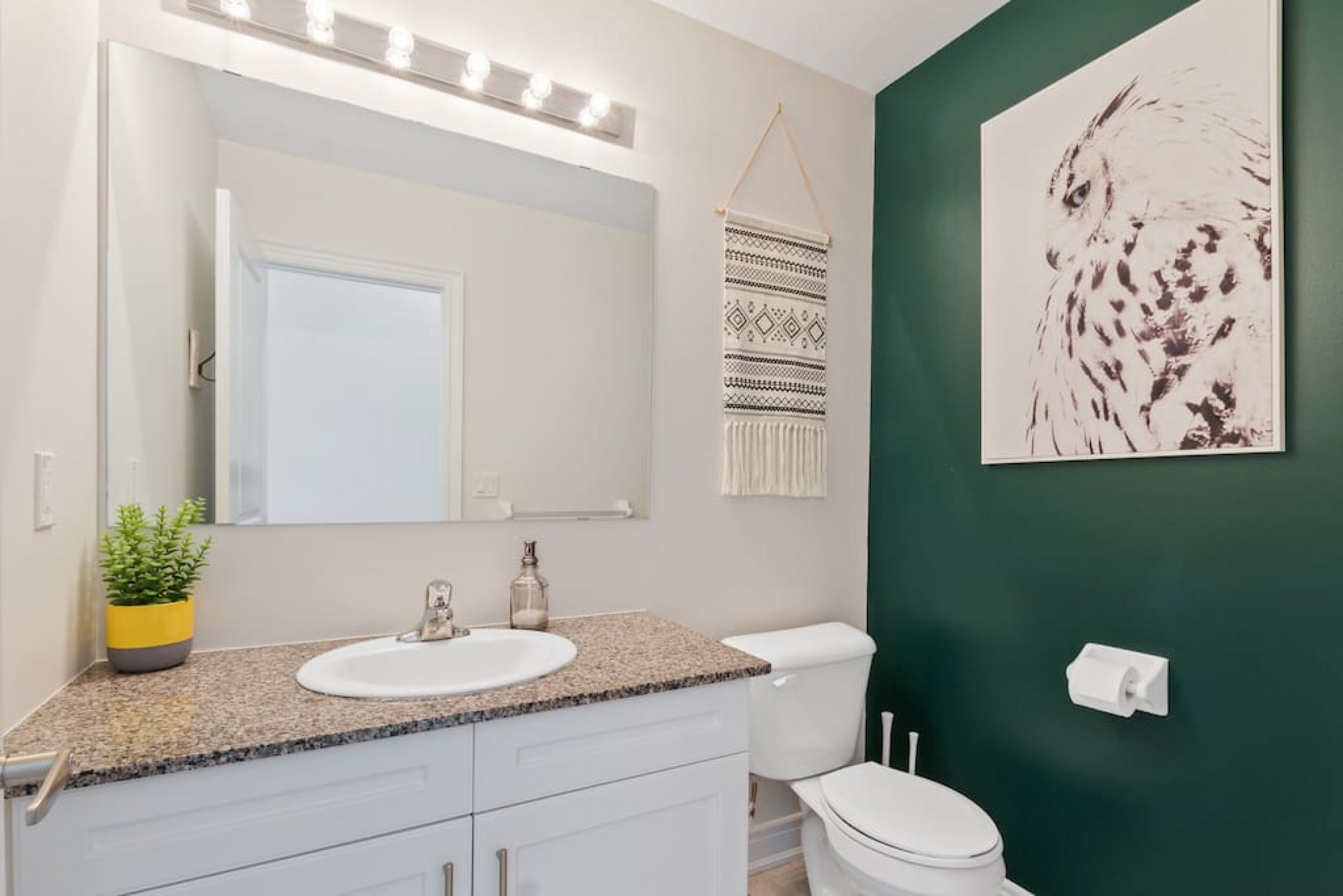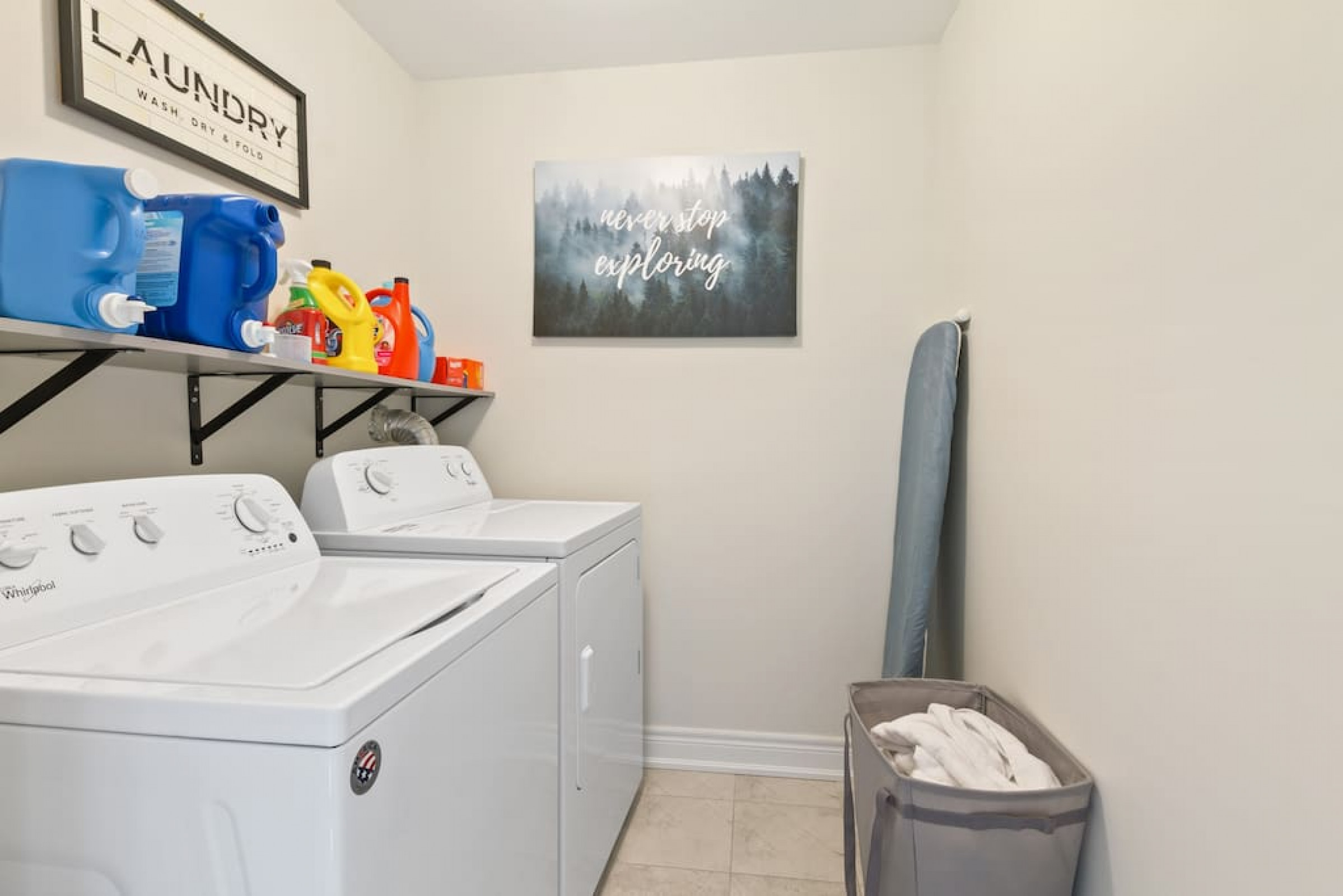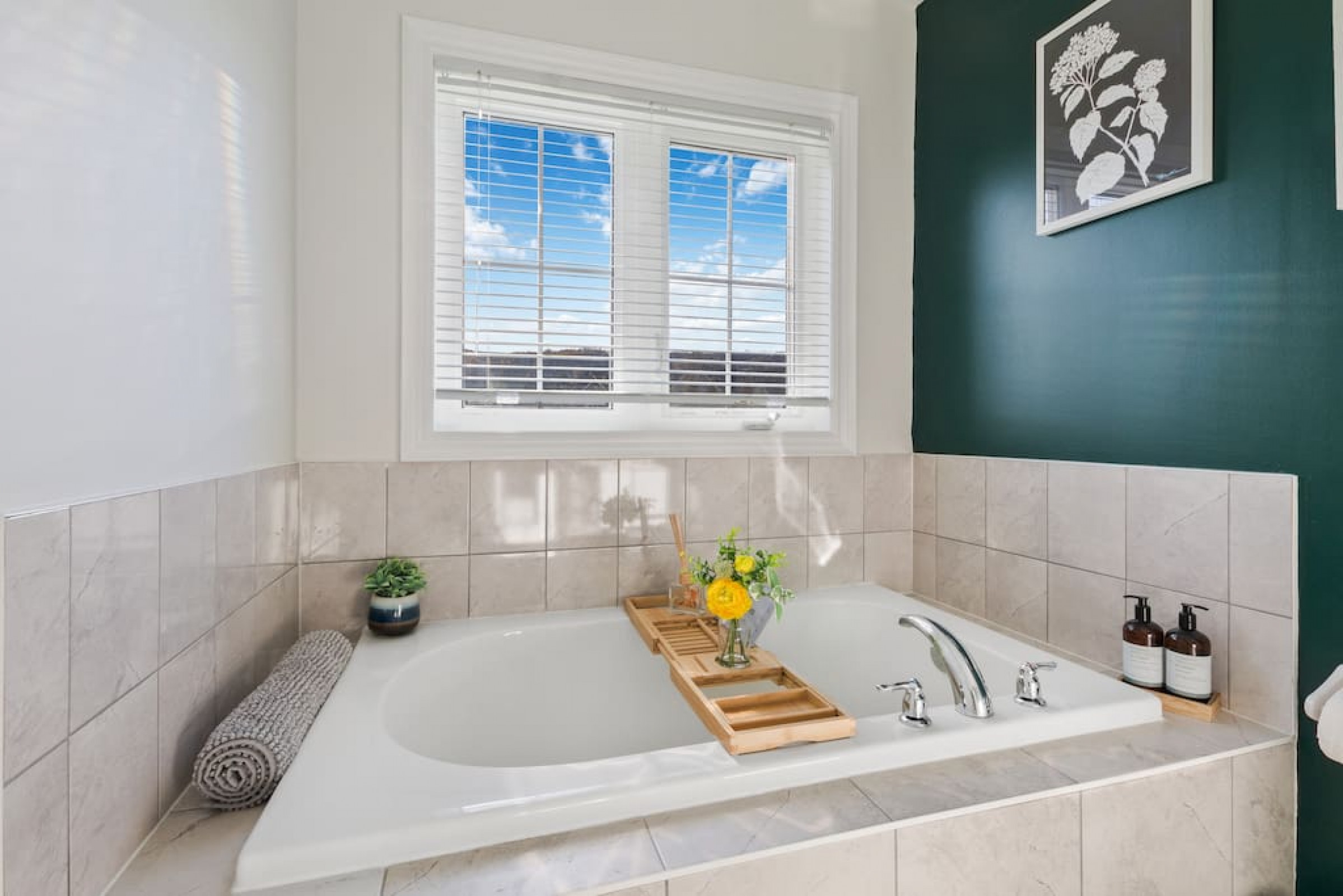 Make memories, enjoy conversation and quality time in the open concept great room with a big, comfy sectional sofa and a fireplace for a cozy experience. There's even a premium double futon for extra lounging. The curated design touches and plenty of natural light make this a refreshing place to gather and enjoy the provided board games and TV. When you would like to enjoy the fresh air, step outside the sliding glass doors to the backyard and enjoy a BBQ surrounded by trees and greenery in the Blue Mountain breeze. There's even a big box of outdoor toys to enjoy!