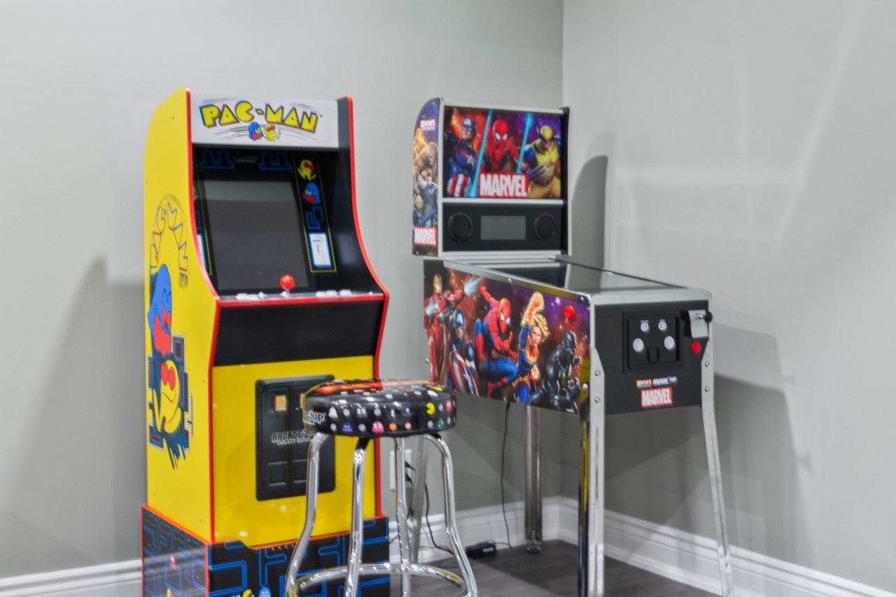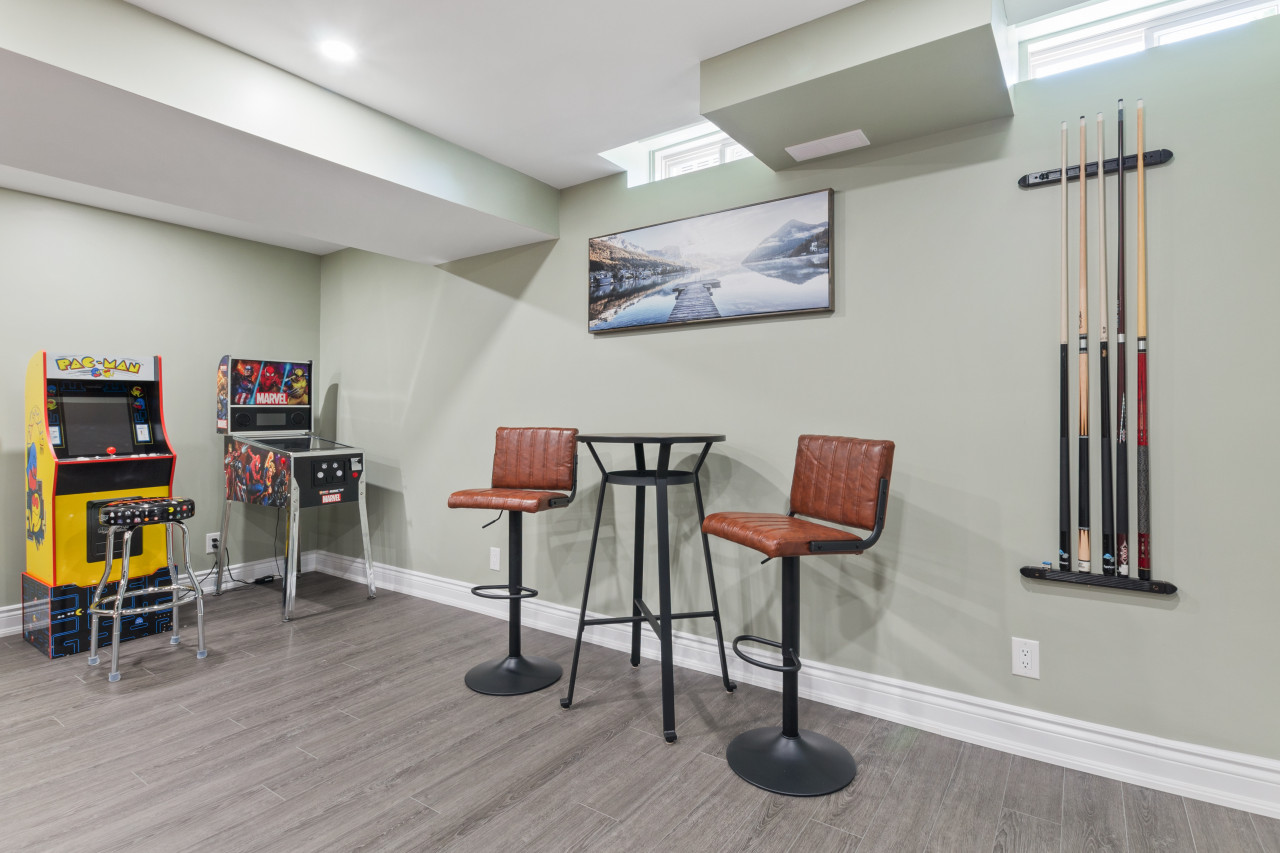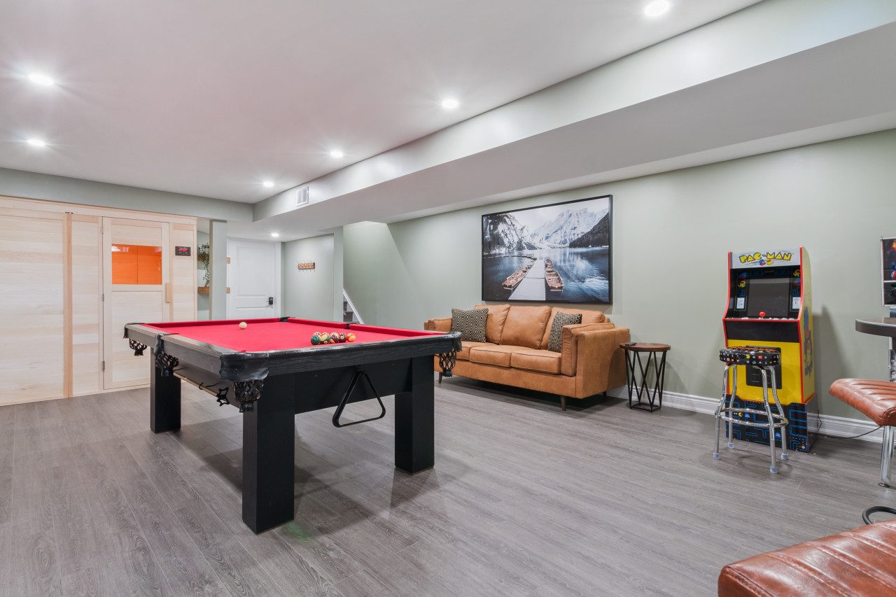 The premium feel of the space is evident throughout in the finishes and furnishings. Vintage skis and local-themed wall art, along with a tasteful palette of accent colours and lighting set the mood. This inviting ground level access unit welcomes guests with a covered entrance into the spacious foyer with a nice bench to kick off your boots, along with plenty of closet space and a powder room in the front hall. After a day on the slopes or on the Links you can relax and unwind in the brand new lower level entertainment room while you watch a movie on the big TV. You'll have tons of fun playing arcade games such as Pacman and Pinball, and enjoying the full size Dufferin Games pool table. Recharge and breathe deeply in the brand new infrared Sauna Ray all basswood sauna and enjoy the regenerative health benefits. A laundry room is available for your convenience, and wi-fi keeps you as connected as you choose to be to social media, news and Netflix.