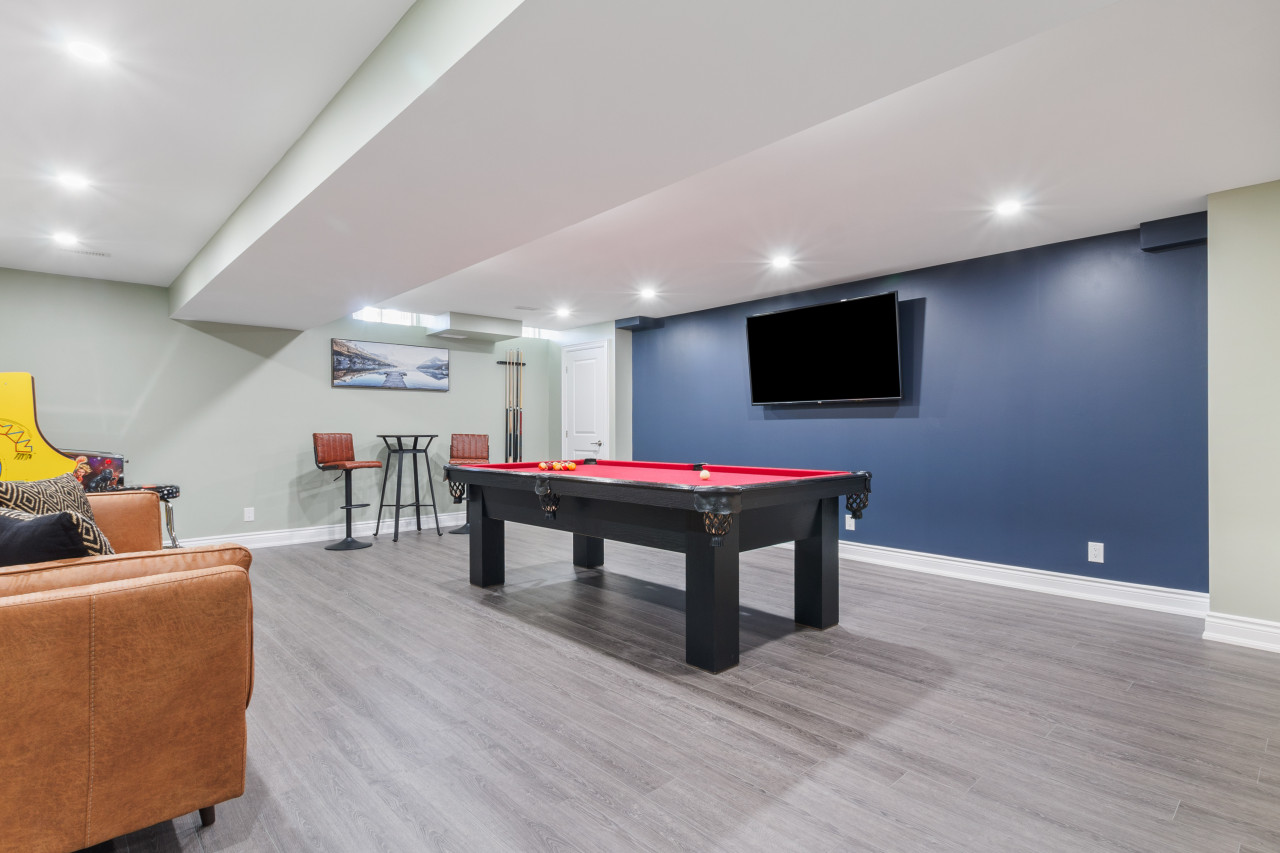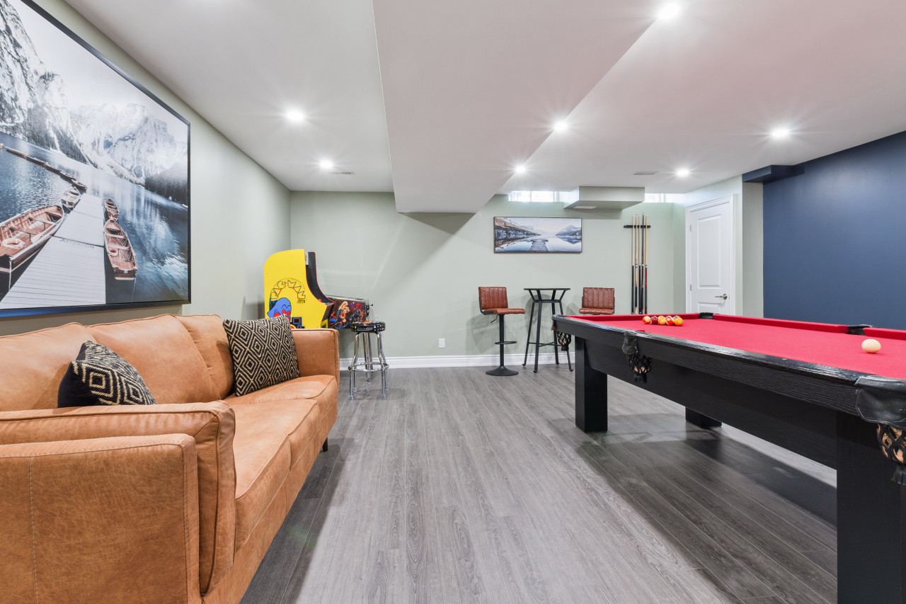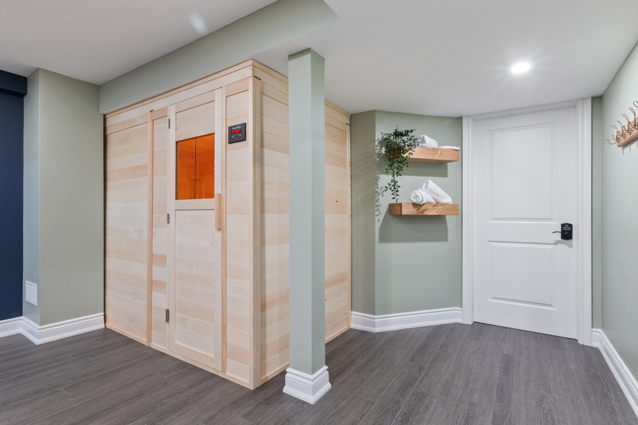 The premium feel of the space is evident throughout in the finishes and furnishings. Vintage skis and local-themed wall art, along with a tasteful palette of accent colours and lighting set the mood. This inviting ground level access unit welcomes guests with a covered entrance into the spacious foyer with a nice bench to kick off your boots, along with plenty of closet space and a powder room in the front hall. After a day on the slopes or on the Links you can relax and unwind in the brand new lower level entertainment room while you watch a movie on the big TV. You'll have tons of fun playing arcade games such as Pacman and Pinball, and enjoying the full size Dufferin Games pool table. Recharge and breathe deeply in the brand new infrared Sauna Ray all basswood sauna and enjoy the regenerative health benefits. A laundry room is available for your convenience, and wi-fi keeps you as connected as you choose to be to social media, news and Netflix.