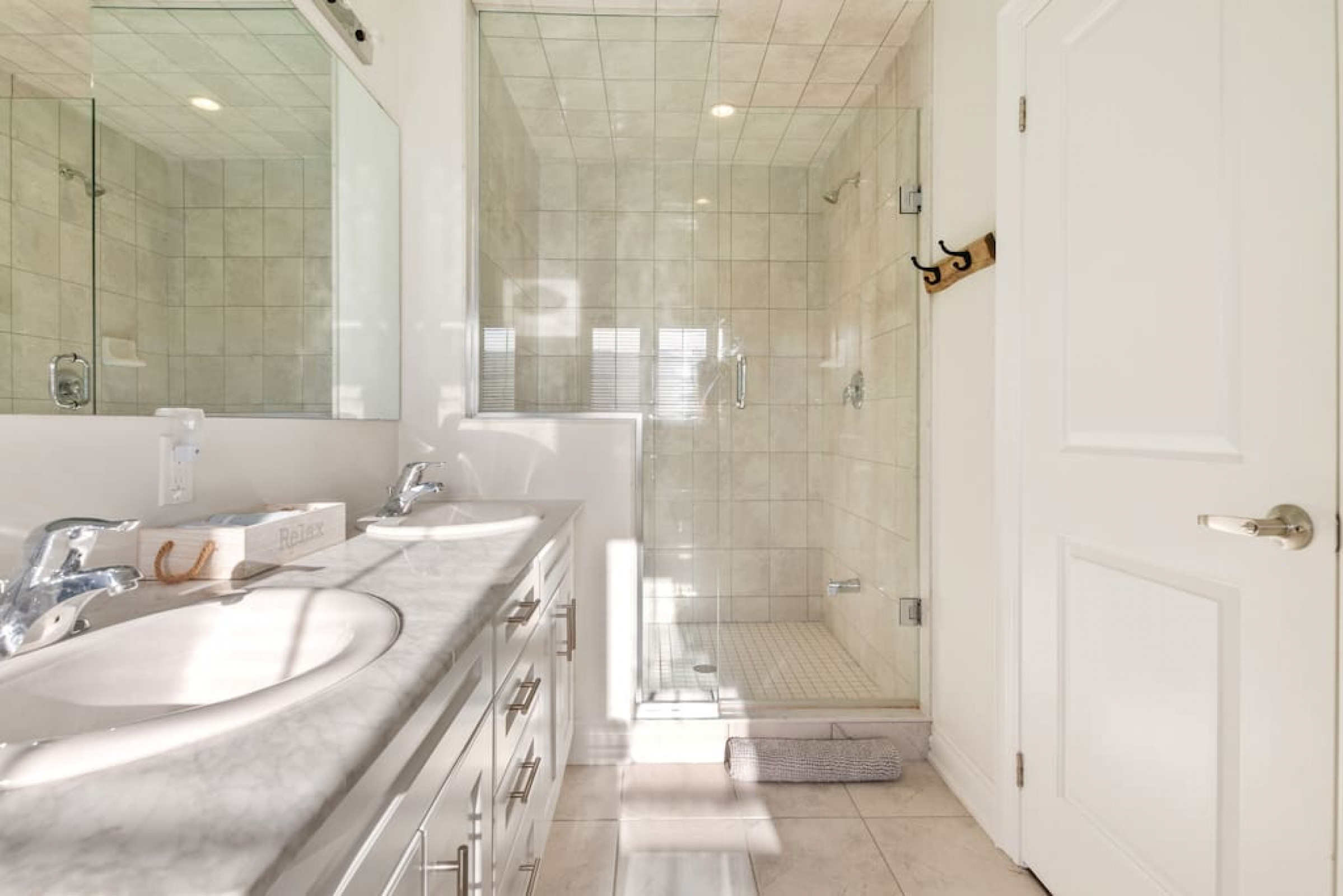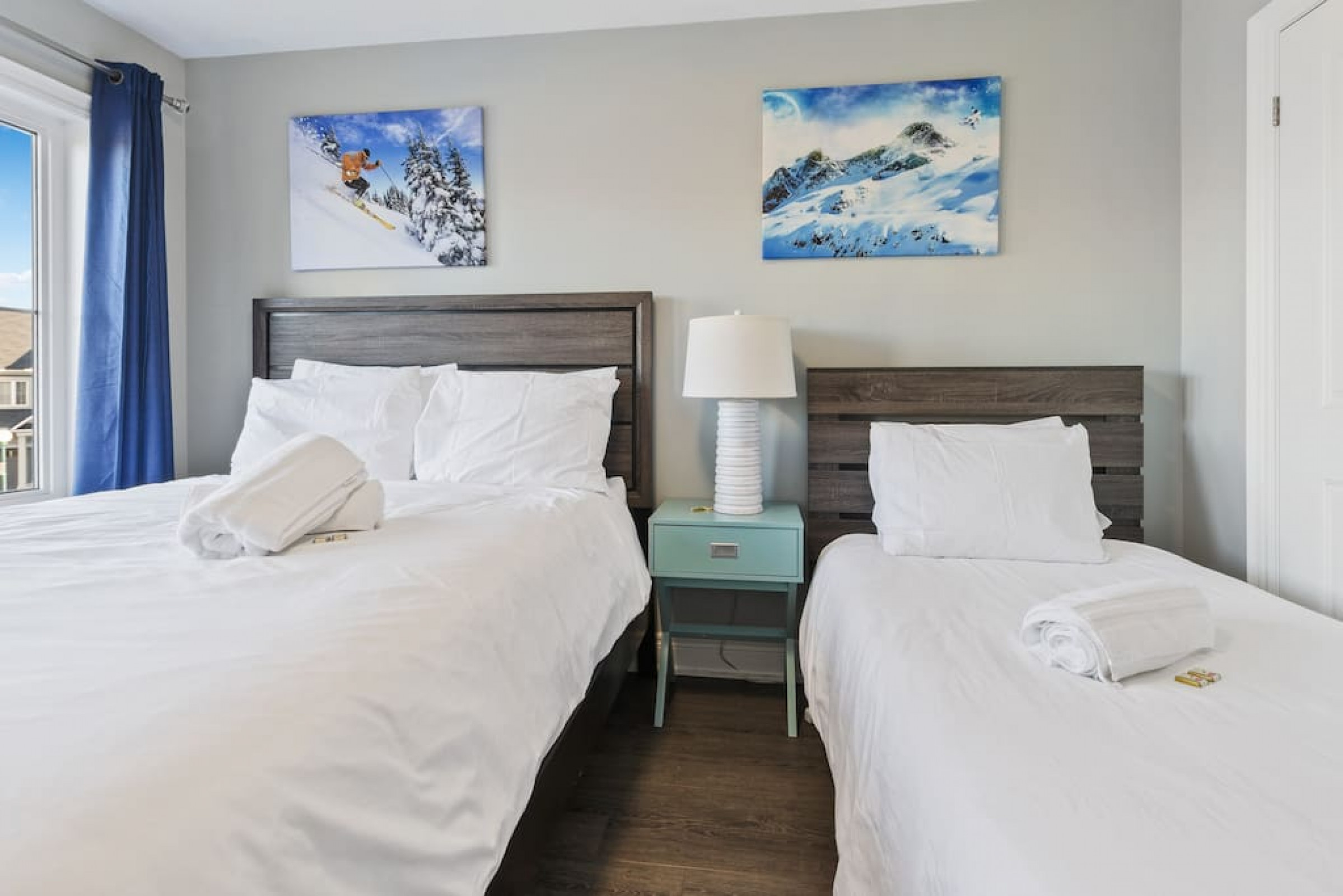 Each of the bedrooms feature crisp white linens, plenty of natural light and beautiful decor. Enjoy the luxury of the primary bedroom with its king size bed and large windows overlooking plenty of greenspace. The primary ensuite features a soaker tub as well as a modern shower and double vanity. The secondary bedroom features a queen and a single bed, and the third bedroom is complete with a queen. Just down the hall you will find a full bathroom, stand up shower with glass partition, and a side by side vanity. A double futon is available in the living room.