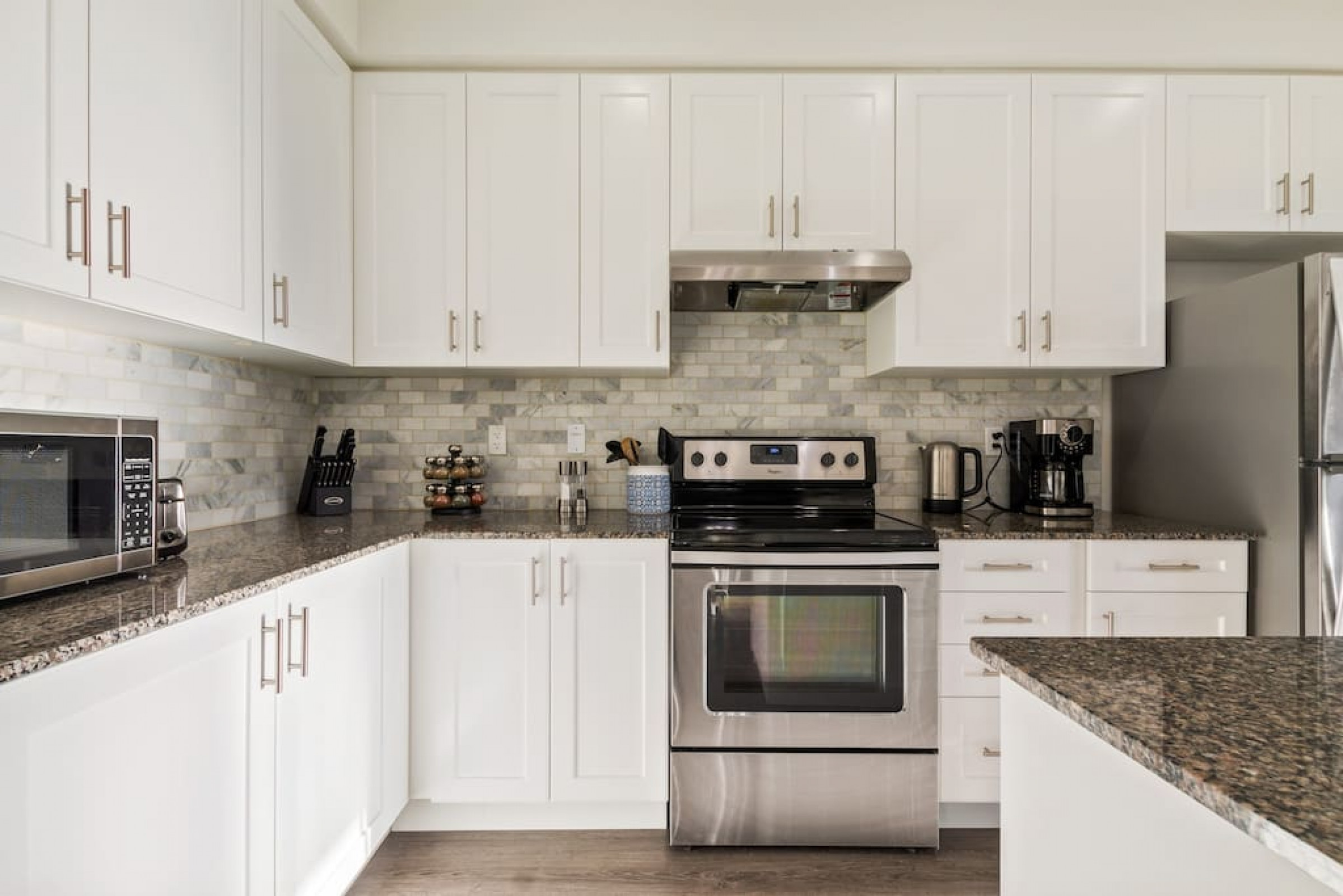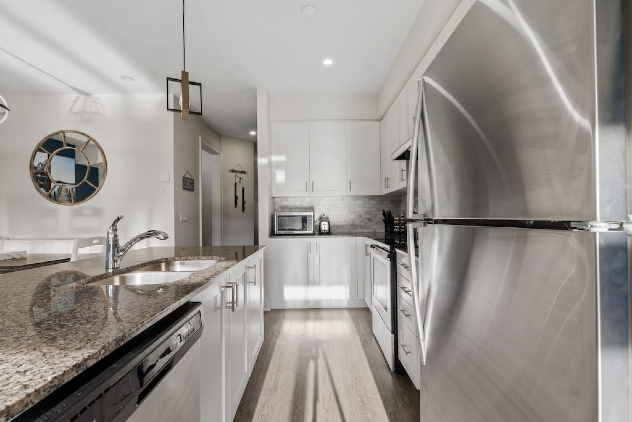 The bright, modern open concept kitchen features granite countertops and a spacious island to prepare and enjoy your meals, and is a great place for your morning coffee and casual breakfast. There is plenty of cupboard space for easy storage, and all of your cookware, bakeware, and utensils are provided. You’ll only have to bring your food, coffee, and spices. Modern stainless steel appliances include a fridge, stove, microwave, and dishwasher for easy cleanup. The kitchen overlooks the dining room with comfortable bench seating to enjoy your special meal.