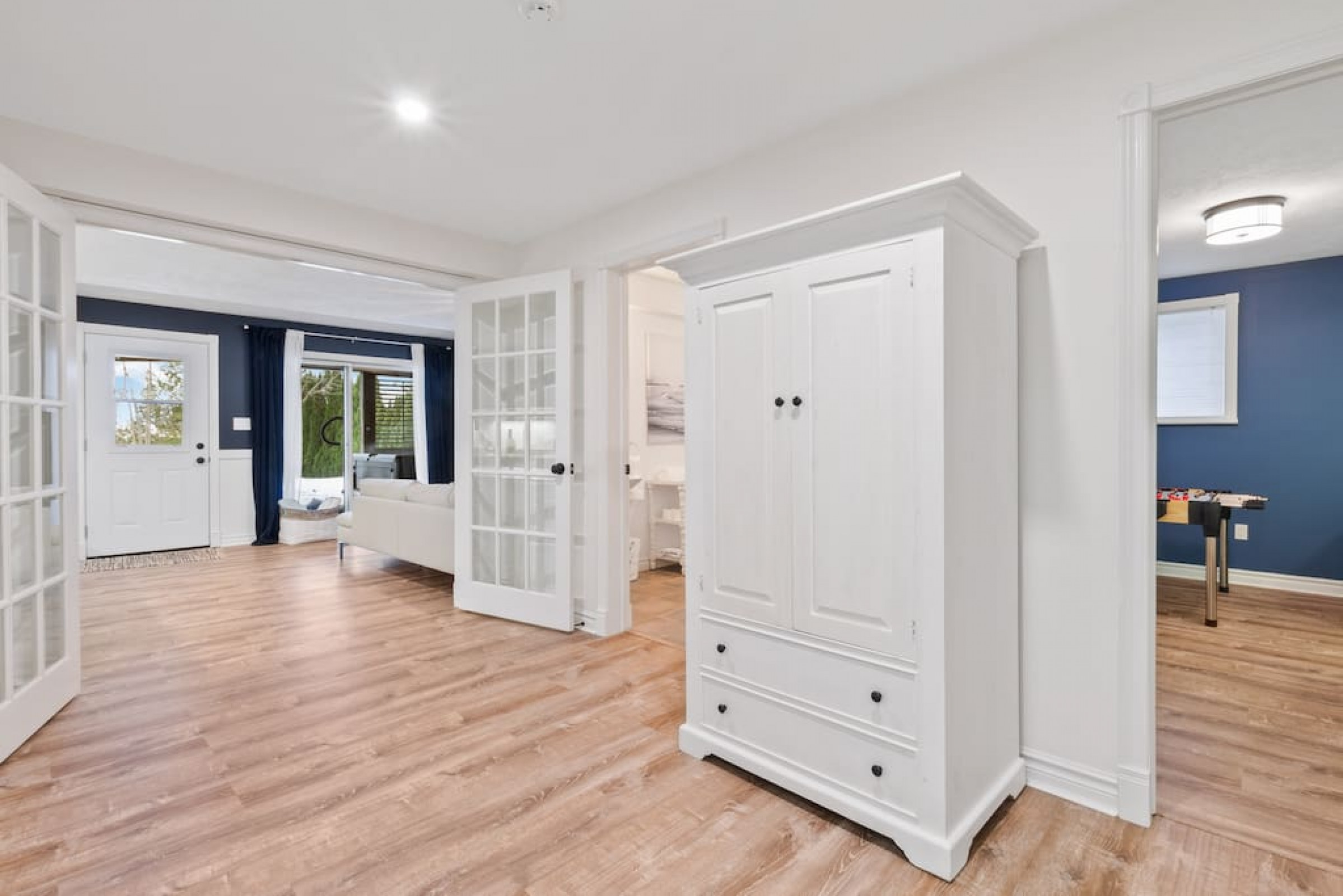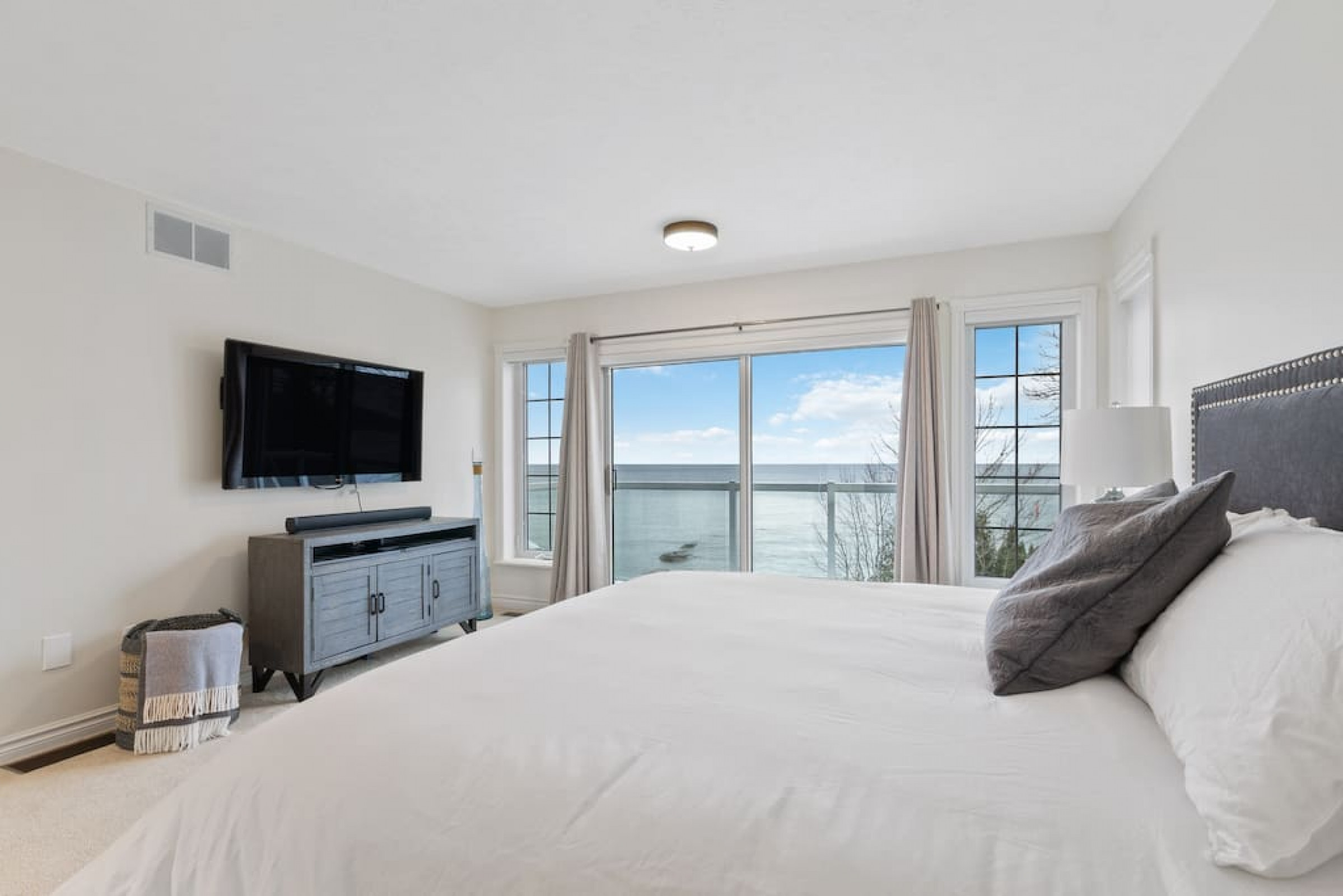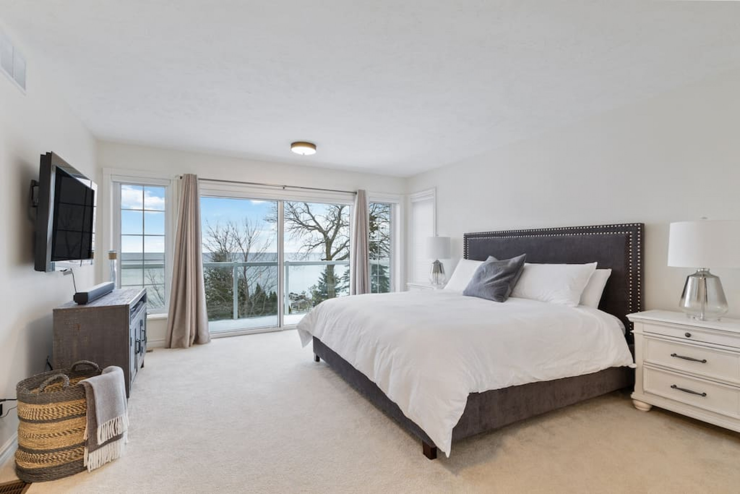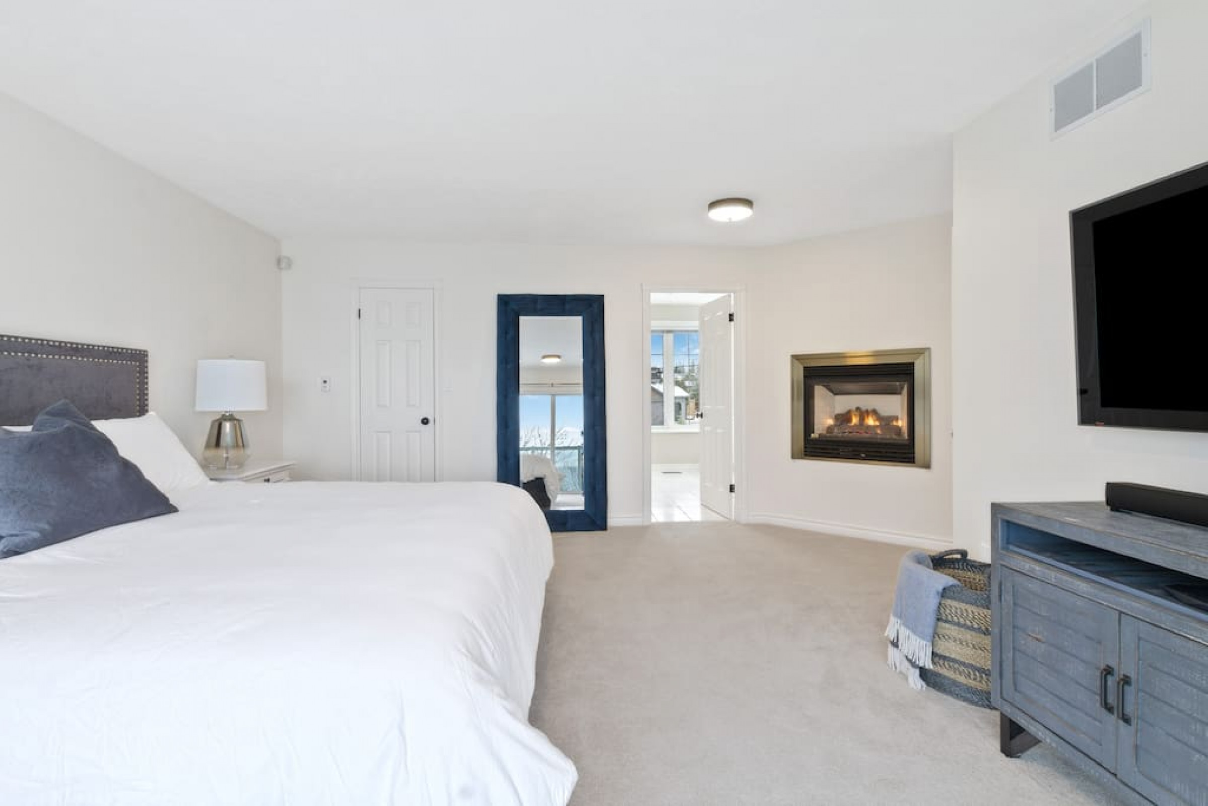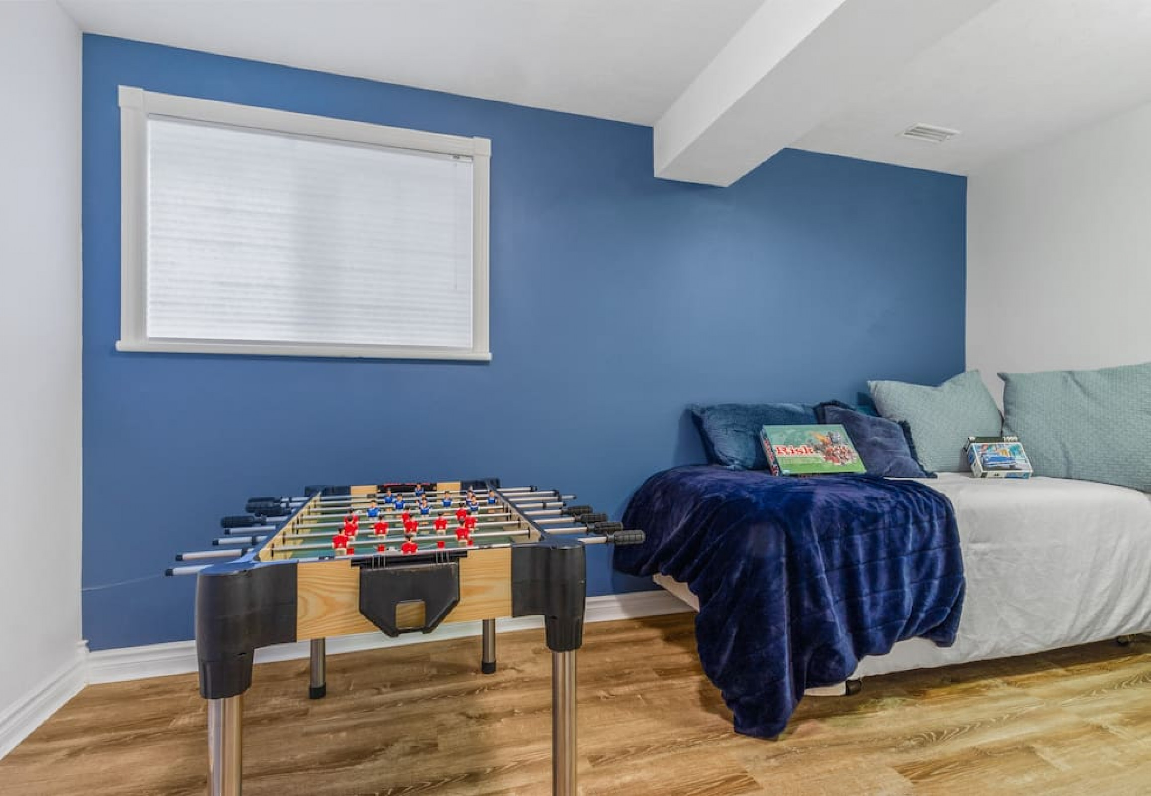 On the main floor, you'll find a spacious, beautifully decorated bedroom with an in-suite TV, just steps away from a 4-piece bathroom. Upstairs, there are two additional bedrooms and two four-piece bathrooms, both with direct water views to wake up to. There is a third bedroom upstairs that has been adapted to a dedicated work from home space with large desk and chair and bright sun from the large windows overlooking the street. The primary bedroom boasts a balcony with a small patio, a 4-piece ensuite with a jetted soaker tub, and a gas fireplace. In the basement, we have two day beds near the games room which is ideal for children.