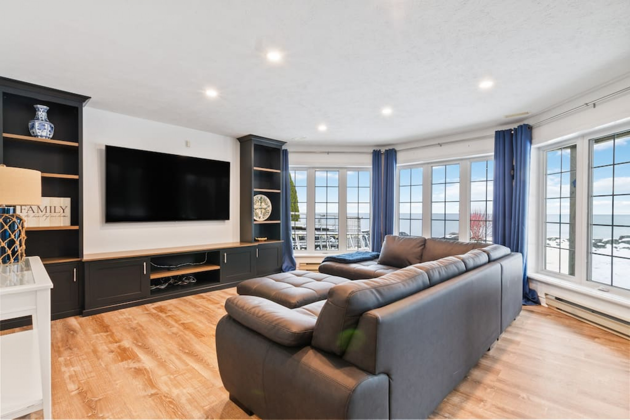 The main floor is home to the meticulously decorated great room, ideal for catching up after a day of adventure or relaxing by the fire as you unwind. It opens up to the wrap-around deck, offering water views or entertainment on the TV. Downstairs, the media room awaits with a sizable L-shaped couch, a large TV, and surround sound for your enjoyment.